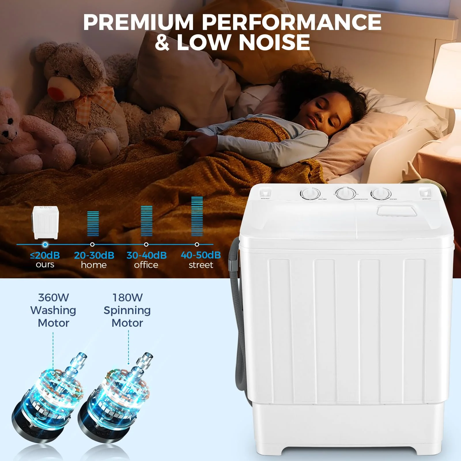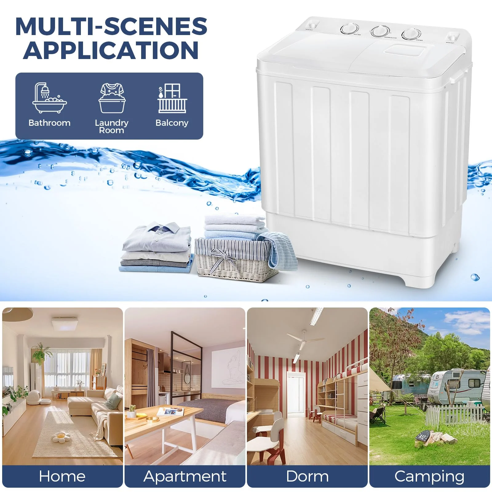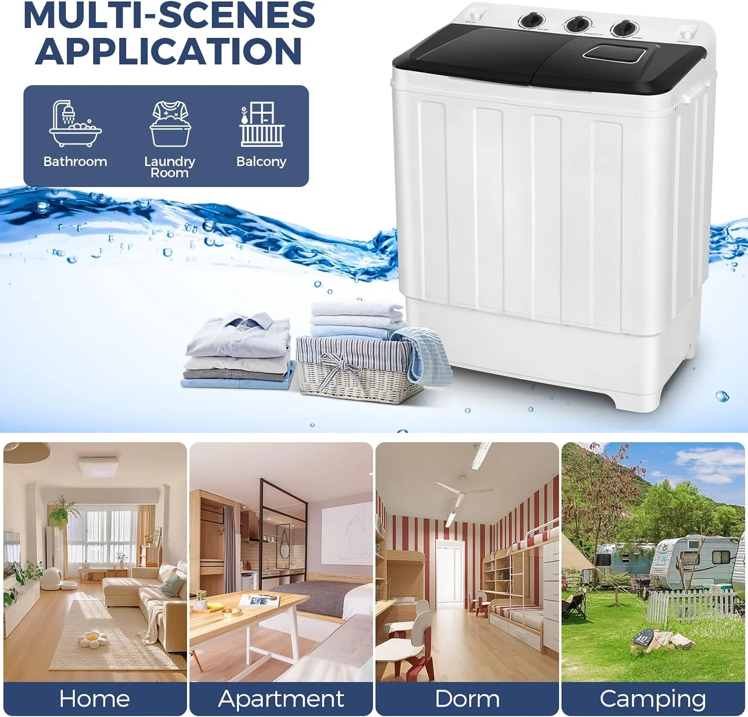 ??HIGH-QUALITY MOTOR: This portable washer machine has upgraded motor performance, 2000 rpm steady power ensures that your clothes are washed clean, and spin-drying ensures that 90% of the water is removed from your clothes. Our mini washing machine can achieve low consumption and water saving, save up to 84% energy consumption than similar models, save money for your family. Perfect for dorms, apartments, RVs, etc.
