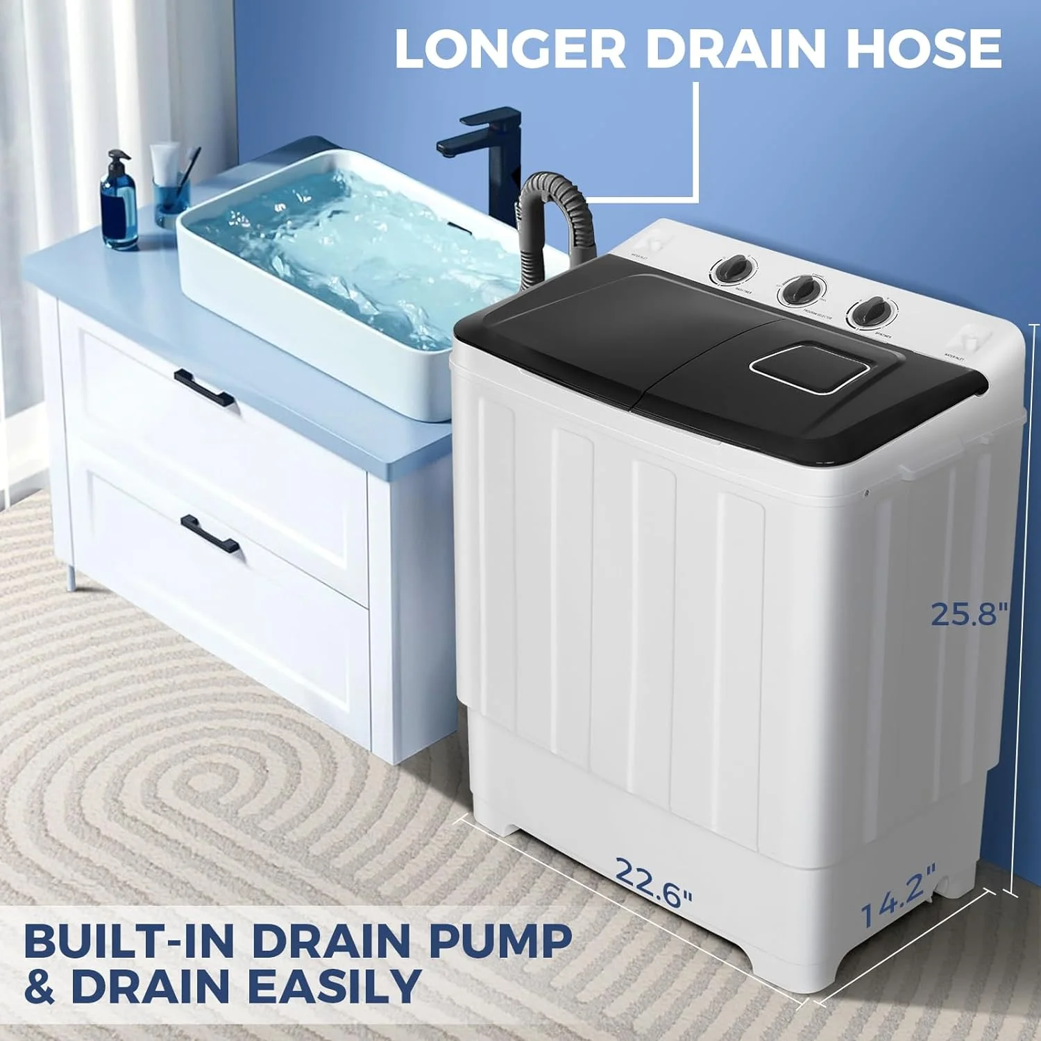 ??UPGRADED PUMP DRAINER: The washer machine features an upgraded pump drainer that drains more quickly than a traditional gravity drain, so you don't have to worry about draining even if your washer is located in a high place.