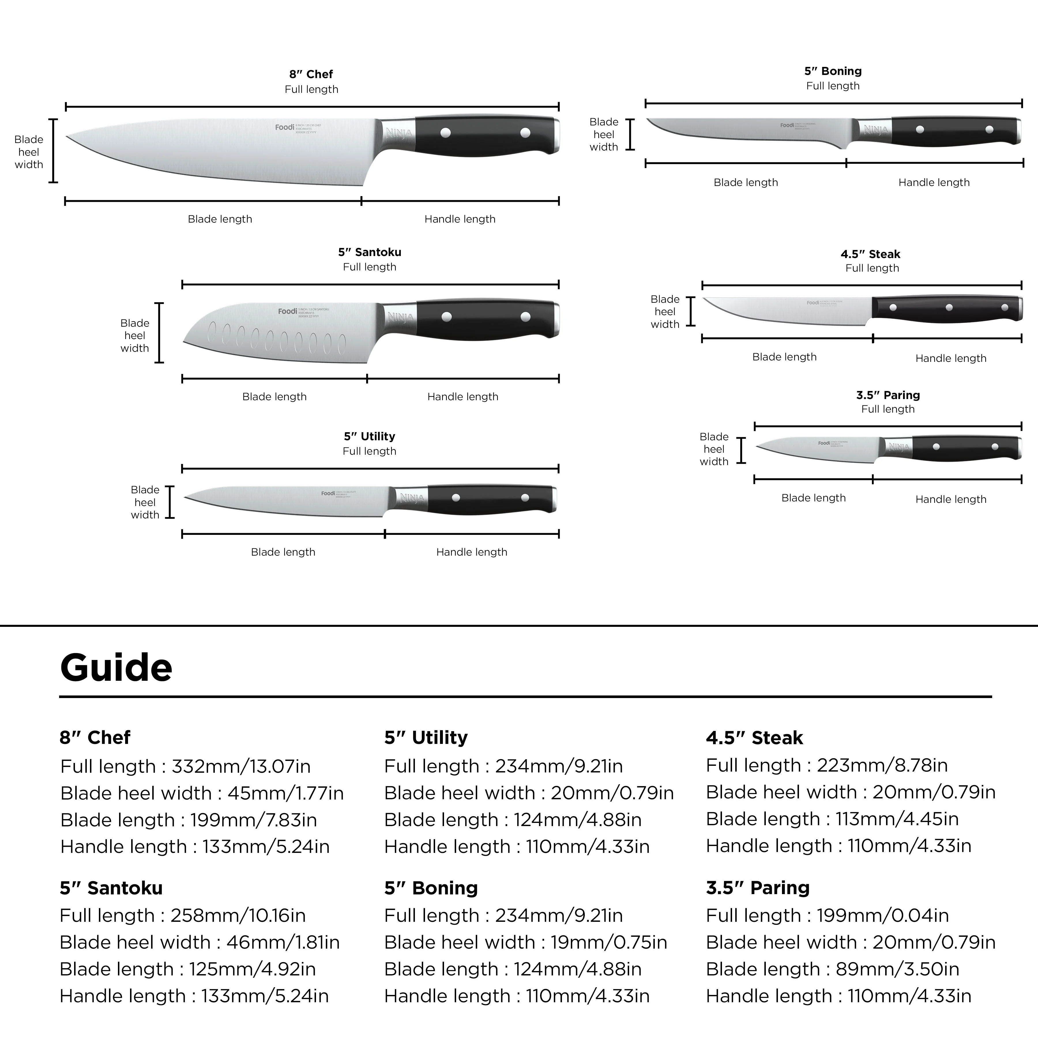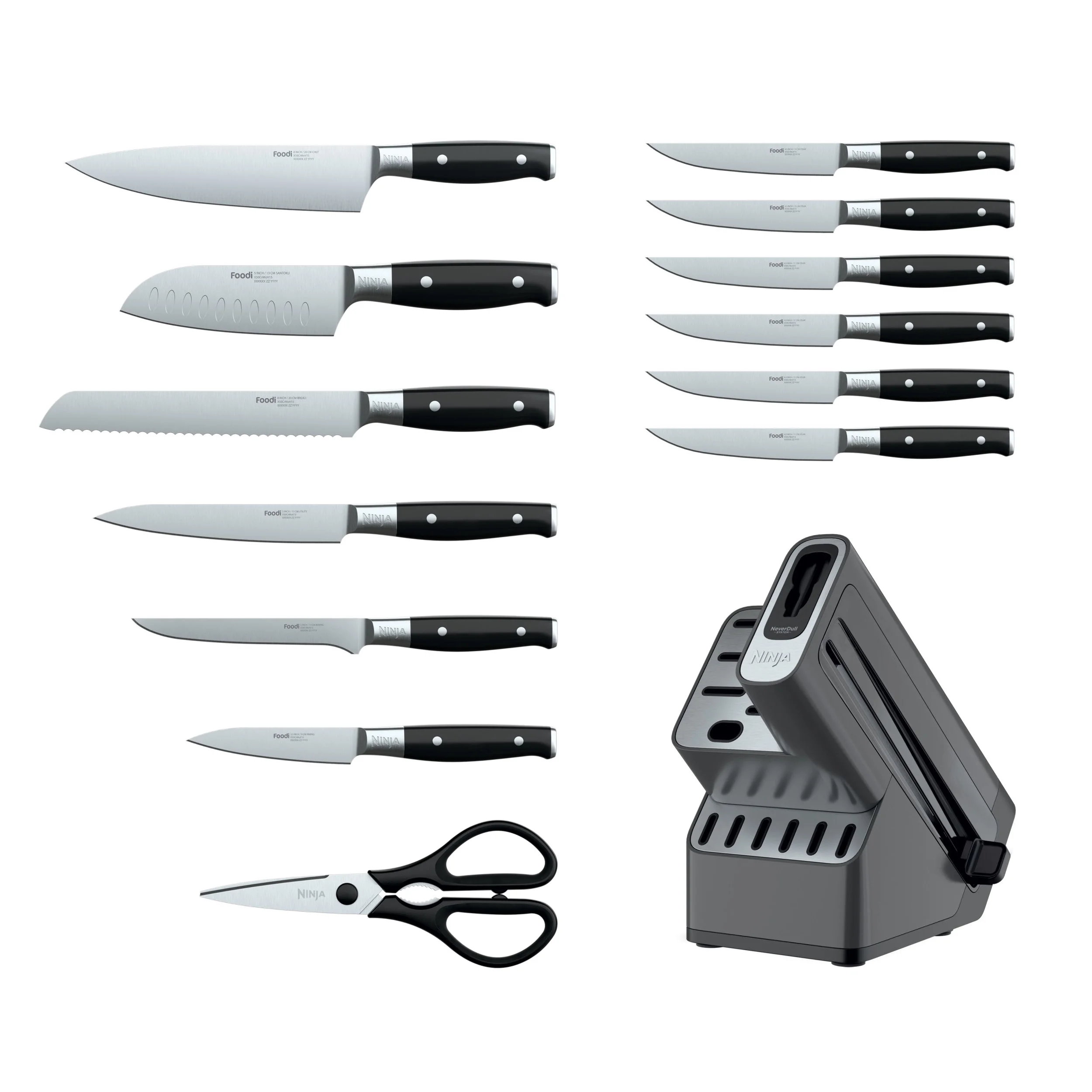 - INCLUDES: 14-piece set includes 8" Chef knife, 8" Bread knife, 5" Santoku knife, 5" Boning knife, 5" Utility knife, 3.5" Paring knife, (x6) Steak knives, Shears, Knife block with NeverDull Technology