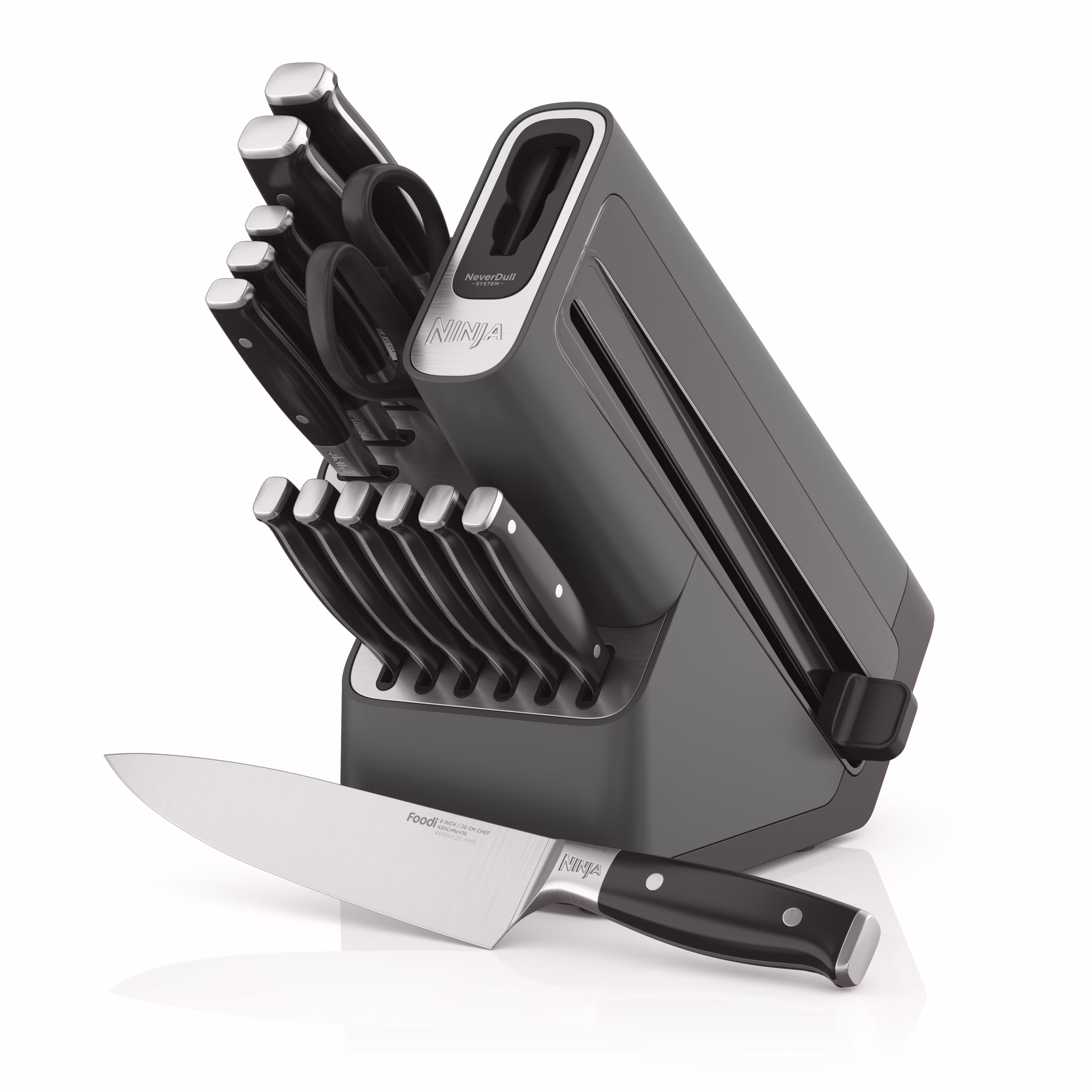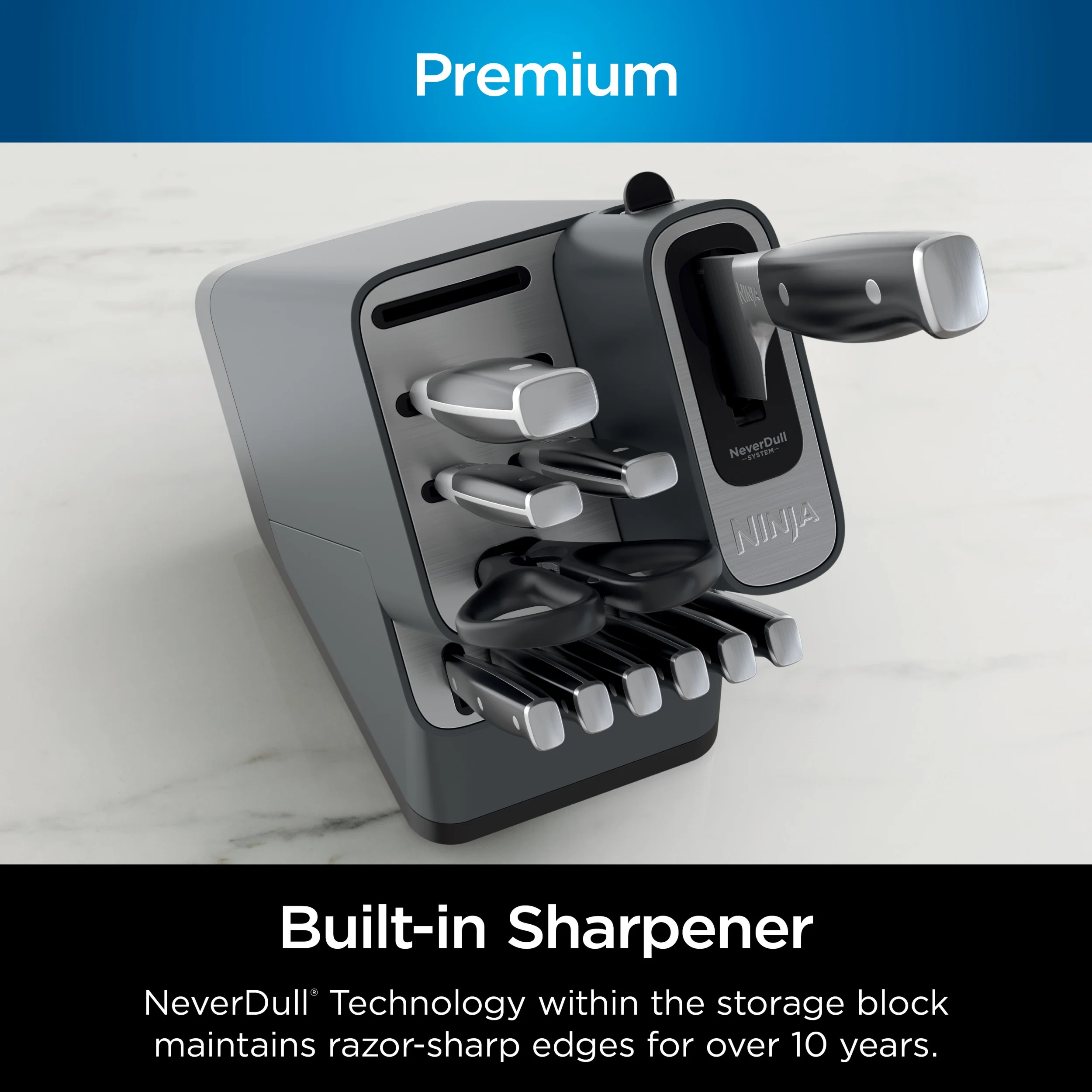 - BUILT-IN SHARPENER: NeverDull? Technology is conveniently built into the storage block for professional sharpening results that will maintain a razor-sharp edge for over 10 years!