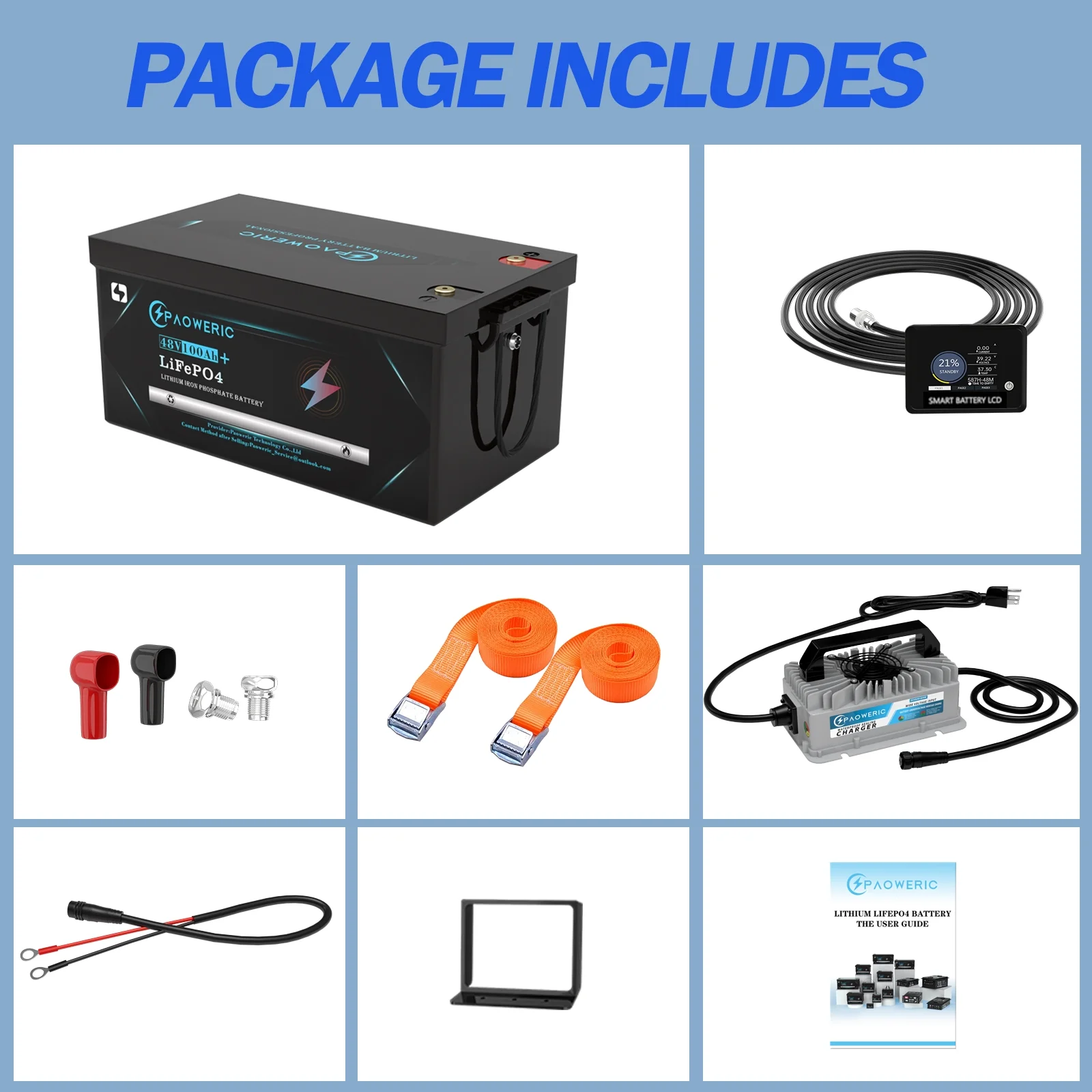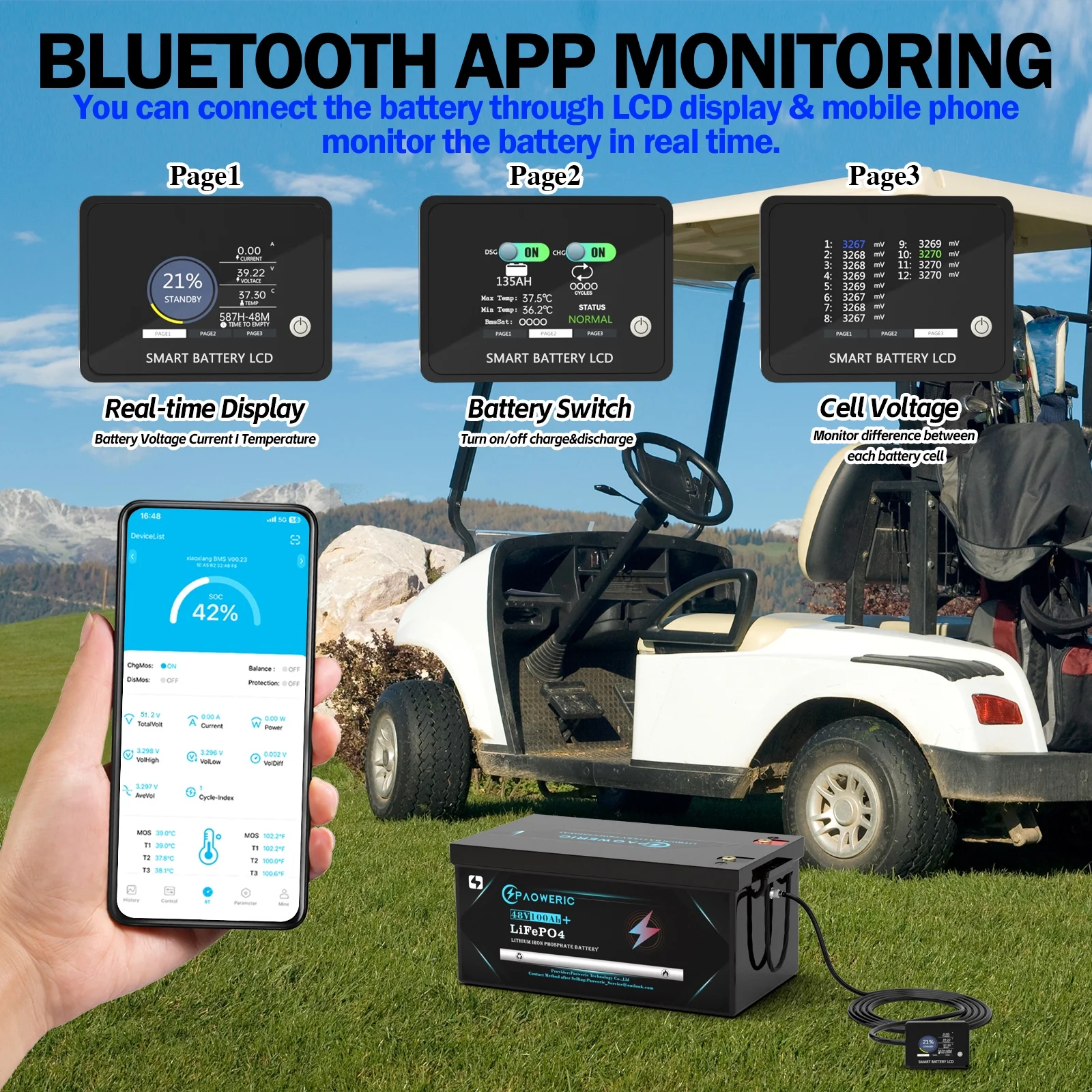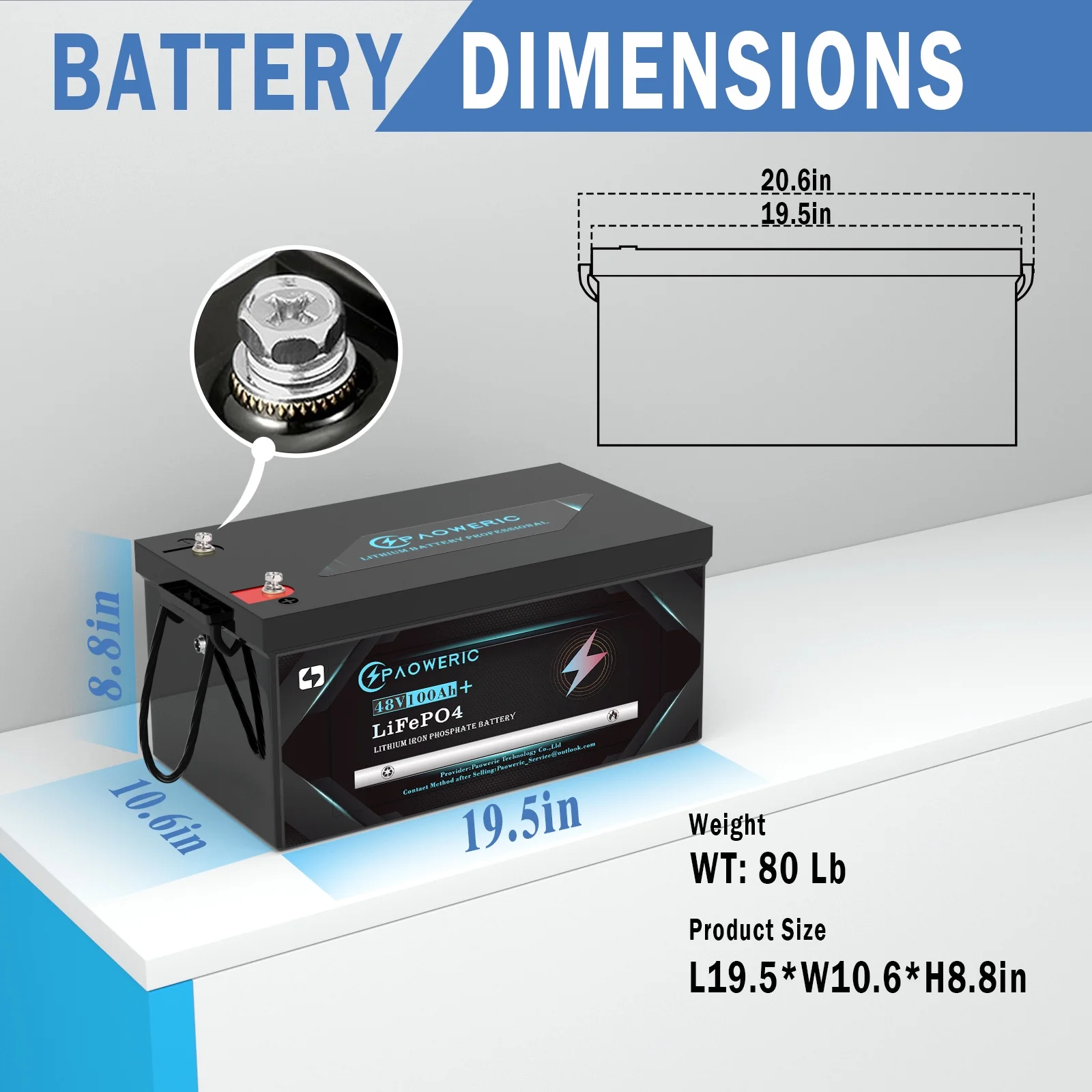 - ��Dimension��48V 100Ah LiFePO4 Lithium Golf Cart Battery have large capacity and smaller size: L20.6*W10.5*H8.7 inch. Enjoy enhanced performance and increased range with PAOWERIC 48V(51.2V) 100Ah LiFePO4 Lithium Golf Cart Batteries.