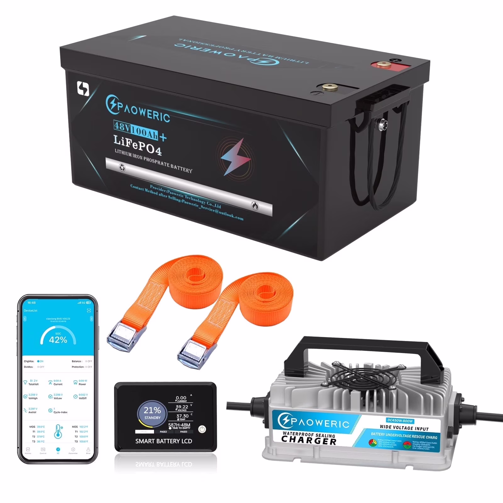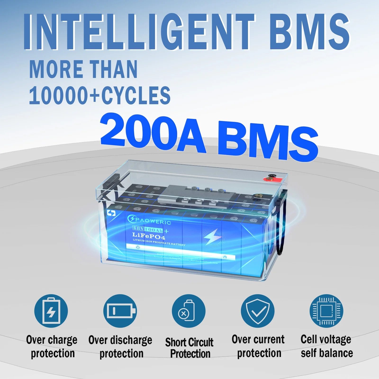 - ��Intelligent 200 BMS Protection��51.2V lifepo4 battery 100ah has a built-in BMS, with over charge protection, over discharge protection, over current protection, short-circuit protection and and over/low temperature protection. Operating temperature: Charge at 0��-55��(32-131�H);Discharge at -30��-55��(-22-131�H).
