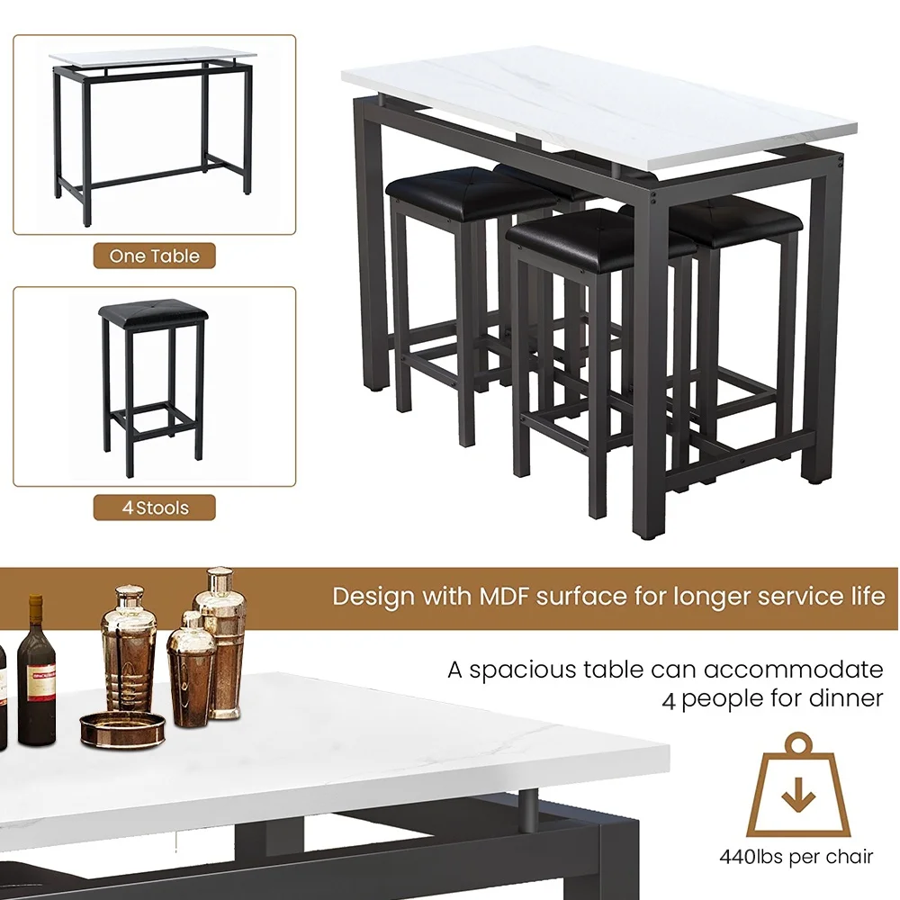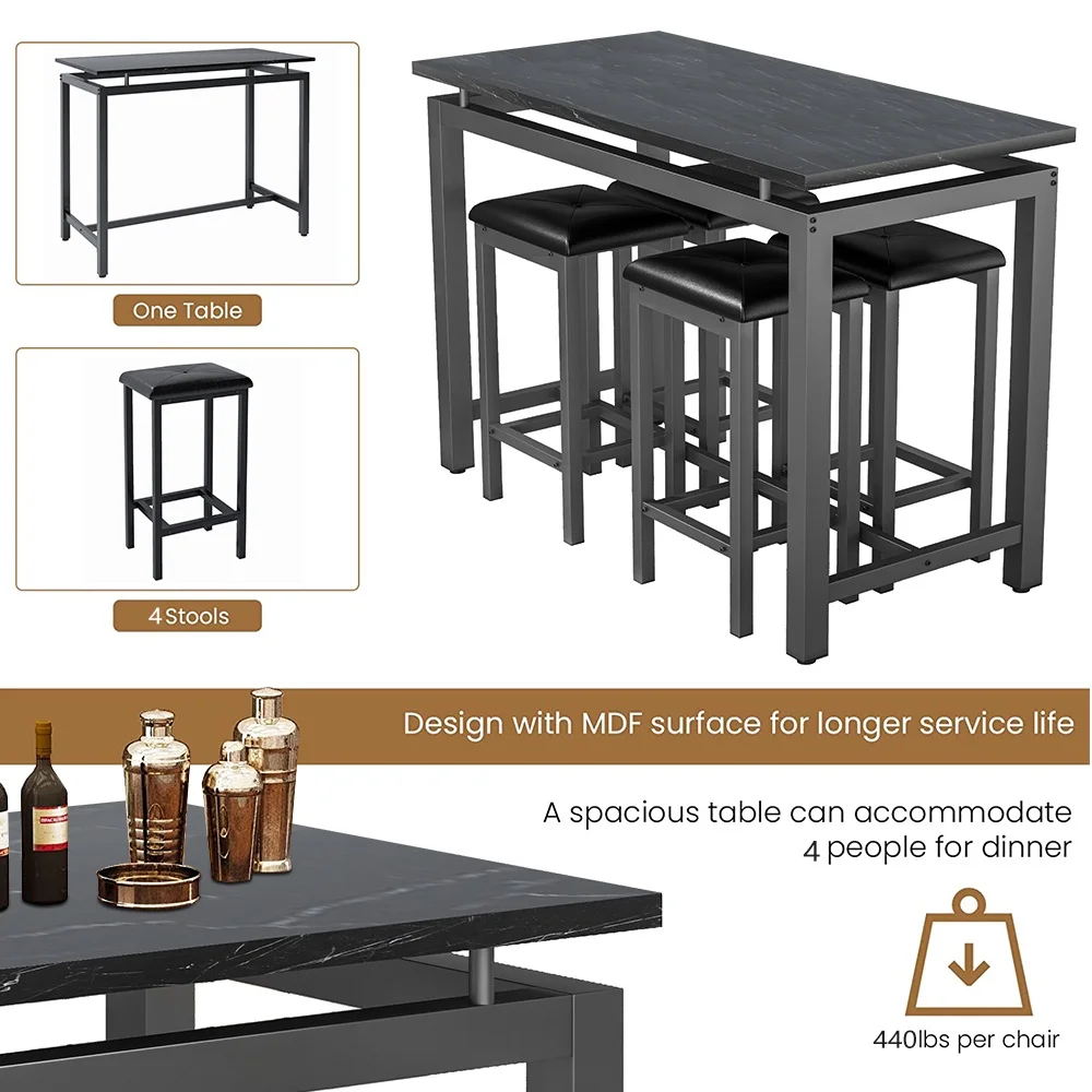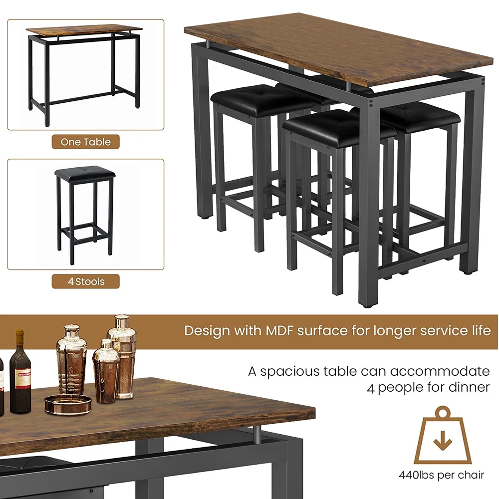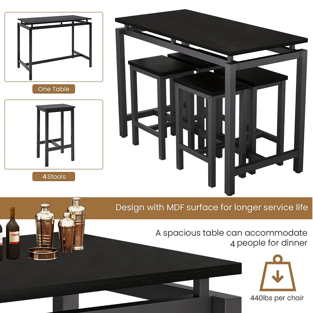 5 Piece Pub Table Set is perfect for dining with family and relaxing with friends. The efficiently designed rectangular table and 4 bar stools are comfortable and will take up minimal valuable space in your kitchen or dining area. Enjoy dinner and drinks with friends, breakfast with the kids and family game night on this modern and compact table and stools. Simply tuck the stools under the table when they aren��t in use for easy storage and maximum living space. Except for home use, it is also suitable for commercial in restaurants, pubs, or other business places.
