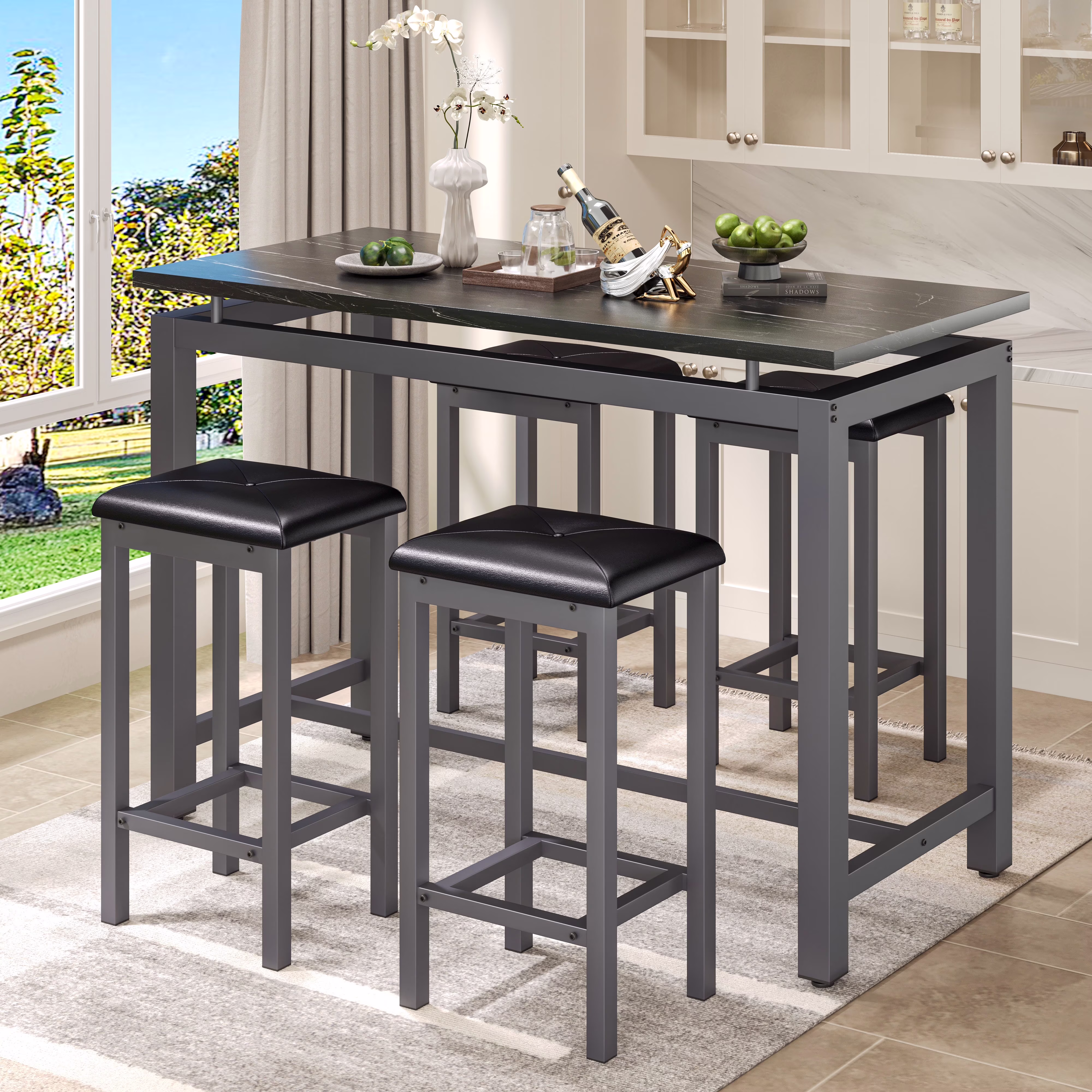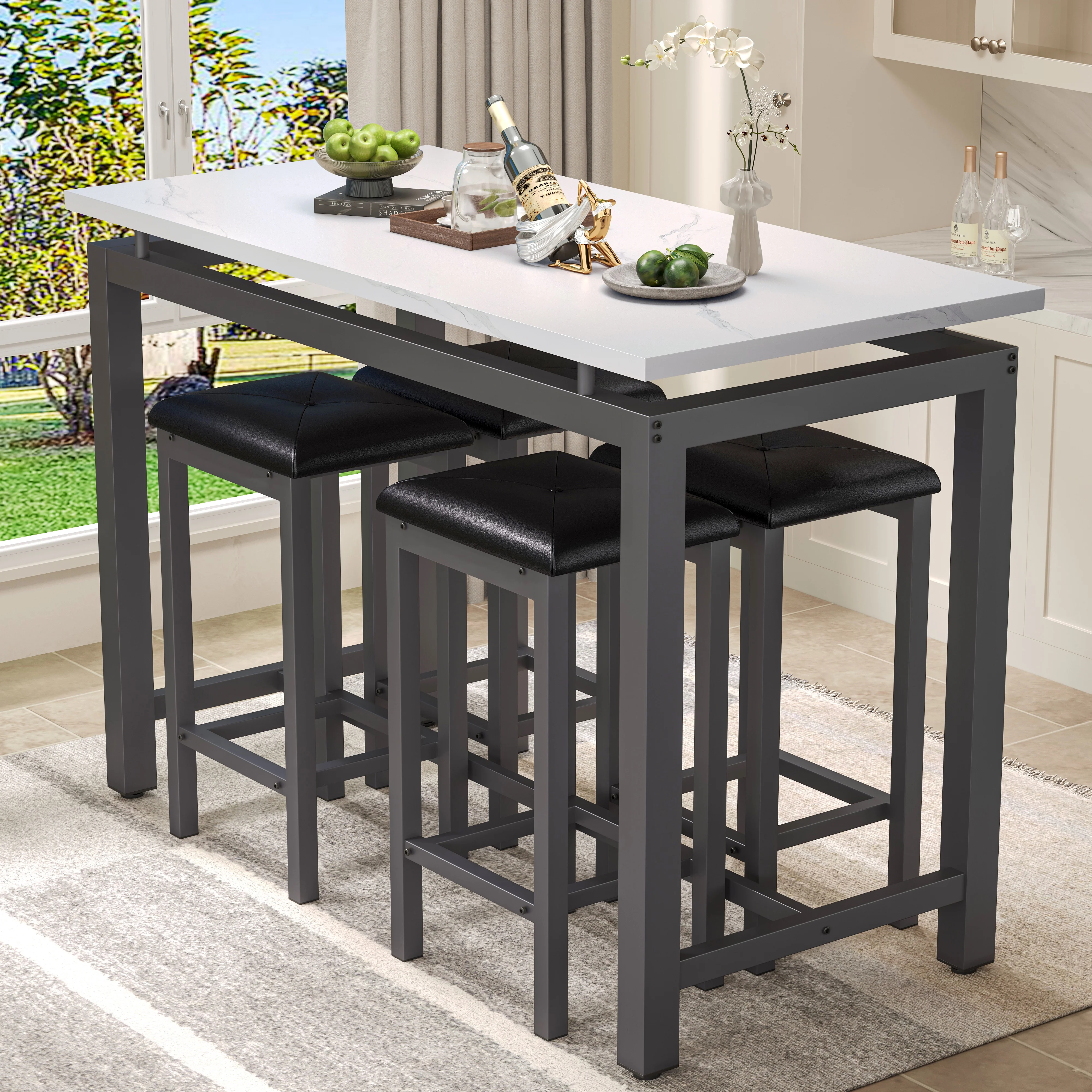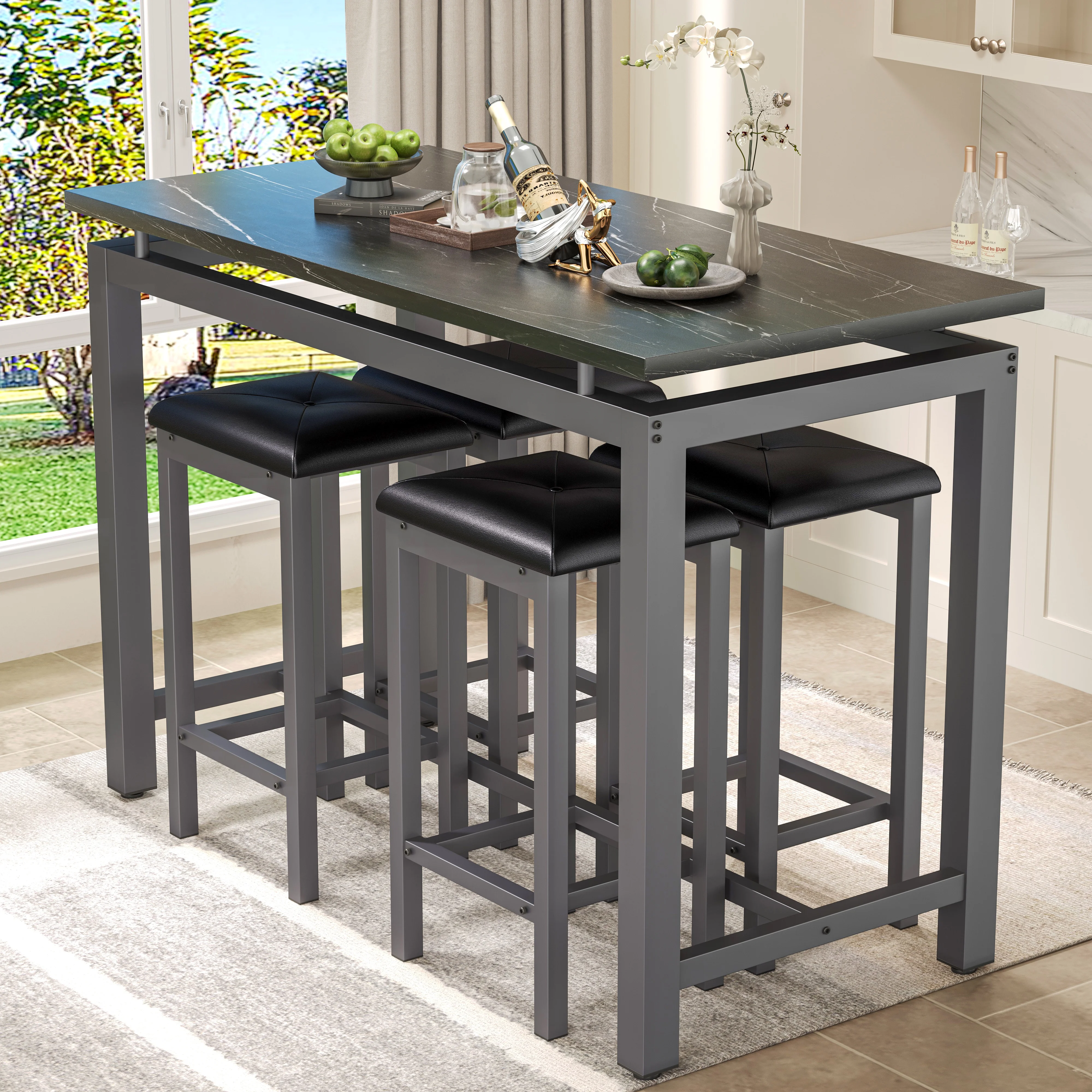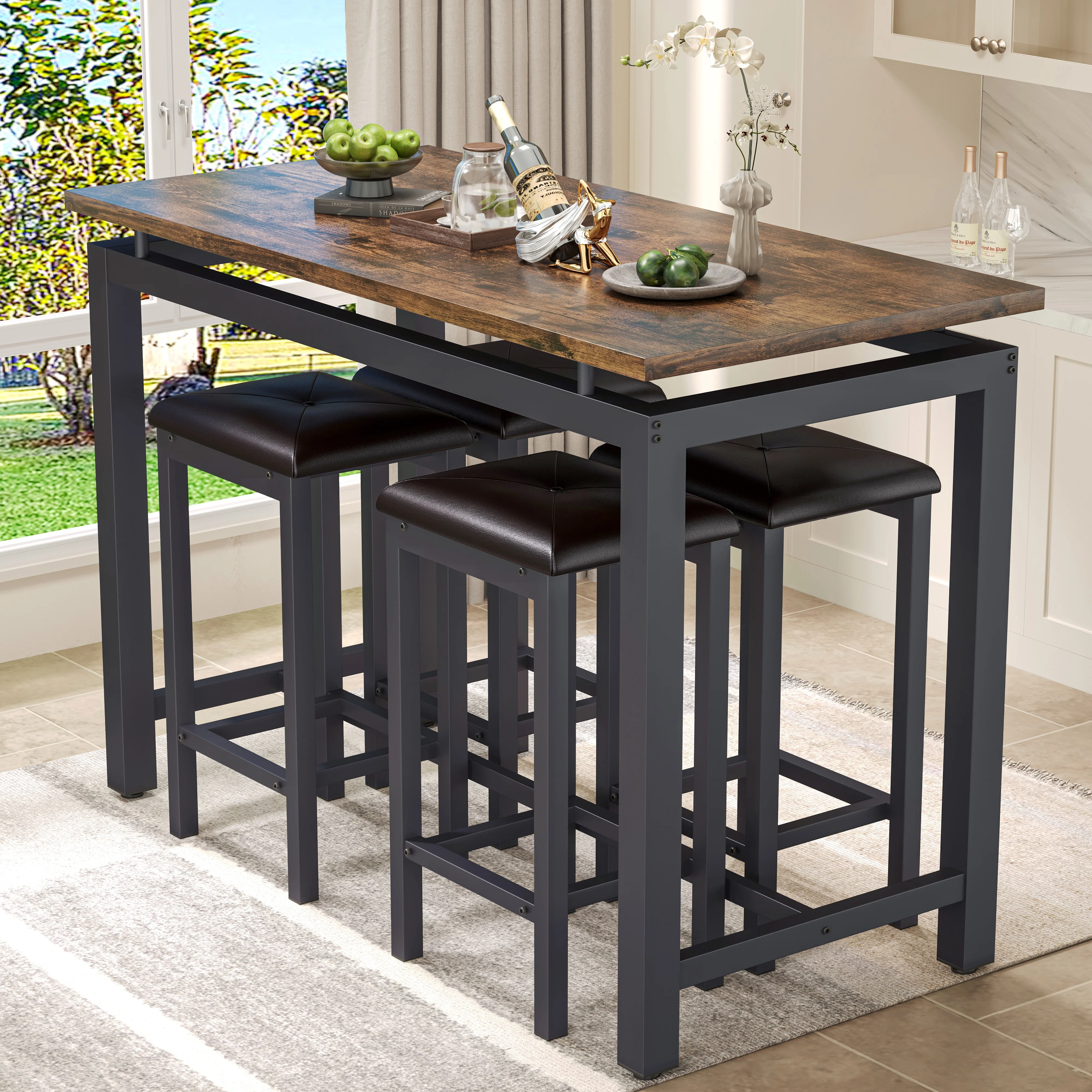 5 Piece Pub Table Set is perfect for dining with family and relaxing with friends. The efficiently designed rectangular table and 4 bar stools are comfortable and will take up minimal valuable space in your kitchen or dining area. Enjoy dinner and drinks with friends, breakfast with the kids and family game night on this modern and compact table and stools. Simply tuck the stools under the table when they aren��t in use for easy storage and maximum living space. Except for home use, it is also suitable for commercial in restaurants, pubs, or other business places.