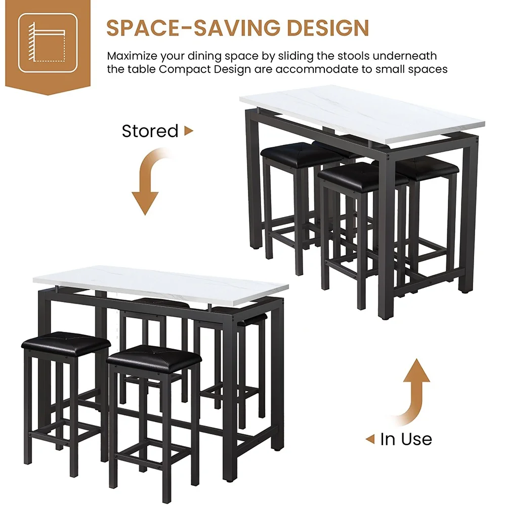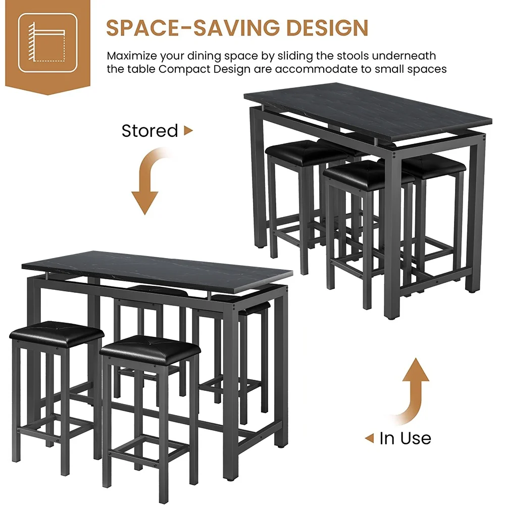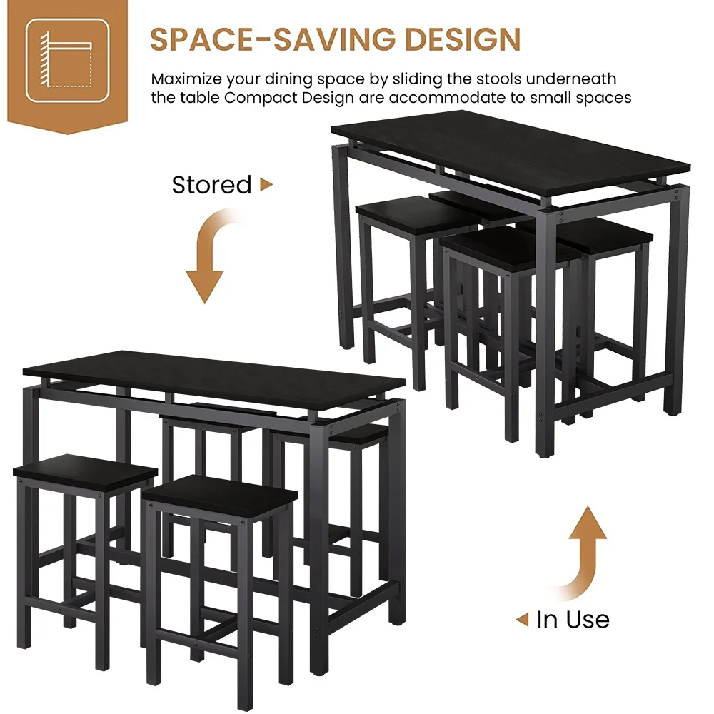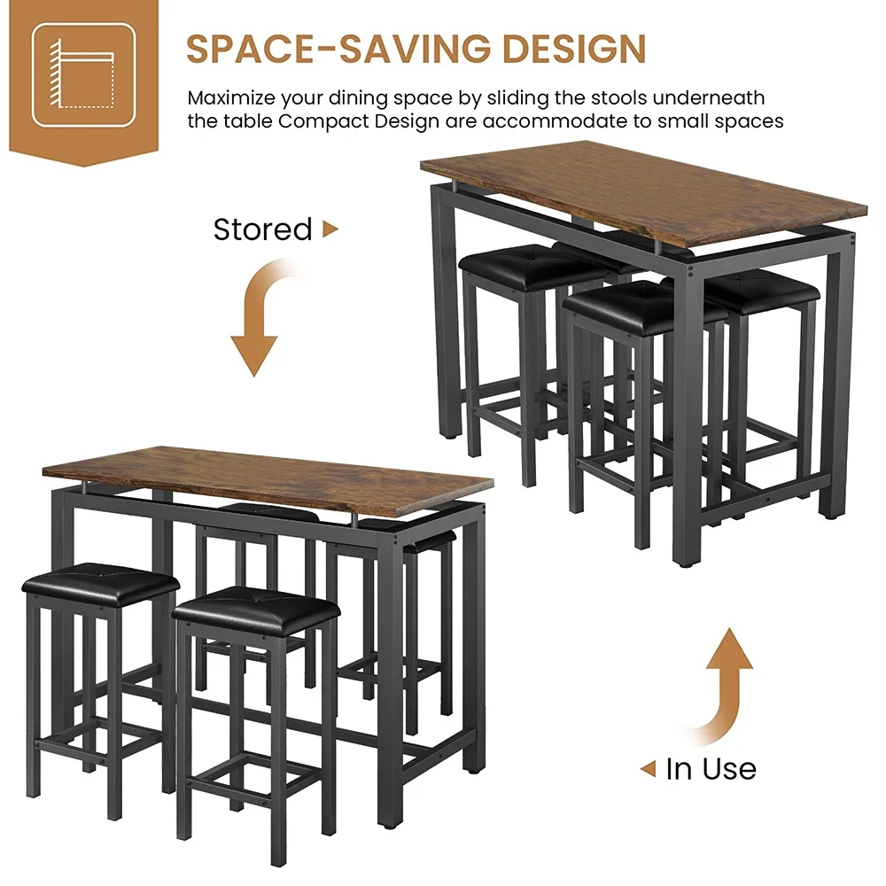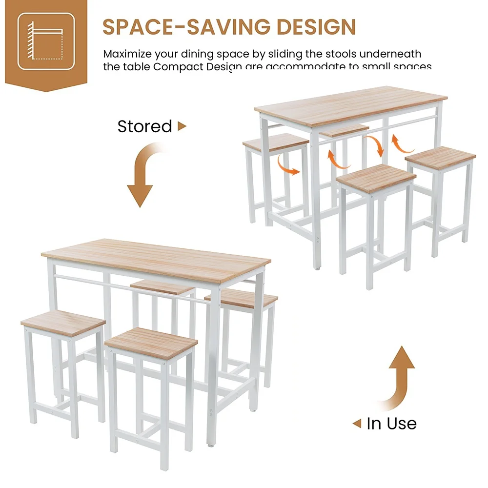 This dining set is very compact to takes up little space for storage. You can place them neatly under the table when not in use. The bar stools and the table can be perfectly integrated to save more space for you, which is ideal for small rooms.