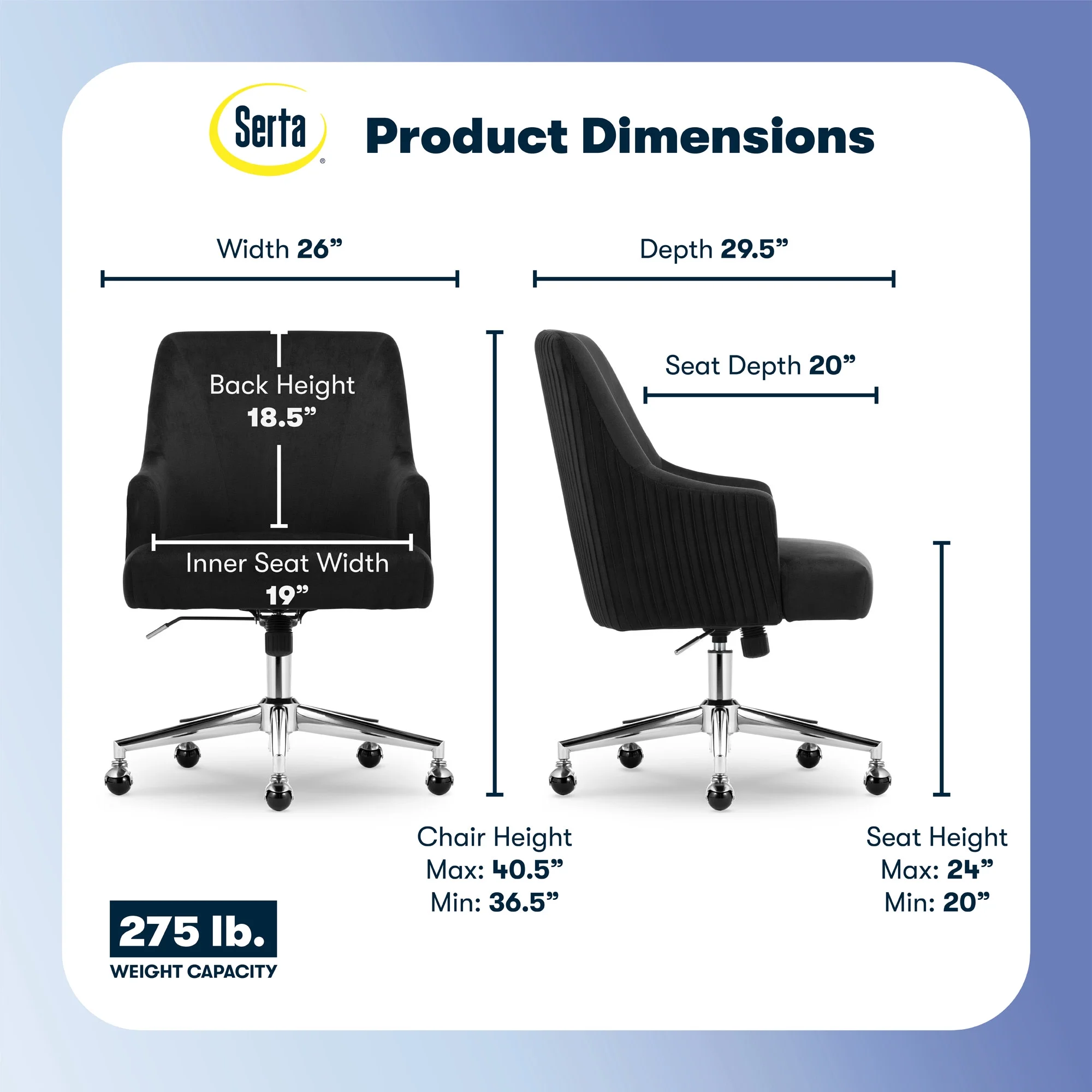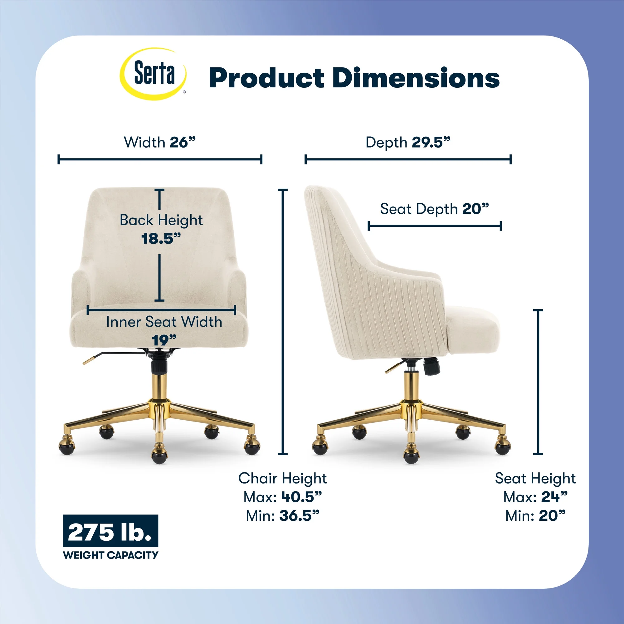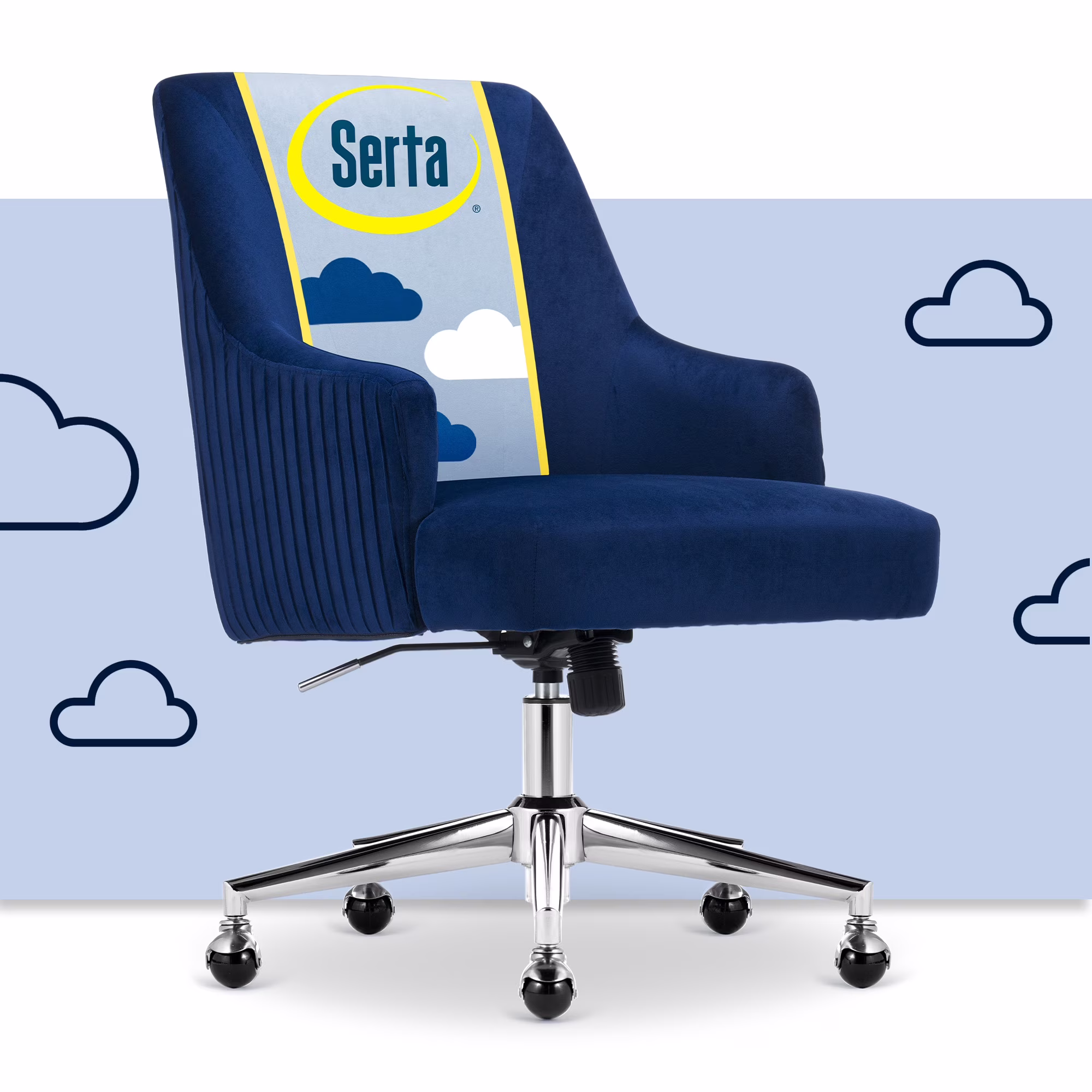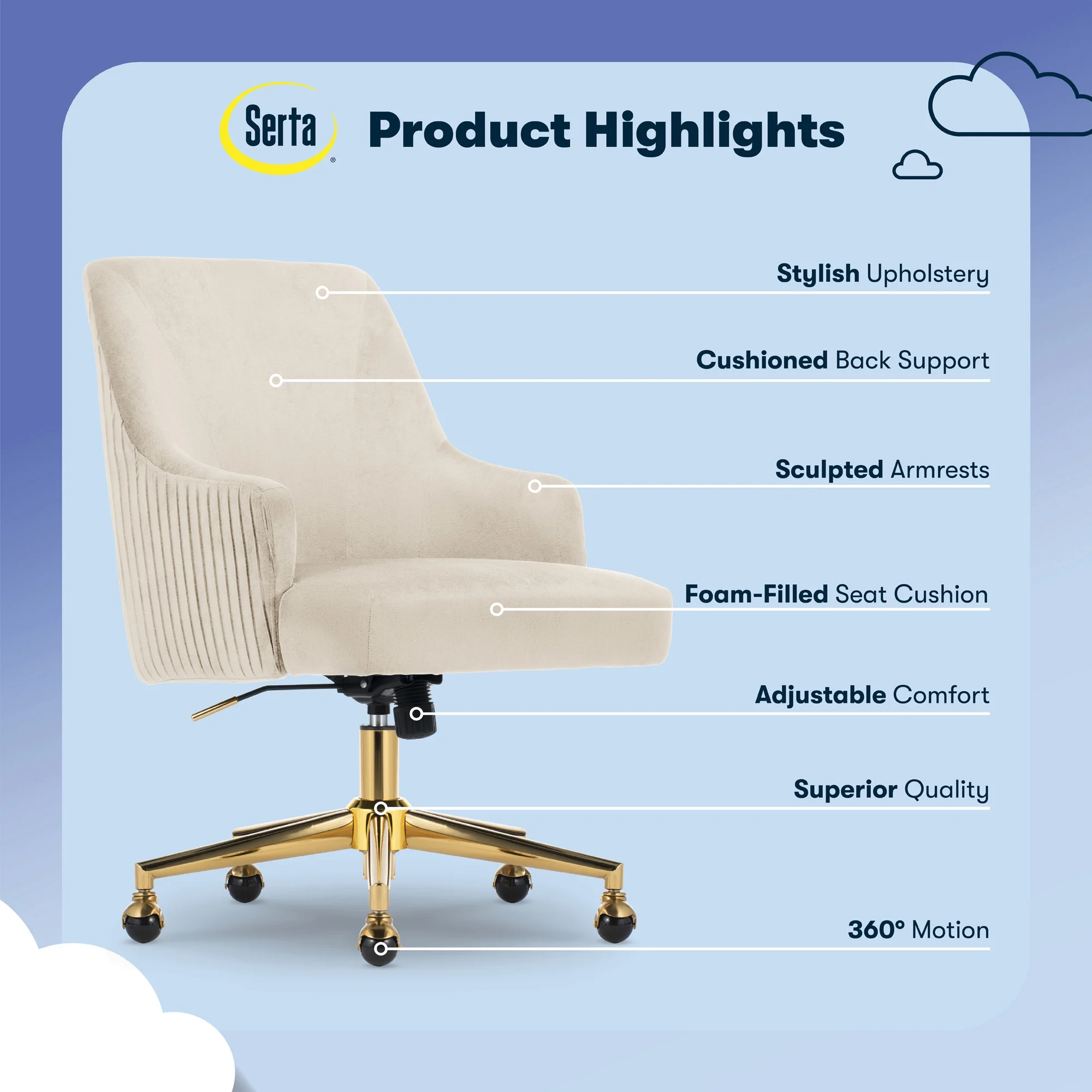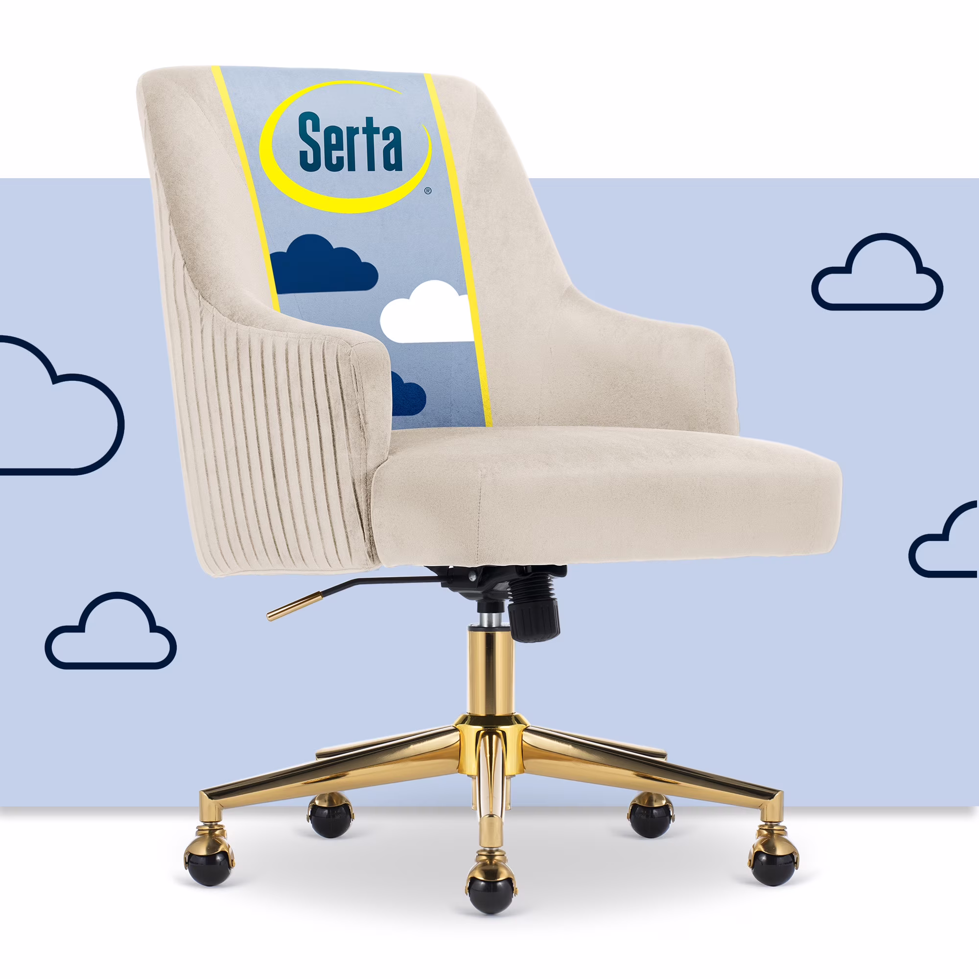The better you sit, the better you'll feel. Whether for work, play, or any other activity that has you sitting in our chairs, we believe comfort is everything. We know it's a big responsibility and take it seriously, just as we do with our mattresses. With over 15 years of making chairs and innovating with designs, materials, and technology, we at Serta know what it takes to give you a comfortable sit. Strike a pose and channel your inner boss babe with the Serta Mid-Century Modern Desk Chair. This chair isn't just comfortable. It's a statement piece for your home office. You'll want to be seen sitting in this chair. Resting on top of a polished gold swivel base, this modern desk chair is wrapped in a soft and cozy velvet fabric with 4 alternative colors. Complement your office environment in Beige or Black for a classic and timeless appeal or add a splash of color in Pink or Midnight Blue for a chic and playful touch. This soft pleated home office chair delivers medium comfort with a well-cushioned mid-back that offers support for casual work sessions. The pocket coil seat, cushioned with layered foam, keeps you comfortable, while the low-profile arms can slide under most desks for ergonomic positioning and easy storage. Ready to elevate your workday? Add the Serta Mid-Century Modern Desk Chair to your cart and get ready to work in style.