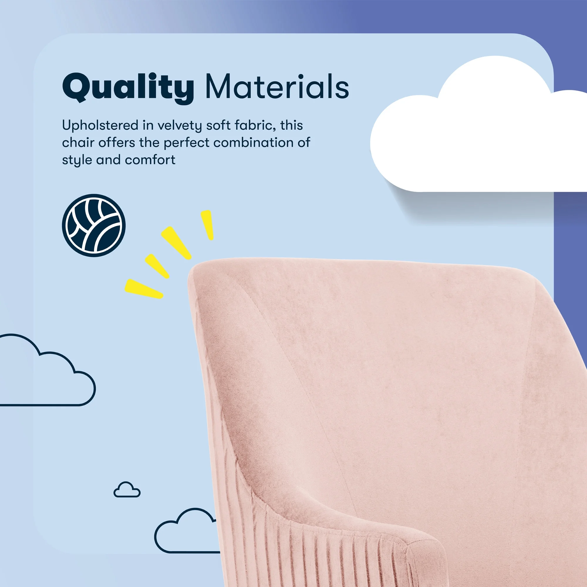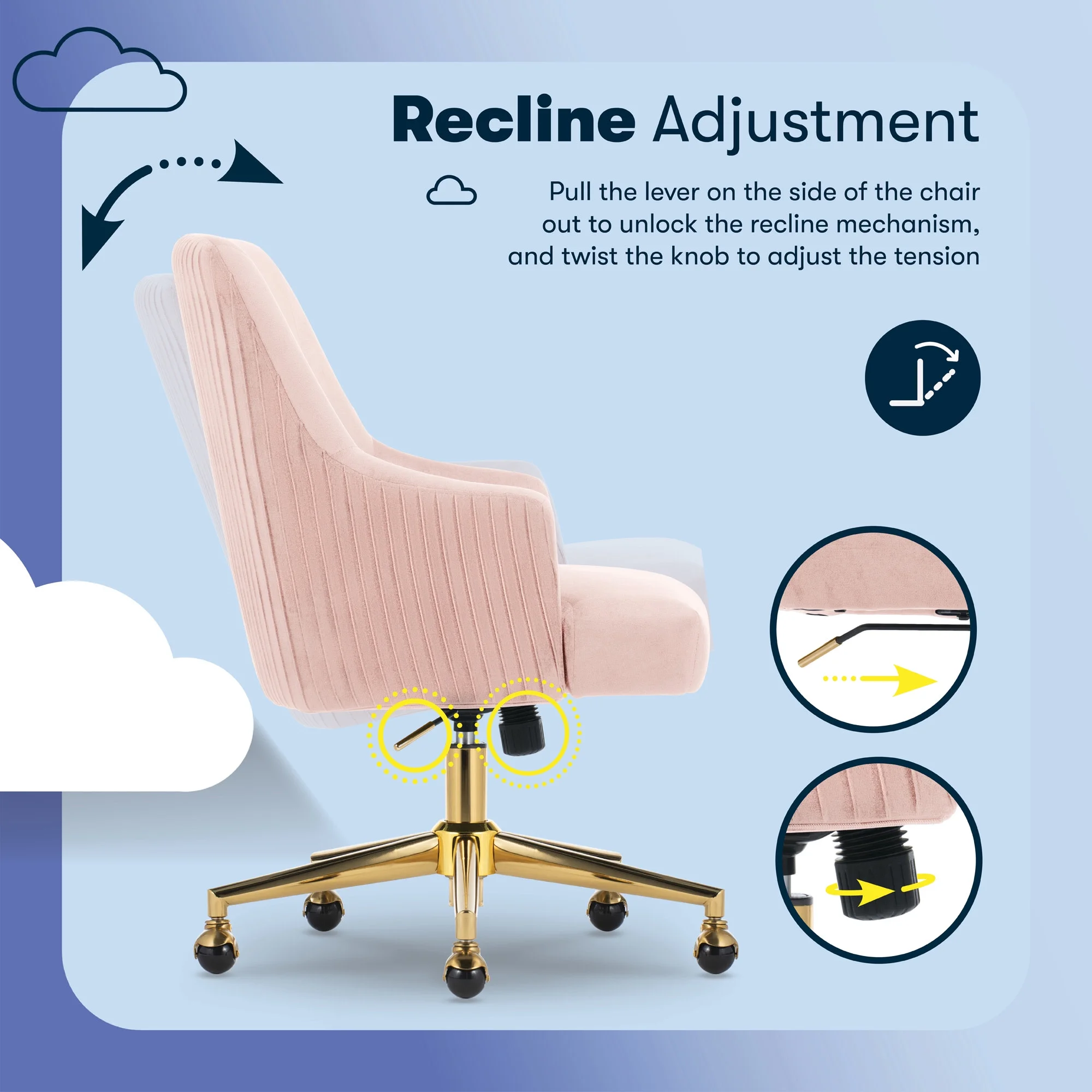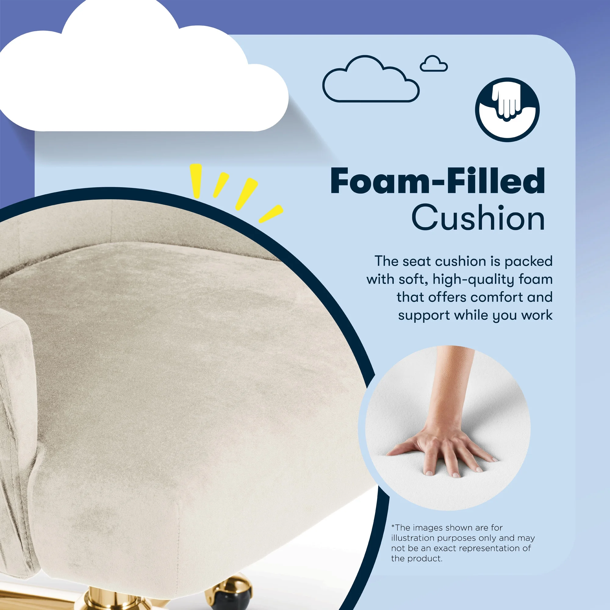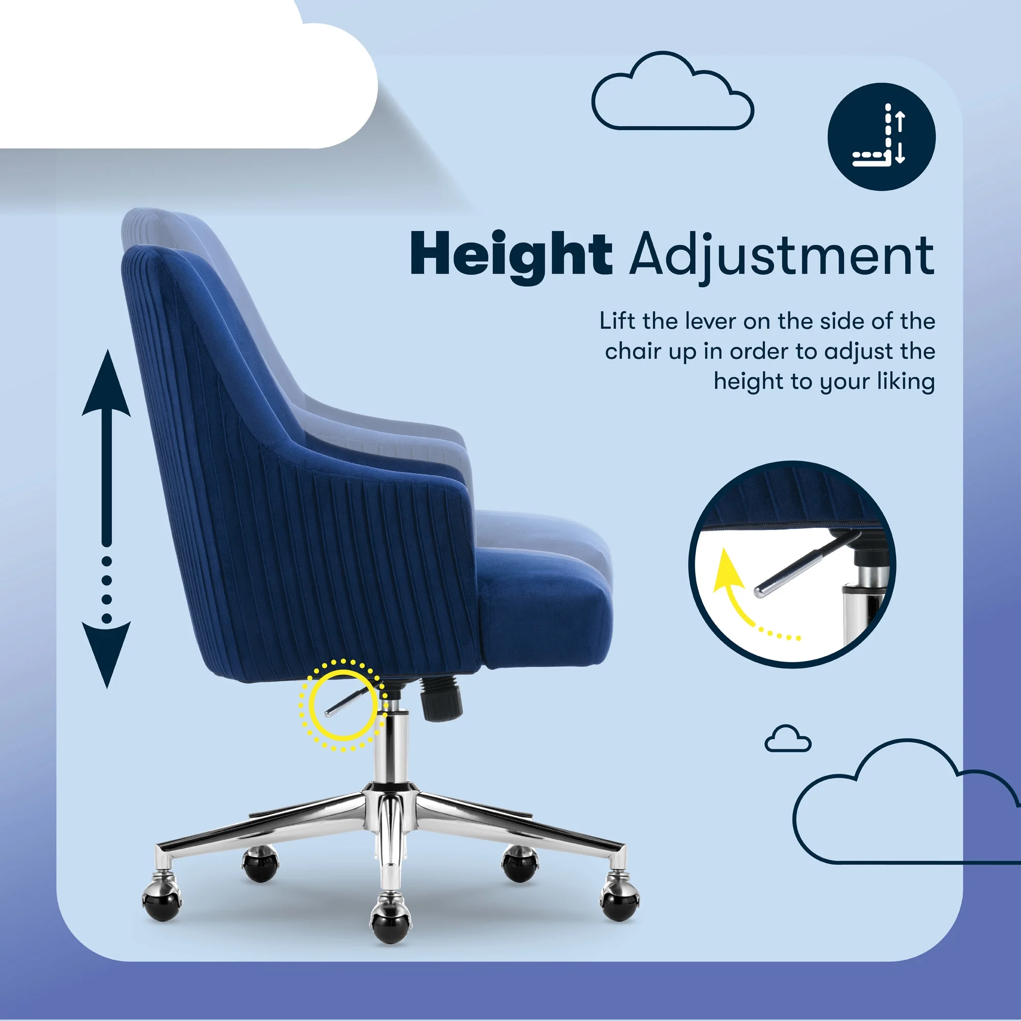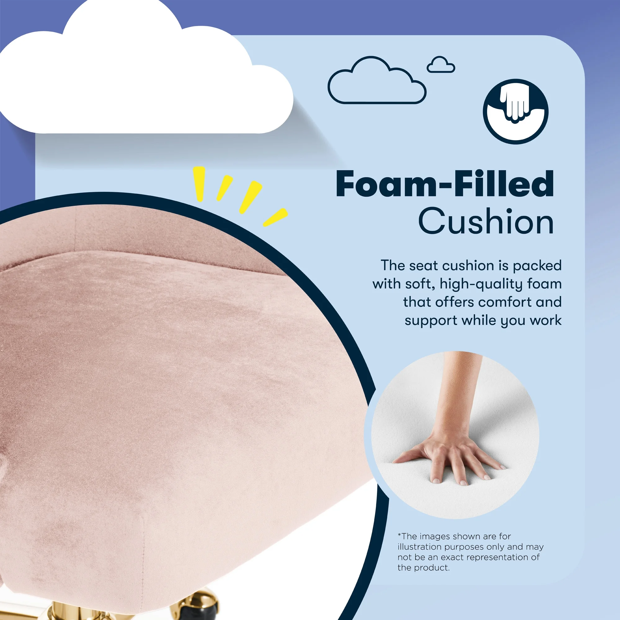 The better you sit, the better you'll feel. Whether for work, play, or any other activity that has you sitting in our chairs, we believe comfort is everything. We know it's a big responsibility and take it seriously, just as we do with our mattresses. With over 15 years of making chairs and innovating with designs, materials, and technology, we at Serta know what it takes to give you a comfortable sit. Strike a pose and channel your inner boss babe with the Serta Mid-Century Modern Desk Chair. This chair isn't just comfortable. It's a statement piece for your home office. You'll want to be seen sitting in this chair. Resting on top of a polished gold swivel base, this modern desk chair is wrapped in a soft and cozy velvet fabric with 4 alternative colors. Complement your office environment in Beige or Black for a classic and timeless appeal or add a splash of color in Pink or Midnight Blue for a chic and playful touch. This soft pleated home office chair delivers medium comfort with a well-cushioned mid-back that offers support for casual work sessions. The pocket coil seat, cushioned with layered foam, keeps you comfortable, while the low-profile arms can slide under most desks for ergonomic positioning and easy storage. Ready to elevate your workday? Add the Serta Mid-Century Modern Desk Chair to your cart and get ready to work in style.