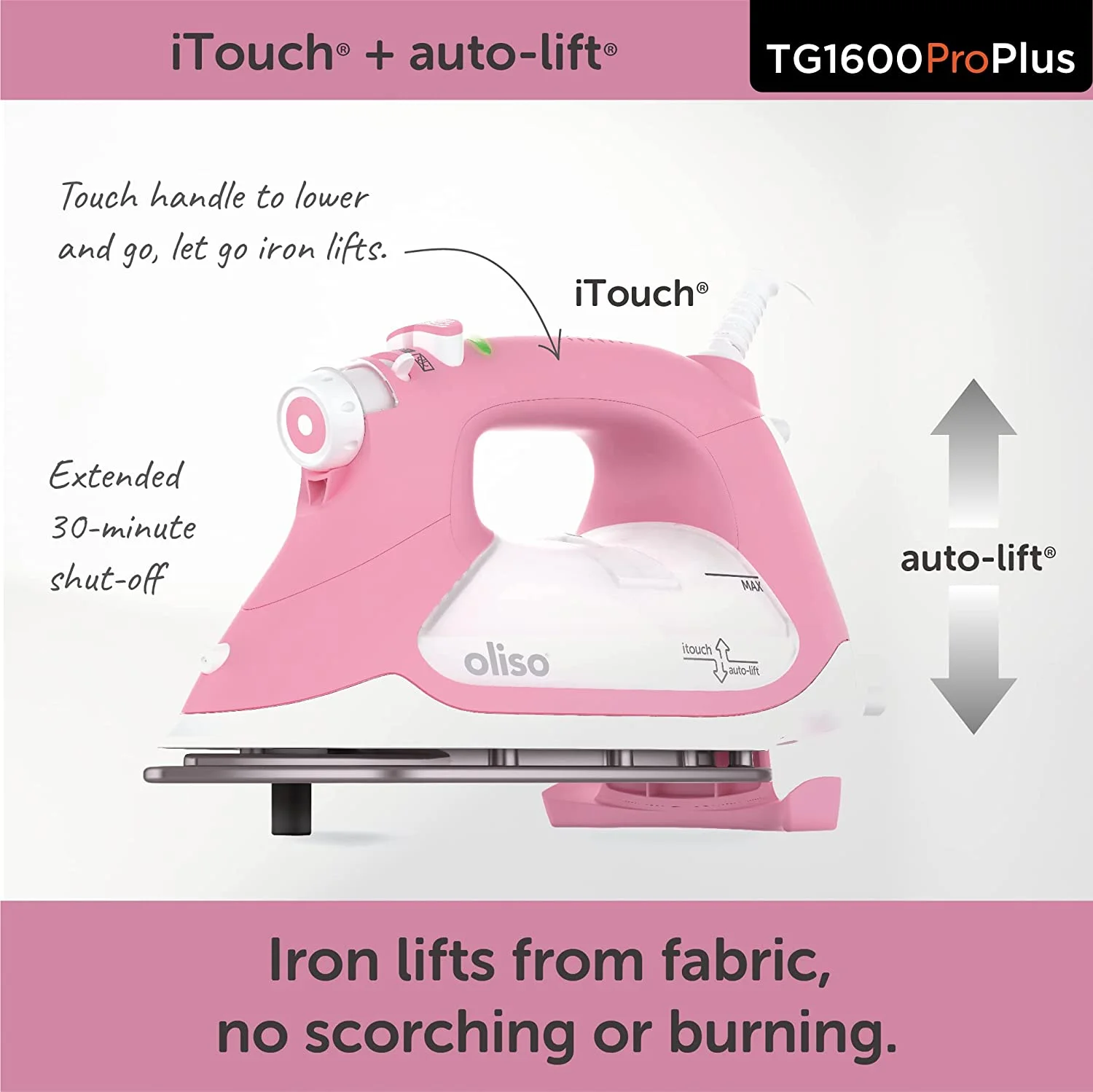 - ProPlus Smart Iron Auto-Lift feature - Simply touch the handle, and the iron lowers, ready to work. Take your hand off, and the patented scorch guards lift the iron, preventing scorched and burned fabric. Keeping the iron horizontal is not only safer, but it also saves time as well as your wrists and shoulders.