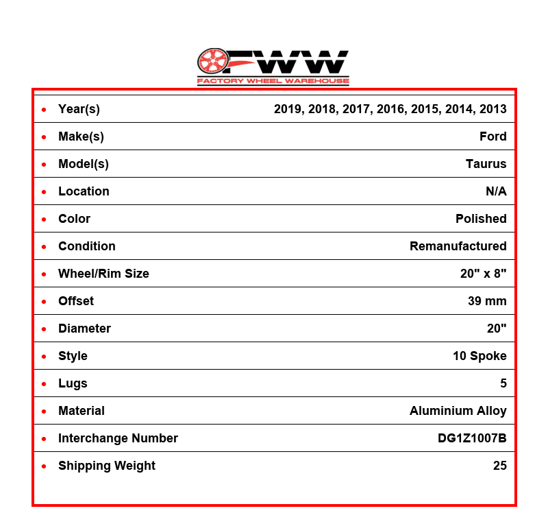 This Factory OEM FORD Aluminium Alloy 10 SPOKE wheel comes stock on 2019, 2018, 2017, 2016, 2015, 2014, 2013 FORD TAURUS. The OEM part number(s) for the rim are 560-03927, EG1Z1007A. This is a 5 lug wheel with a 20 inch diameter, width of 8 inch and an offset of 39 mm. The finish on the wheel is POLISHED.