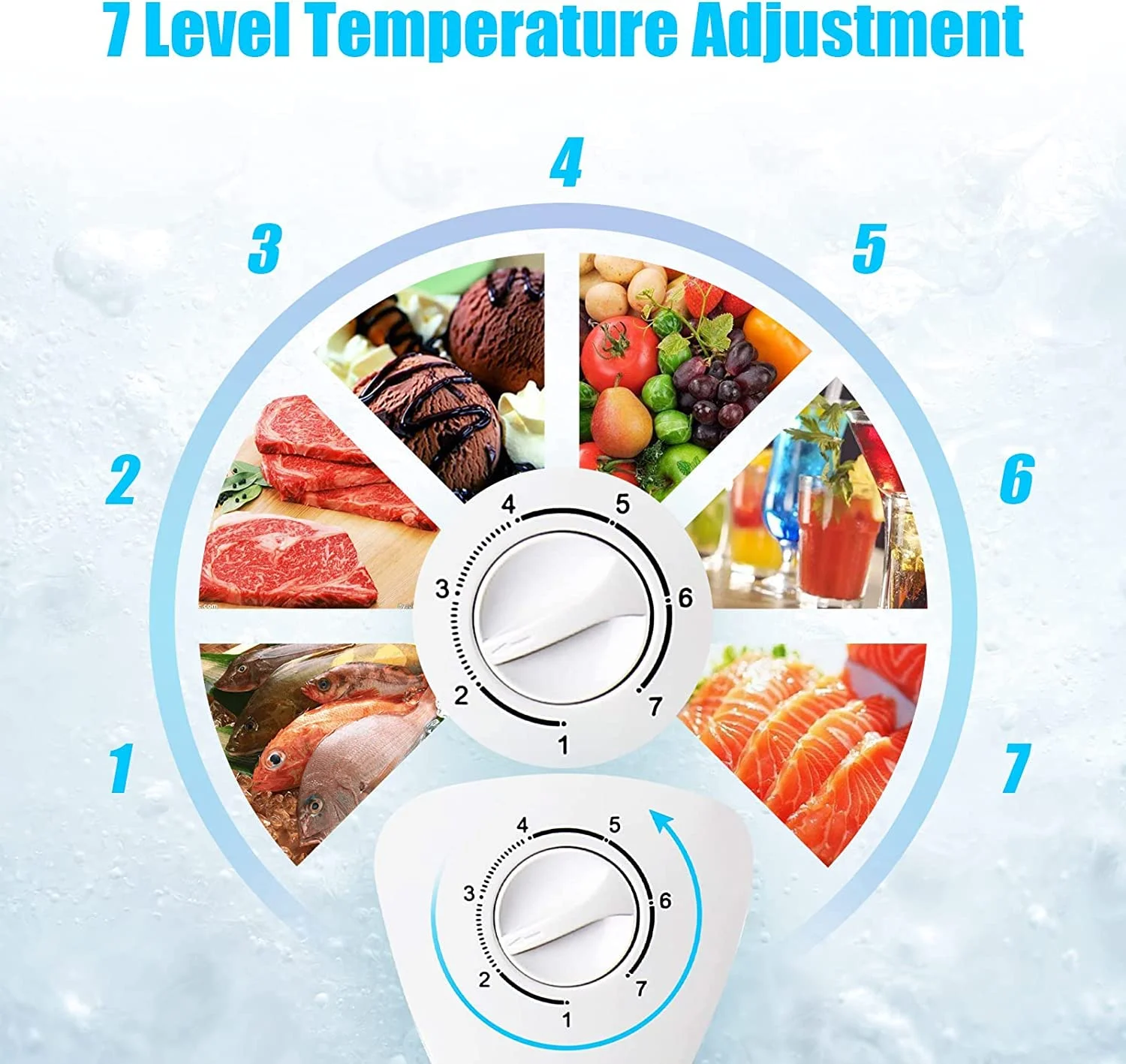 - Precision Temperature Adjustment:Boasting 7 settings,tailor the chill to your exact preference.Start at Gear 1 for defrosting,and go all the way to Gear 7 for ultimate coldness.For fresh produce and beverages,Levels 1-2 offer fridge temperatures between 32��F and 50��F.For preserving meats,ice creams,and seafood,Levels 3-7 ensure freezer temperatures from -11.2��F to 32��F.