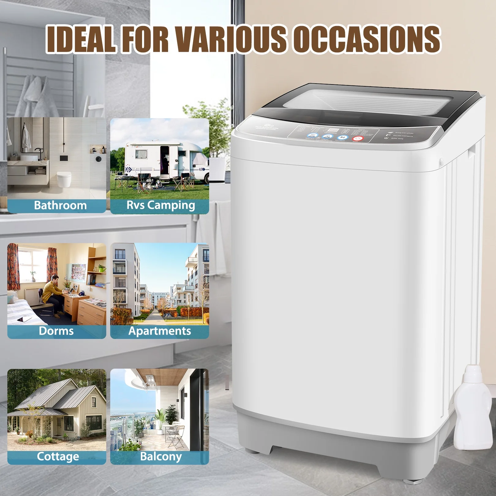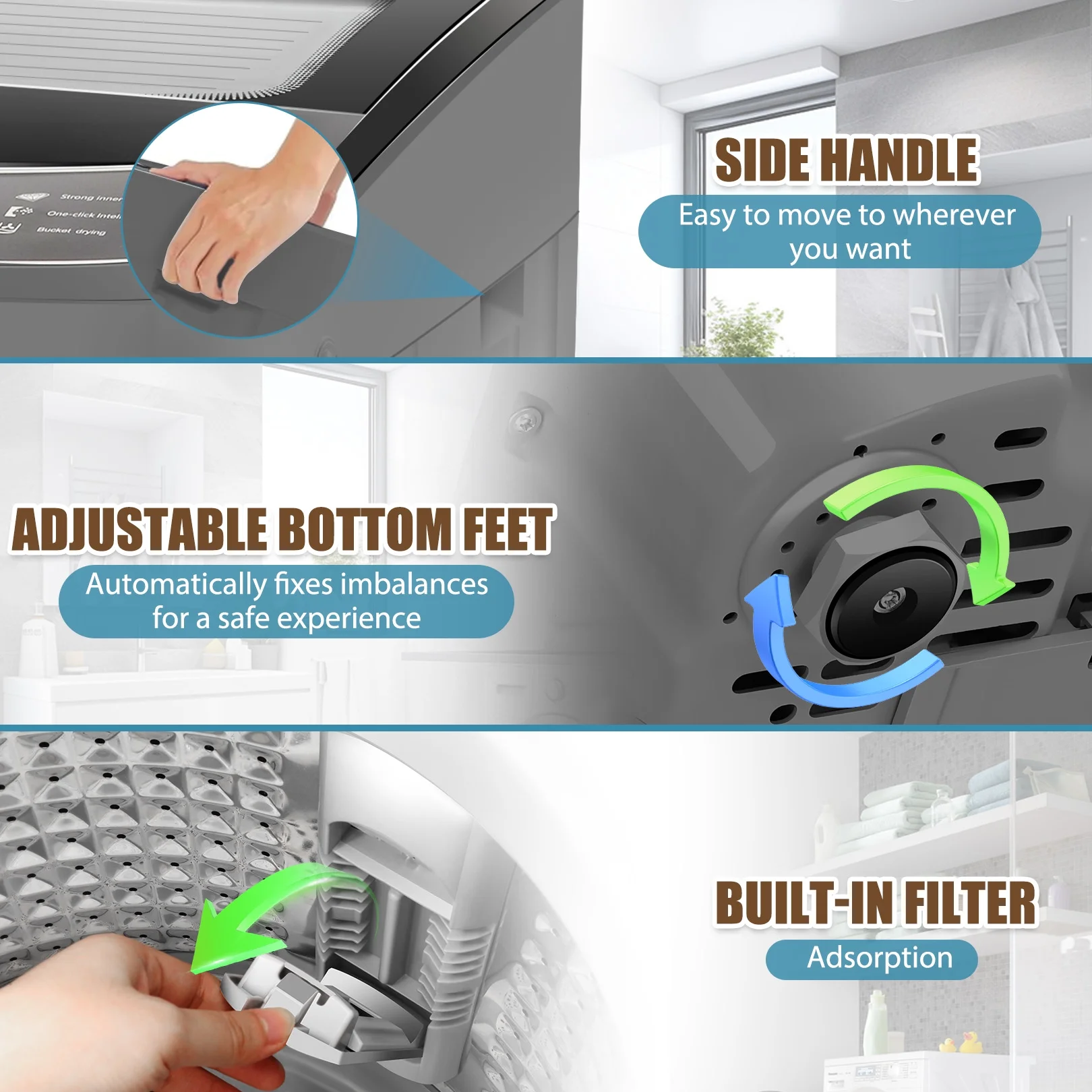 - Carefully configured -- the portable��s side handles also provide a secure grip to facilitate transportation. Safety is the top priority, and this fully automatic washing machine is equipped with a child lock for added peace of mind. The portable washer and dryer combo machine's upgraded automatic unbalancing device ensures that the washer does not collide violently during operation, ensuring smooth operation.