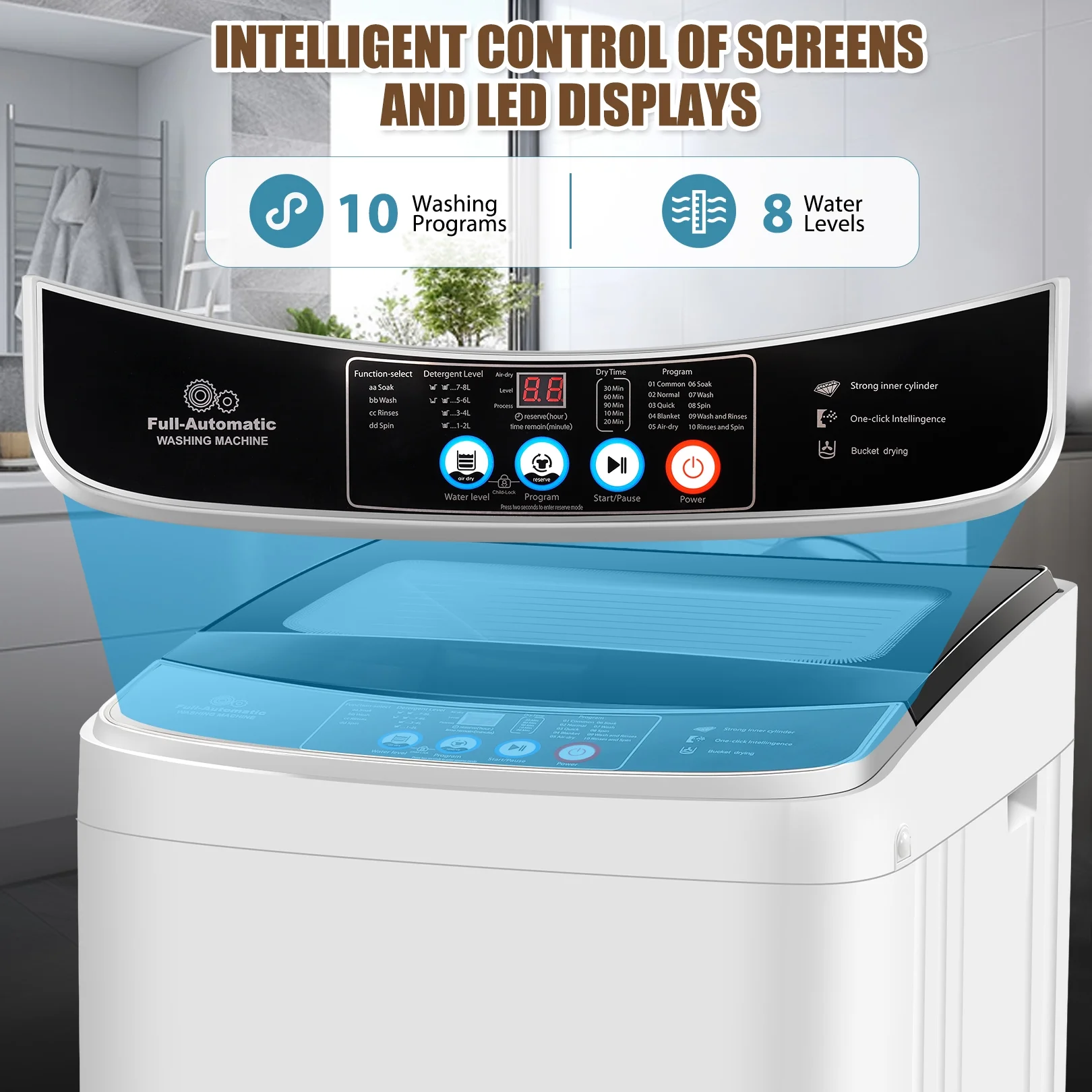 - Easy-to-use LED display -- The fully automatic washer-dryer combo is equipped with a convenient control panel with 10 washing programs and 8 water levels to choose from, and the LED display clearly shows the washing time. The LED display clearly shows the washing time. The safety child lock of the washing machine also ensures the normal operation of the washing machine. No need to worry about naughty little hands pressing the buttons.