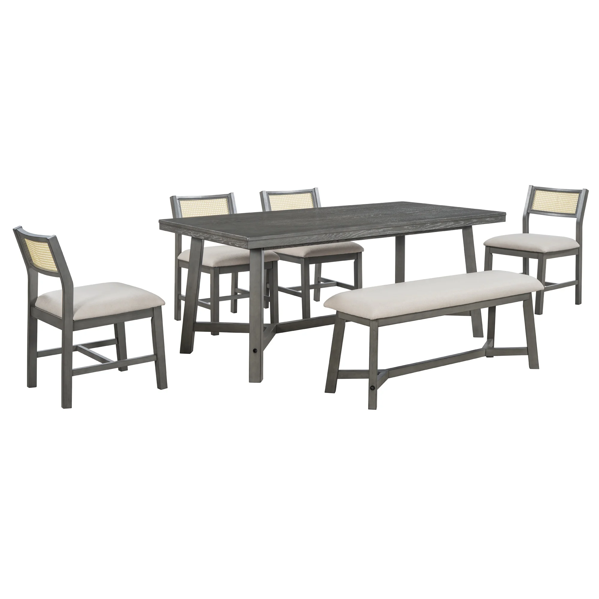 - 1 Dining Table + 4 Upholstered Chairs + 1 Upholstered Bench