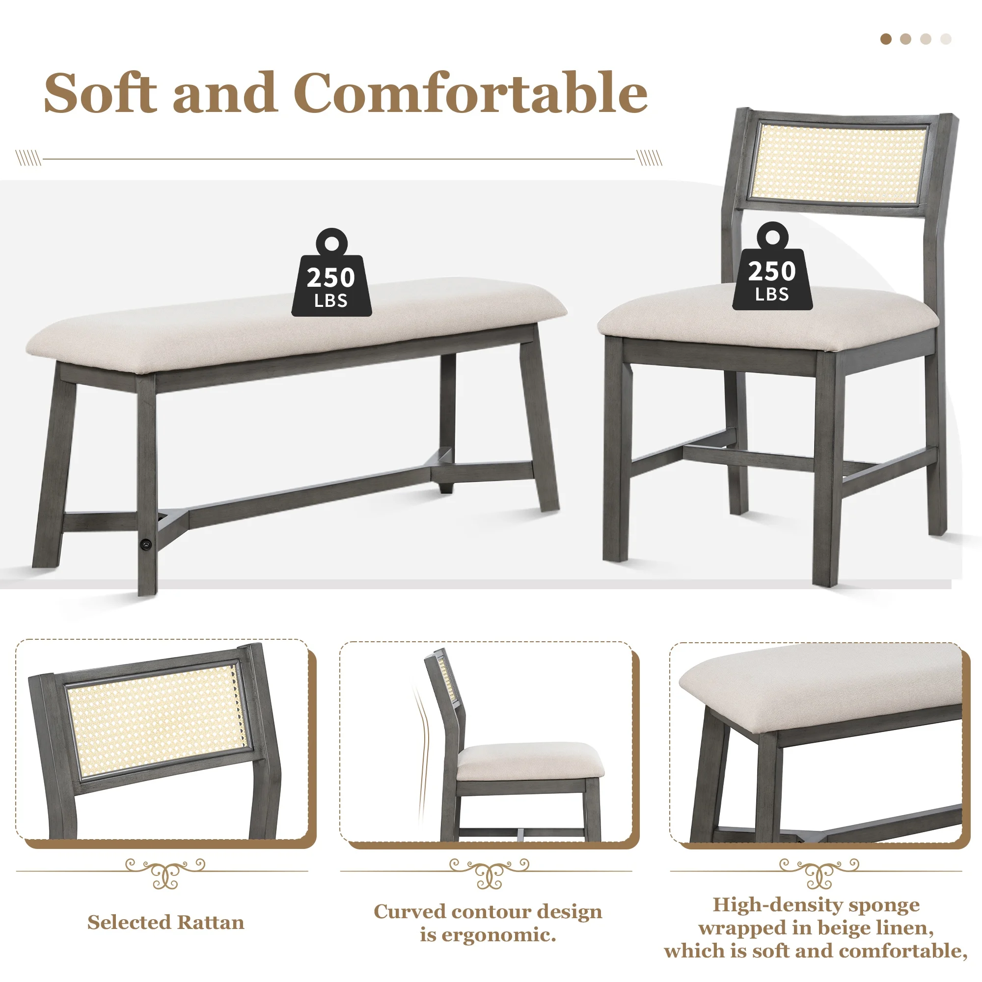 - Comfortable Seating: The chairs and bench feature padded seat cushions, ensuring comfort during long meals and conversations. The ergonomic design of the chairs supports your posture, enhancing the dining experience.