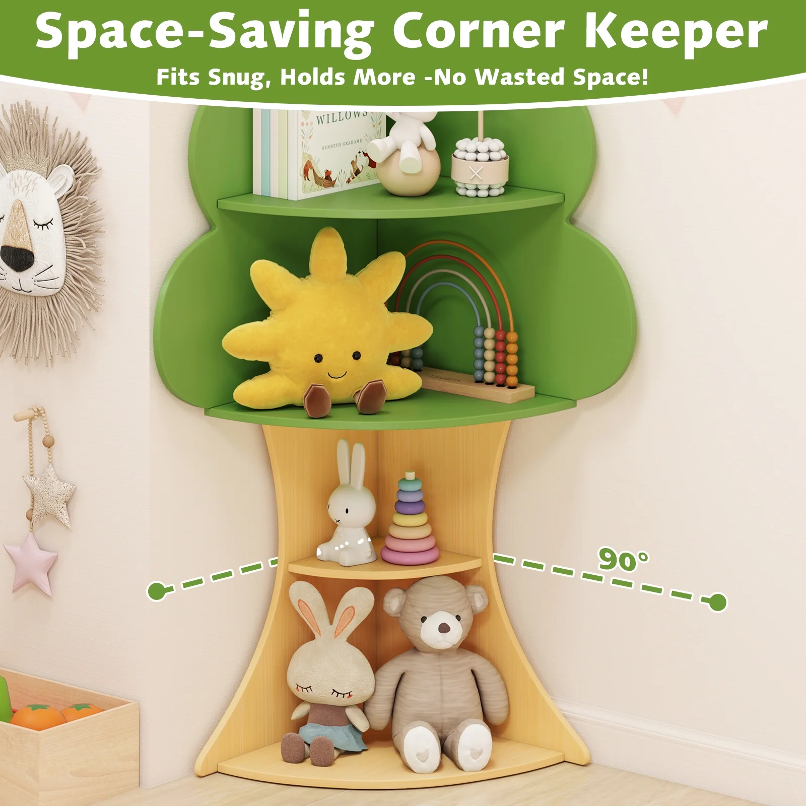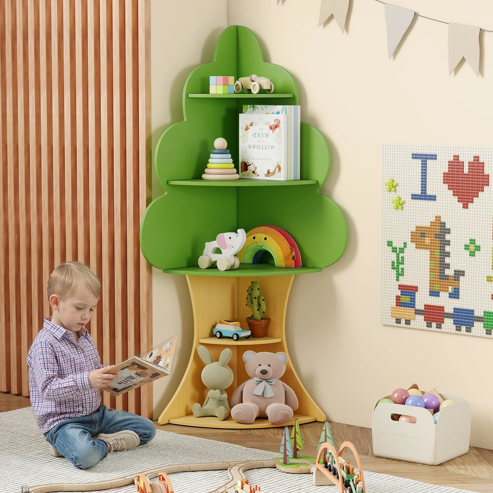 INFANS Tree Kids Bookshelf, Wood 5 - Tier Corner Bookcase, Baby Montessori Shelf Rack Children'S Bookcase, Toy and Book Toddler Storage Organizer for Preschool, Kids Room, Playroom Boy Girls Gift