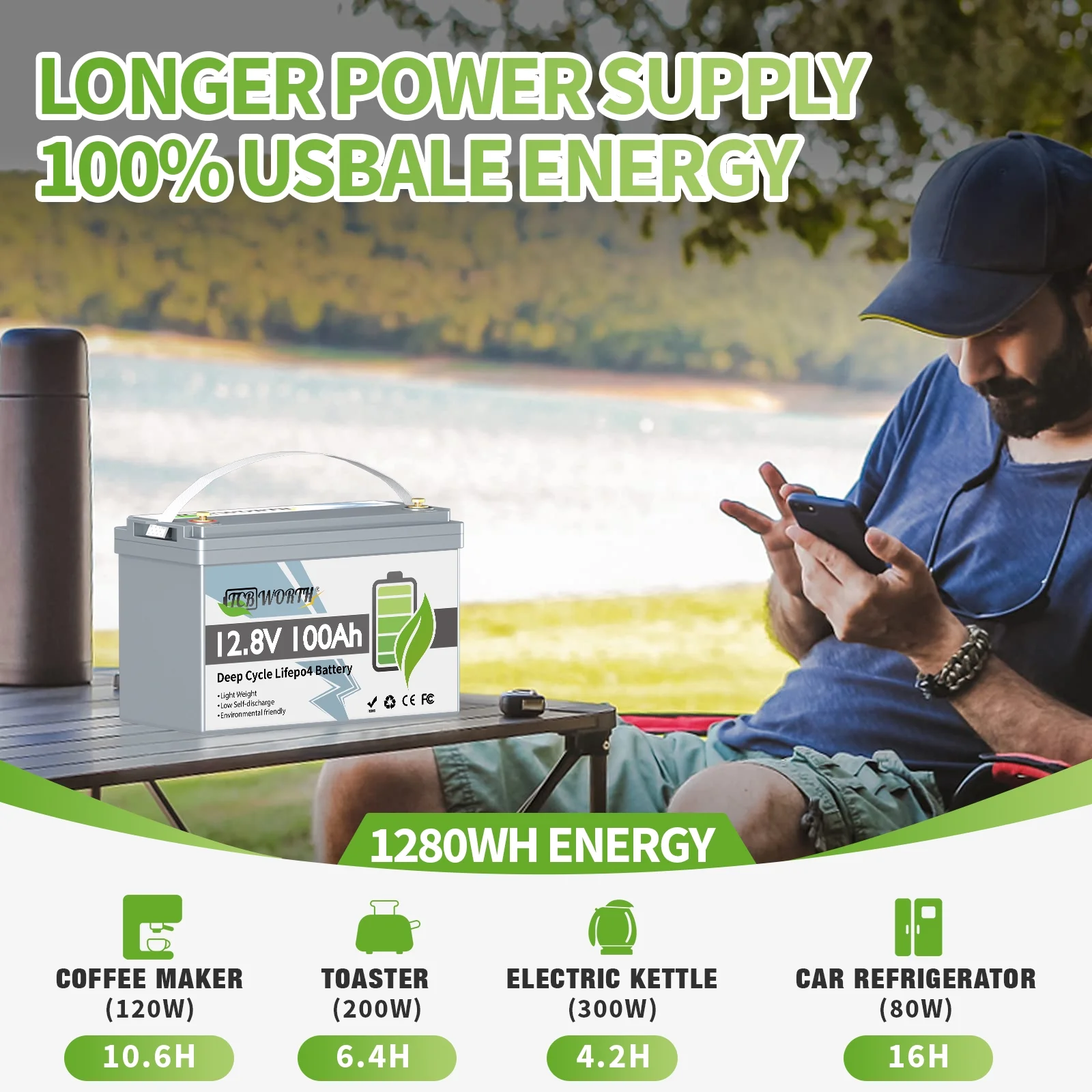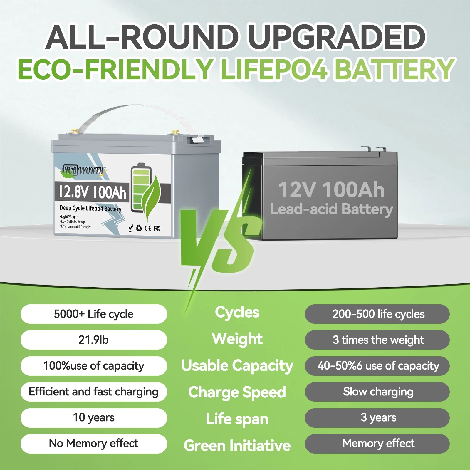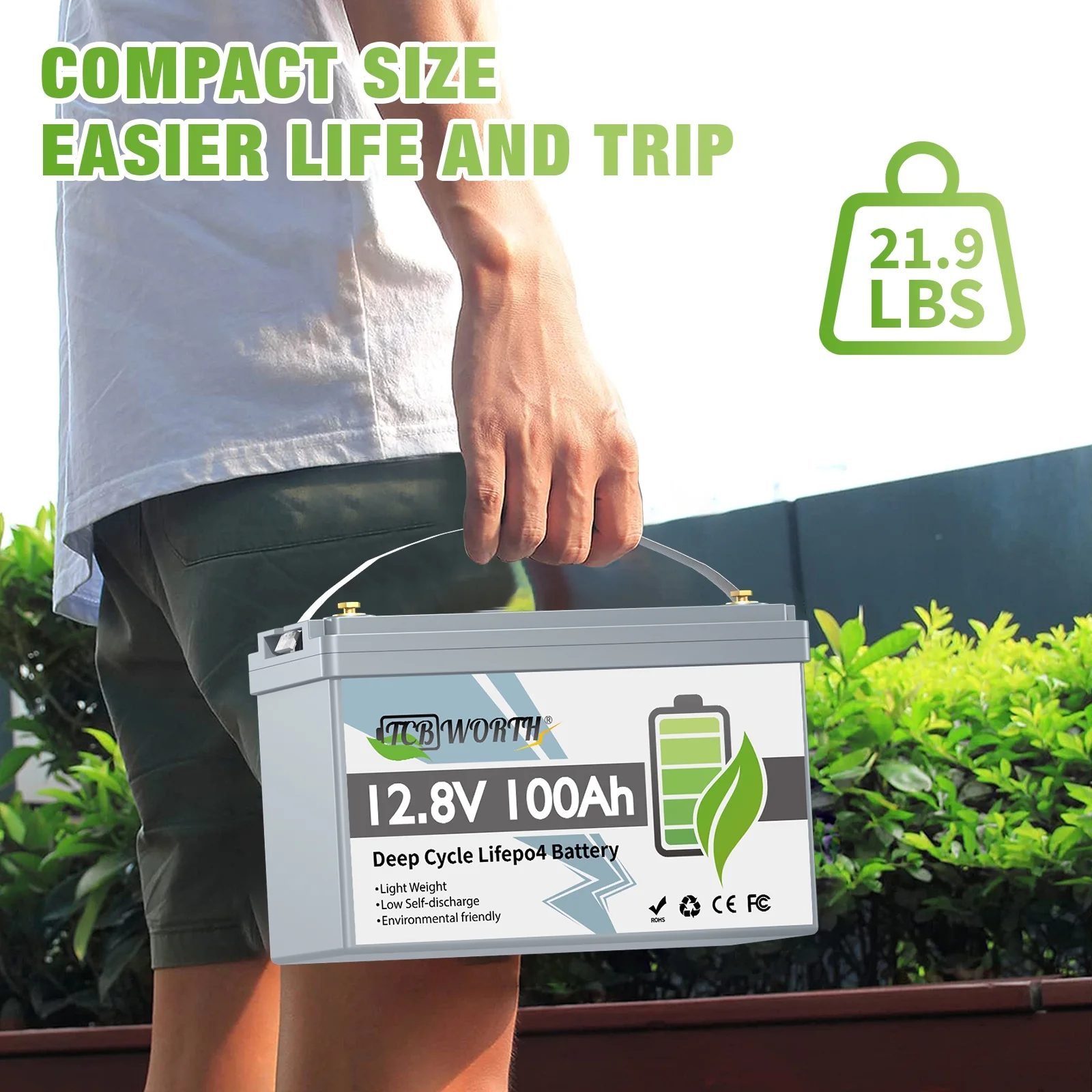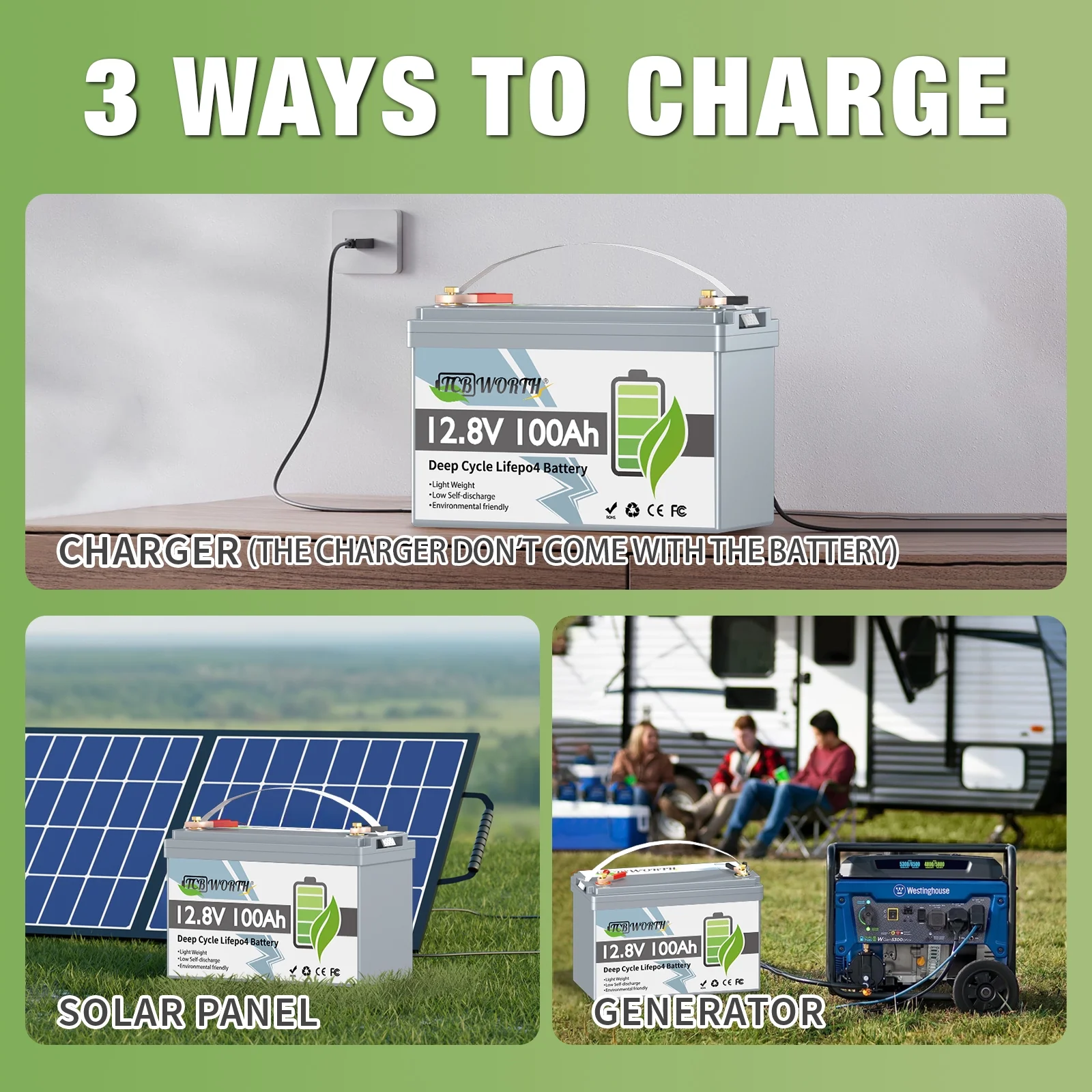 - ��Great Performance-Automotive Grade A Battery�� TCBWORTH 12.8V 100Ah LiFePO4 battery,Built-in 100A BMS with overcharge, over-discharge, over-current and short circuit,Lithium iron phosphate battery has high energy density, Long cycle life, great safety performance. LiFePO4 batteries perfect for solar homes, RVs, campers, Trolling motors, and off-grid applications.