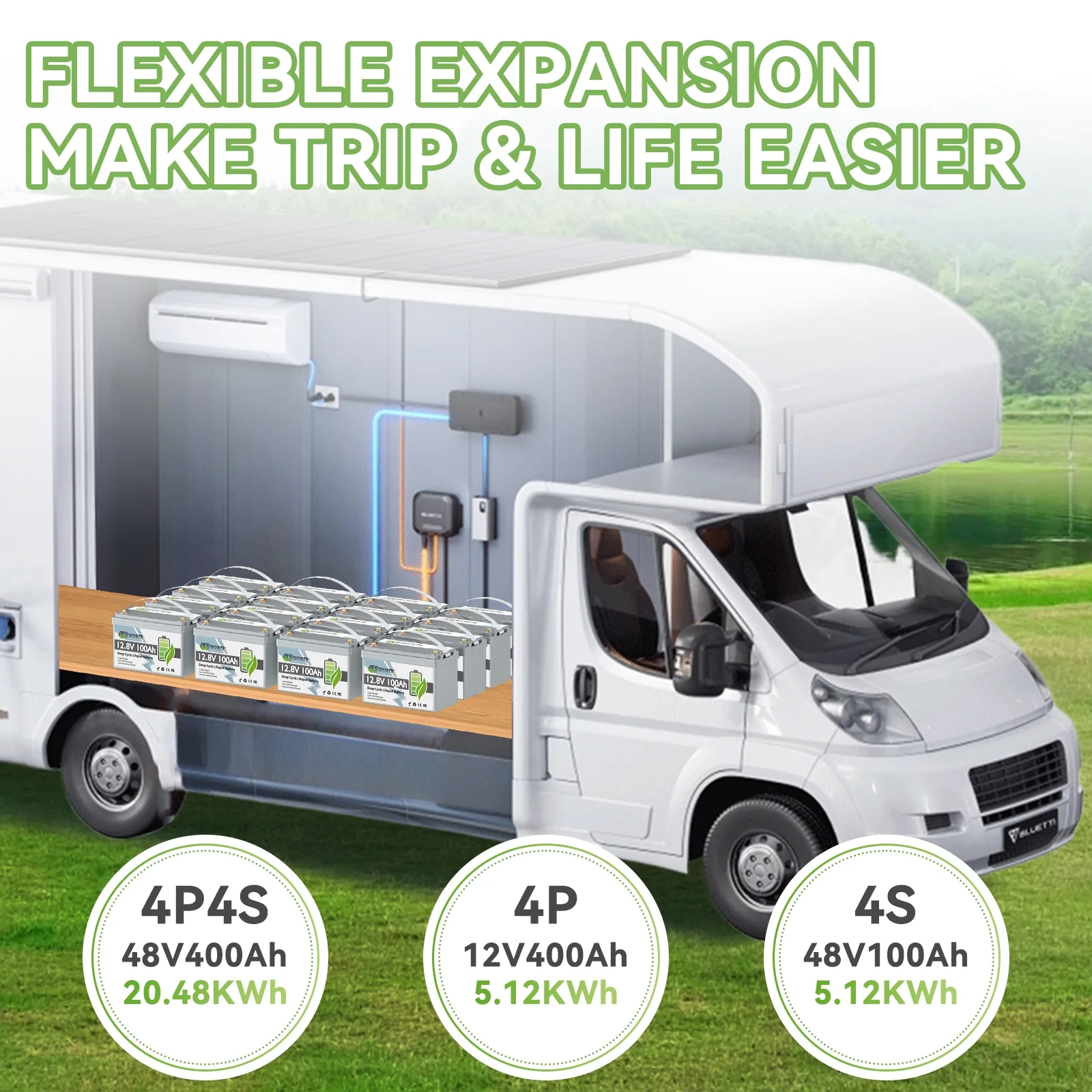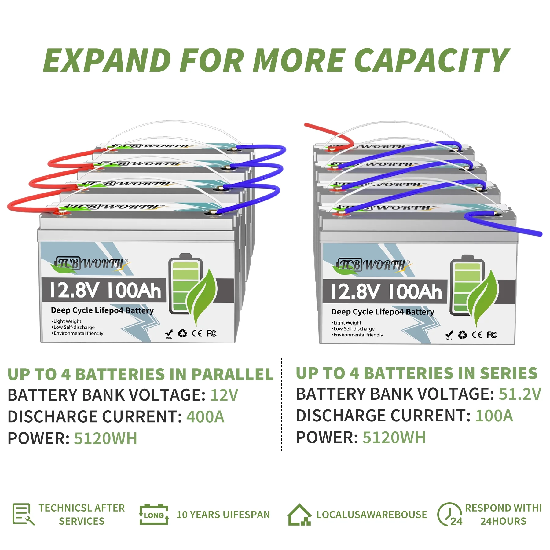 - ��Series & Parallel Connection for Larger Capacity��With a capacity of 100Ah and a Max. load power of 1280W, 12.8V 100Ah Lifepo4 Batteries support series or parallel connecting. it supports up to 4P4S for a 48V 400Ah battery system with Max. energy of 20.48kWh and Max. load power of 20.48kW, capable of powering a wide range of loads.
