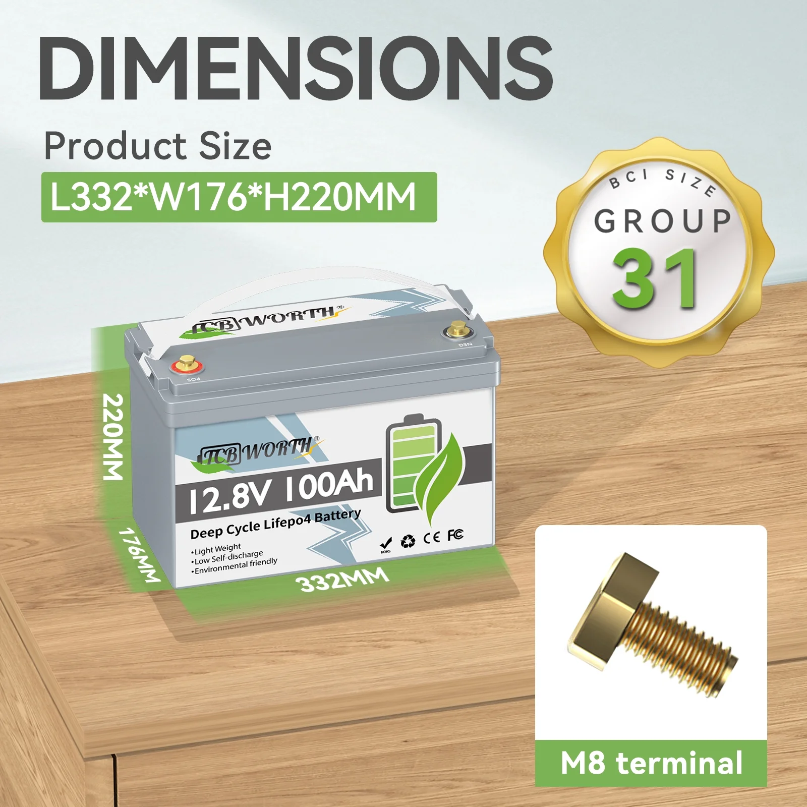 12V 100ah LiFePO4 Lithium Battery, 100A BMS, TCBWORTH BCI Group 31 Battery for RV, Solar, Marine, Camping, Trolling Motor, Off - Grid, Backup Power, Motorhome, 15000+Deep Cycles