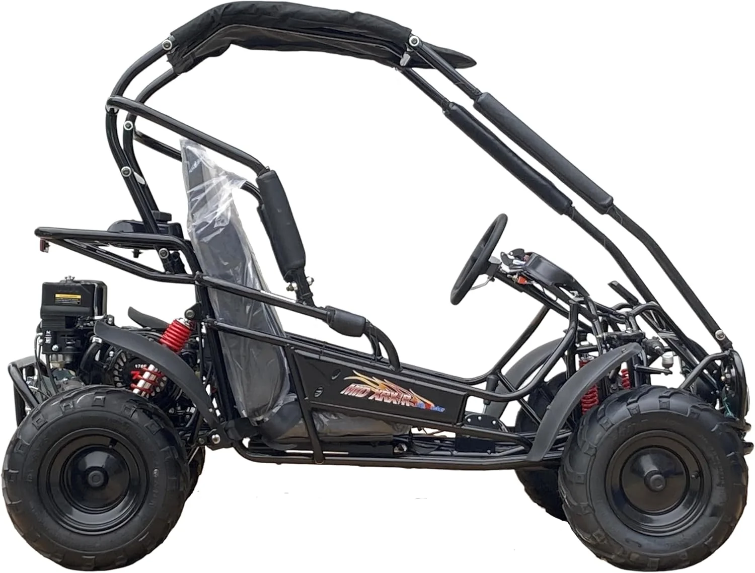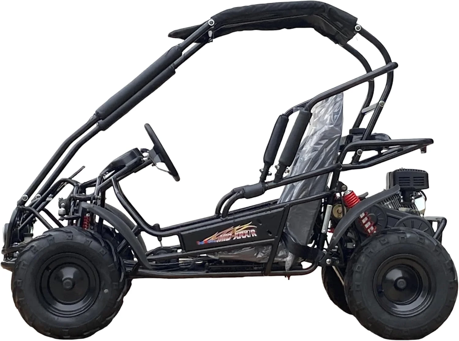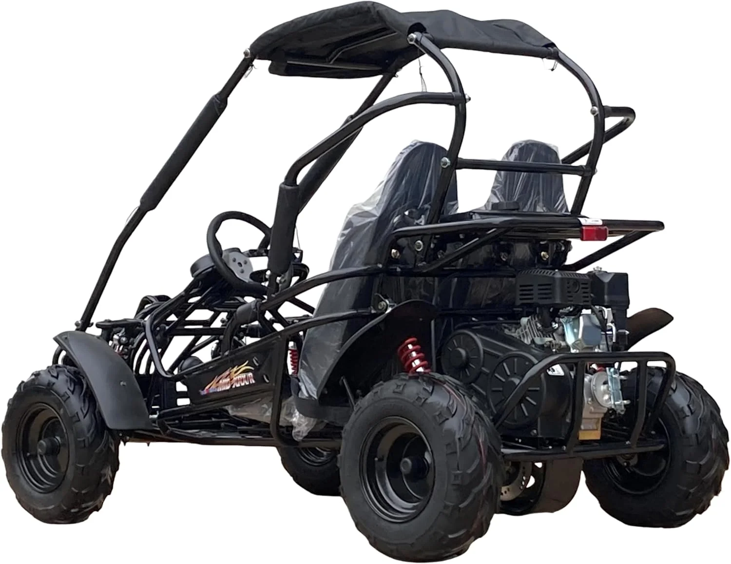 - Full roll cage and soft-top canopy for rider protection and shade