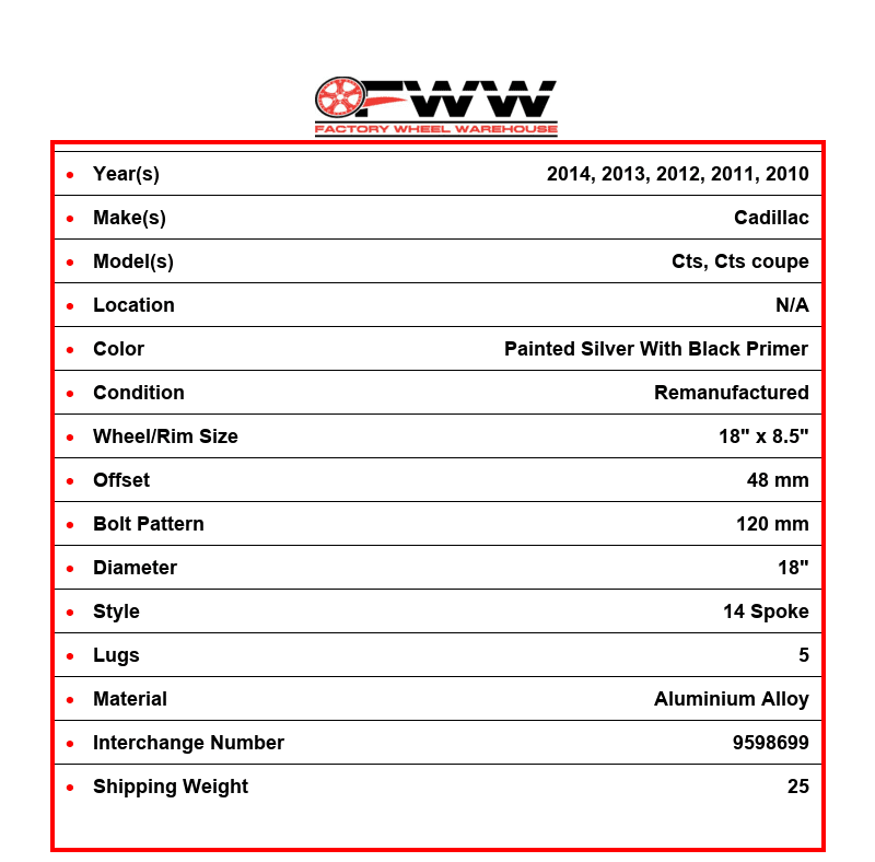 This Factory OEM CADILLAC Aluminium Alloy 14 SPOKE wheel comes stock on 2014, 2013, 2012, 2011, 2010 CADILLAC CTS COUPE, CTS. The OEM part number(s) for the rim are 22767437, 22820068, 9598699. This is a 5 lug wheel with a 18 inch diameter, width of 8.5 inch and an offset of 48 mm. The finish on the wheel is PAINTED SILVER with BLACK PRIMER.