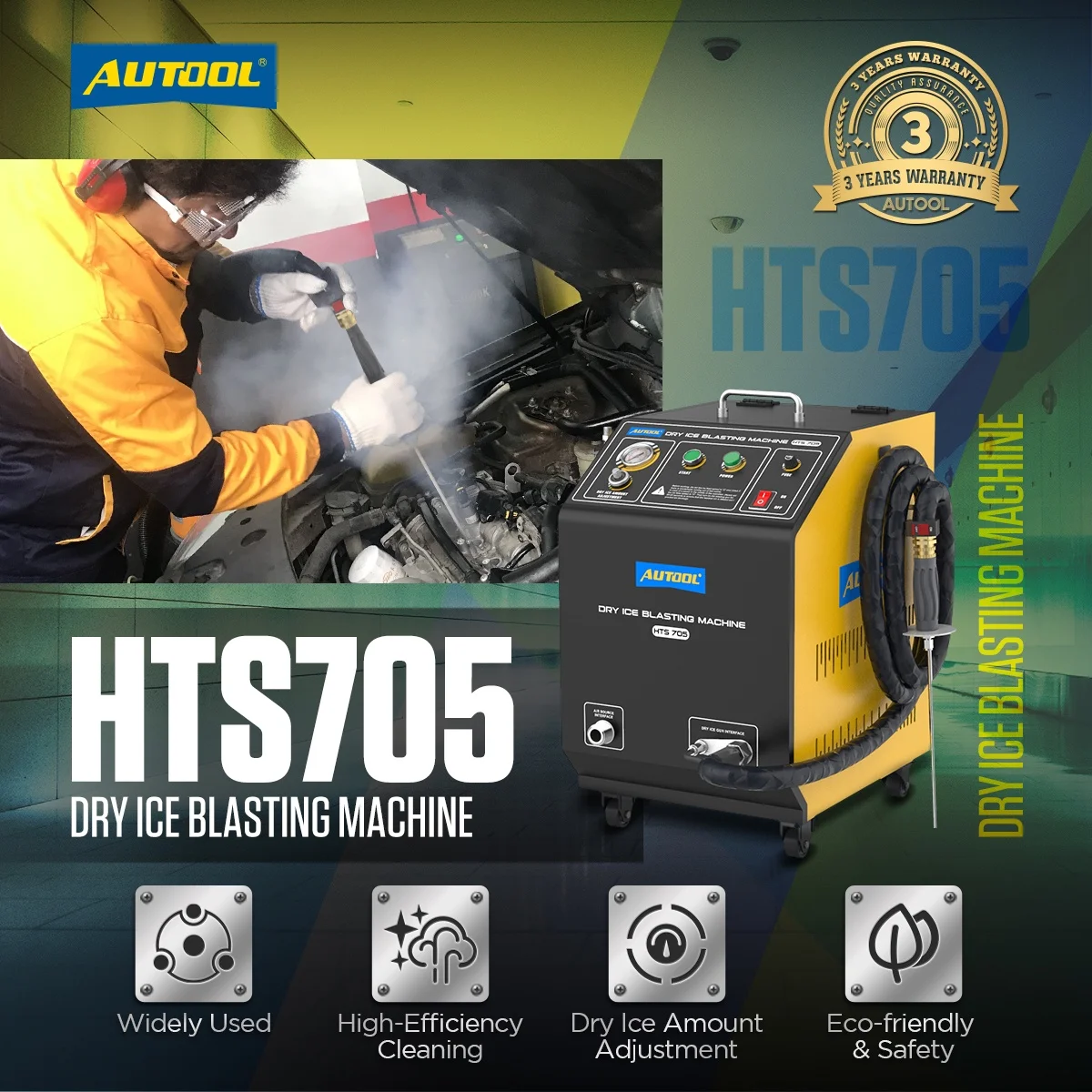 AUTOOL HTS705 Dry Ice Cleaning Machine Blaster is a cleaning machine applied in the field of automotive servicing, in which the dry ice particles are accelerated by the airflow at high speed to remove the carbon buildup. It can be used for the cleaning of carbon deposits in the engine compartment, cylinder combustion chamber, intake valve, throttle valve, and etc.performs dry ice blasting without interruptions in operation and has excellent reliability. It is brand new design and it is ready to work as long as the air pressure higher than 4 kg-f/cm2. It uses dry ice to clean dirty car surfaces under high pressure, and can obtain excellent cleaning results.With this cleaning technique, on the one hand, it can avoid production interruptions due to downtime, and on the other hand, disassembly and damage to the equipment can be reduced, which essentially protects the equipment and increases productivity.The cleaned dry ice will vaporize in the ambient, which is safe and residue-free and will not damage the vehicle.