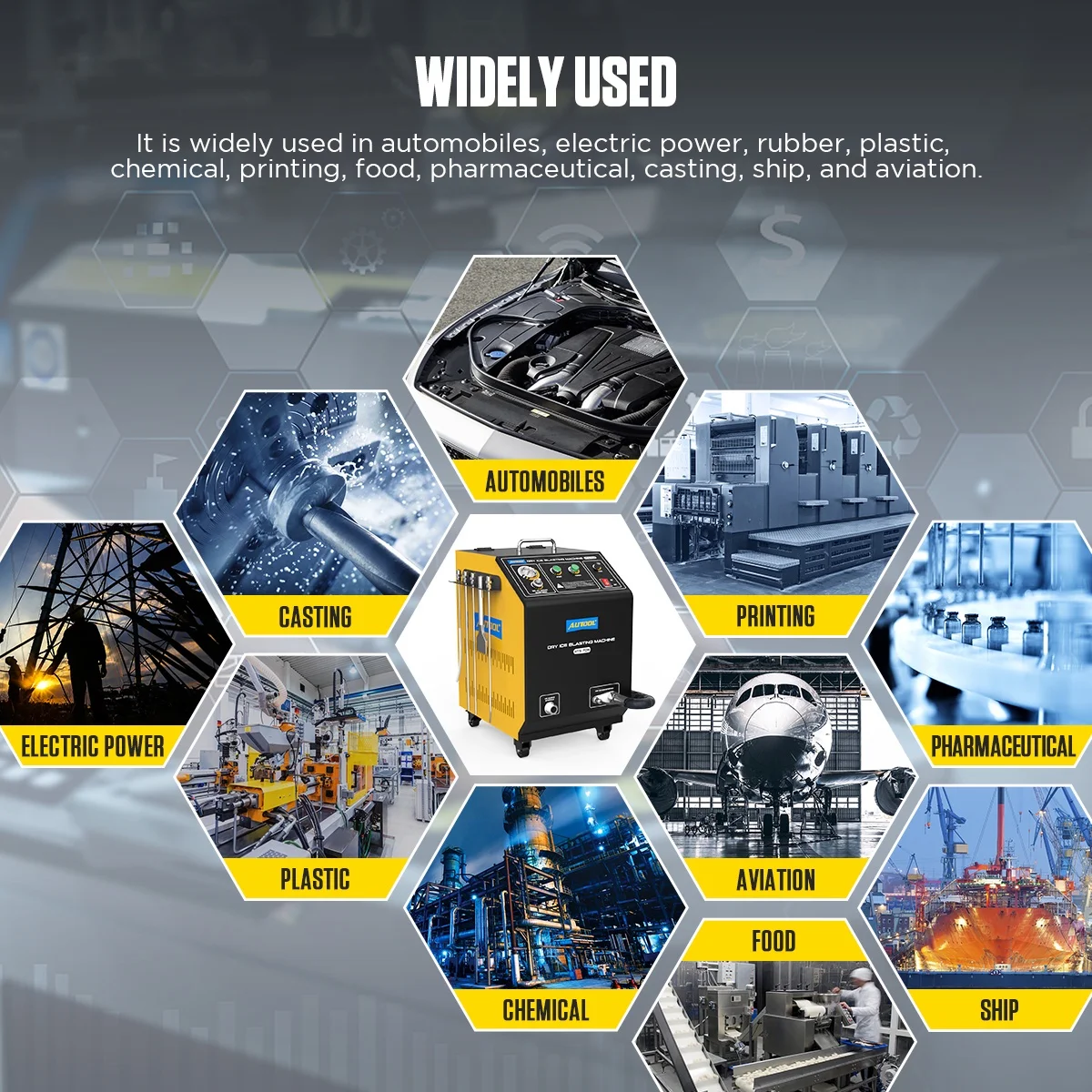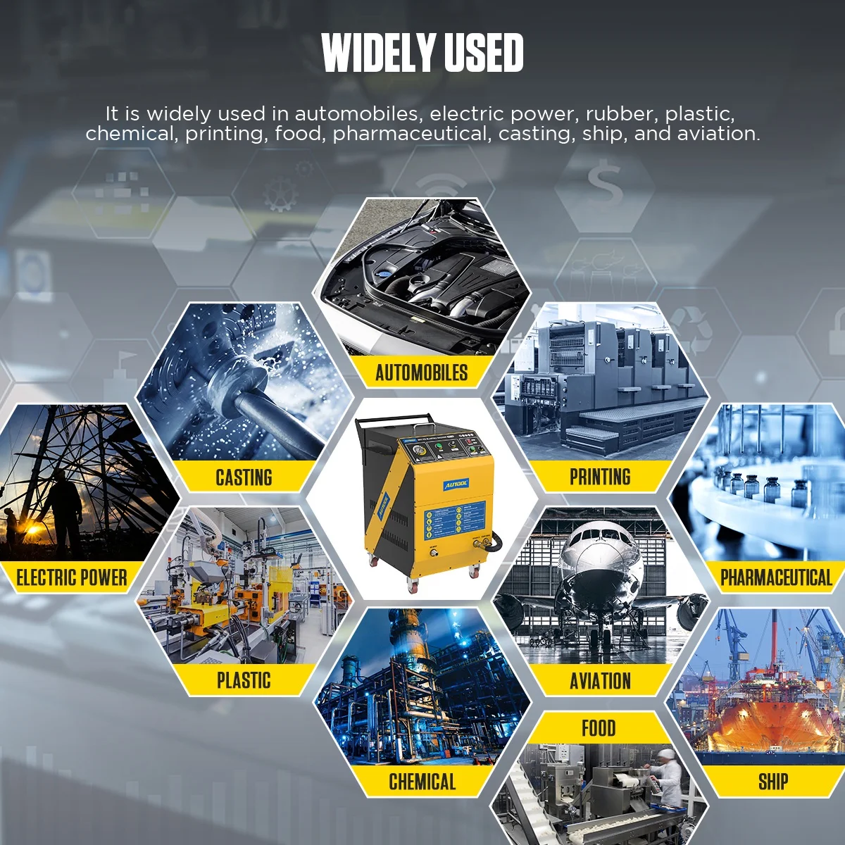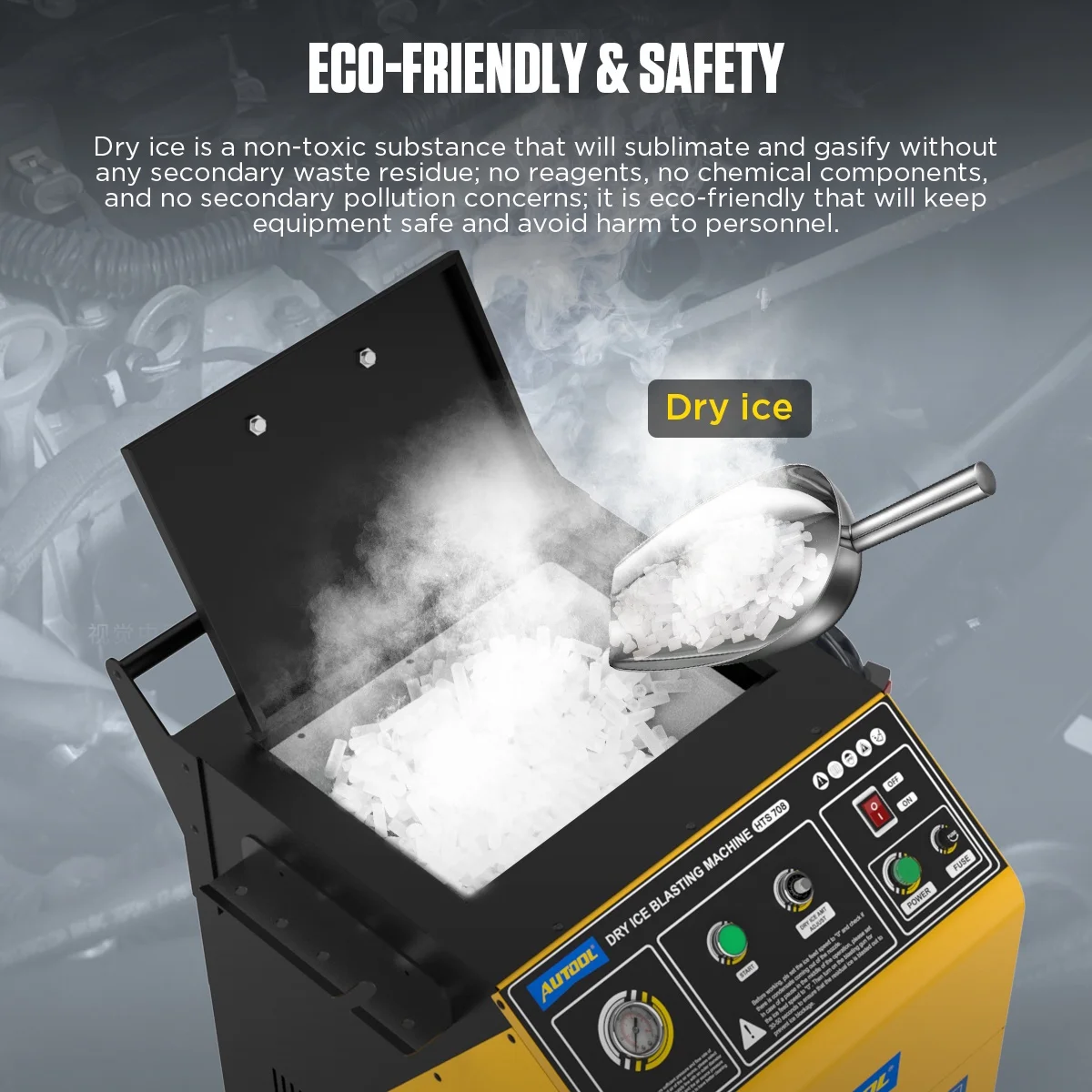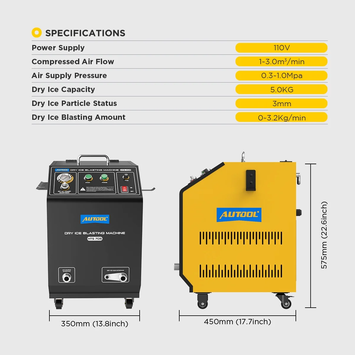 High Power Air Filtration System:The HTS705 dry ice blaster is equipped with a high power air filter that completely blocks water from entering the engine block. This keeps the dry ice pure, does not condense, and prevents ice clogging in the pipes.Spiral Ice Separation:The original spiral ice separation device stirs the dry ice to prevent dry ice from sticking and agglomerating. After the cleaning operation is started, the dry ice particles are easily transported through the ice feeding mechanism to prevent agglomeration.Safe and Harmless:The AUTOOL HTS705 automatic dry ice blaster uses dry ice particles for cleaning instead of toxic chemicals. Dry ice is a non-toxic and harmless substance that does not require the addition of any reagents and chemicals, which can greatly ensure the safe use of the equipment and avoid harm to the user's body.Efficient cleaning:AUTOOL HTS705 car dry ice cleaning machine accelerates the impact and instantaneous explosion of dry ice particles through high-pressure airflow, quickly removes all kinds of stubborn carbon deposits, and can fully and thoroughly clean the carbon deposits in all parts of the vehicle (such as throttle, intake valve, engine parts, cylinder combustion chamber, etc.) without disassembling vehicle parts. It has high cleaning efficiency and good cleaning effect. Under normal circumstances, the dry ice consumption is: 4~8 kg, and the cleaning time is: 5~10 minutes (excluding disassembly time).Wide Range of Applications:AUTOOL HTS705 car dry ice cleaning machine is very suitable for use in the fields of automobiles, electricity, rubber, plastics, chemicals, printing, food, pharmaceuticals, casting, ships and aviation, not limited to automobile repairs. -