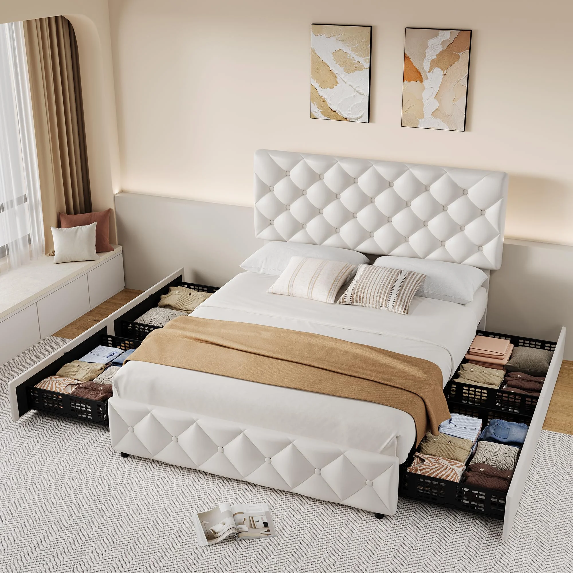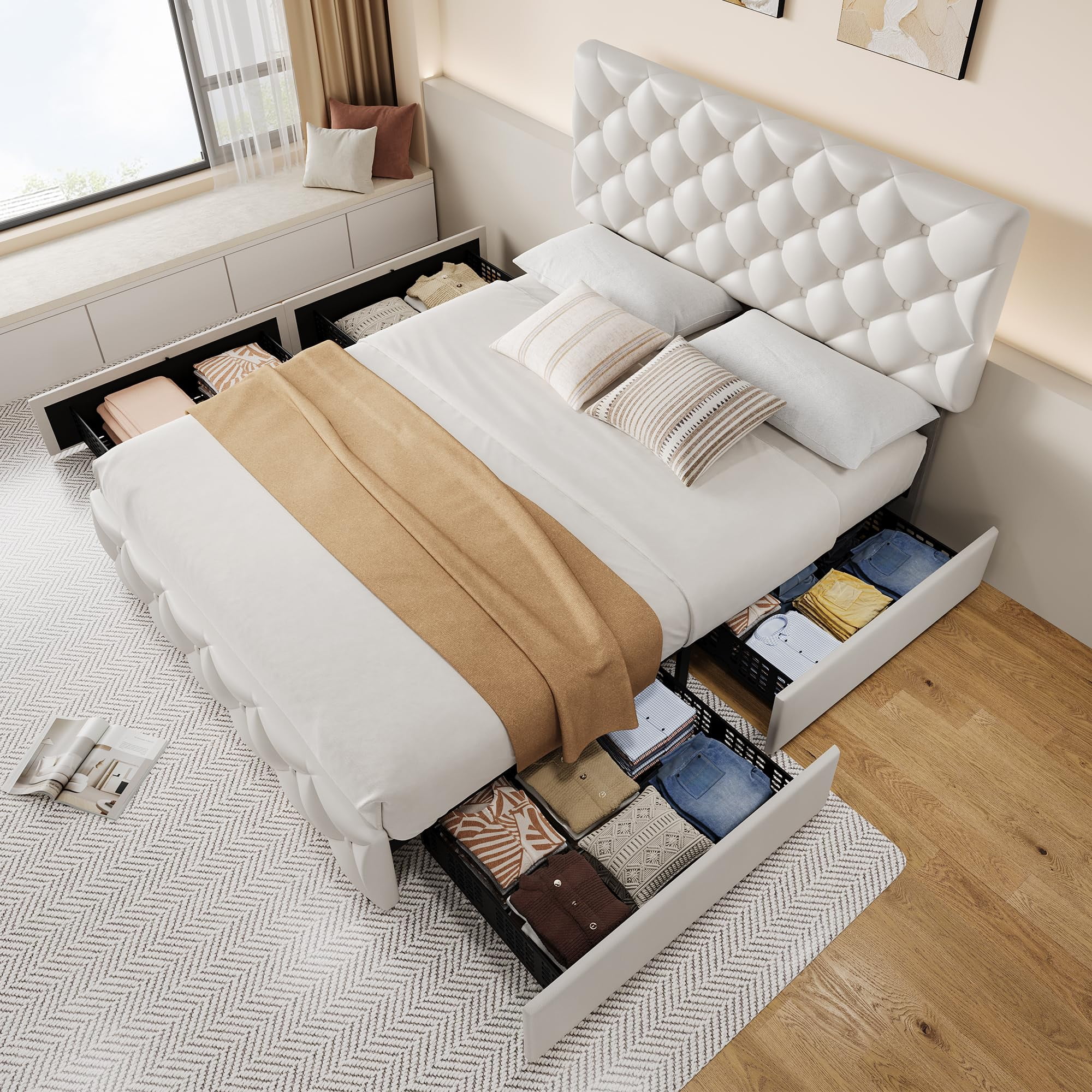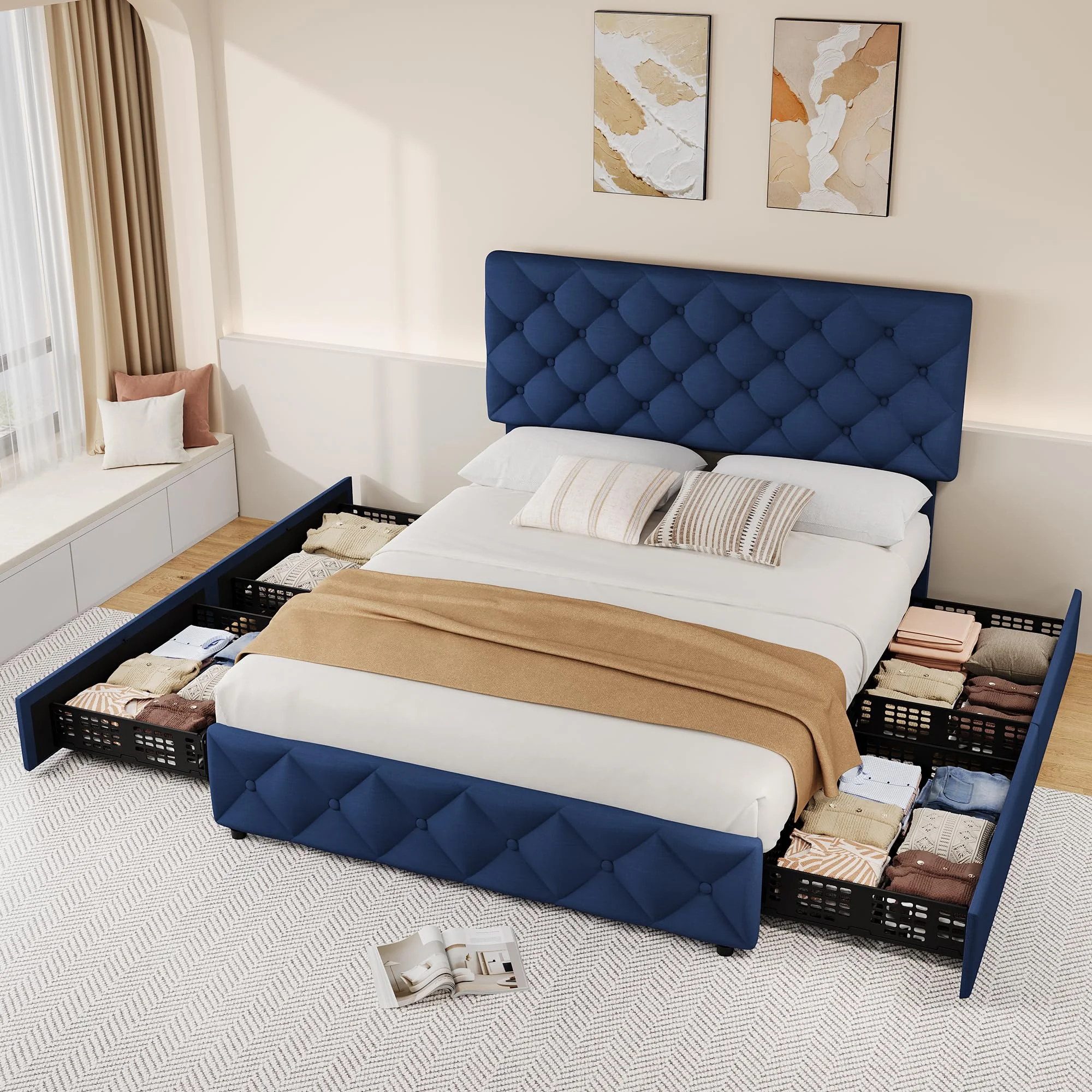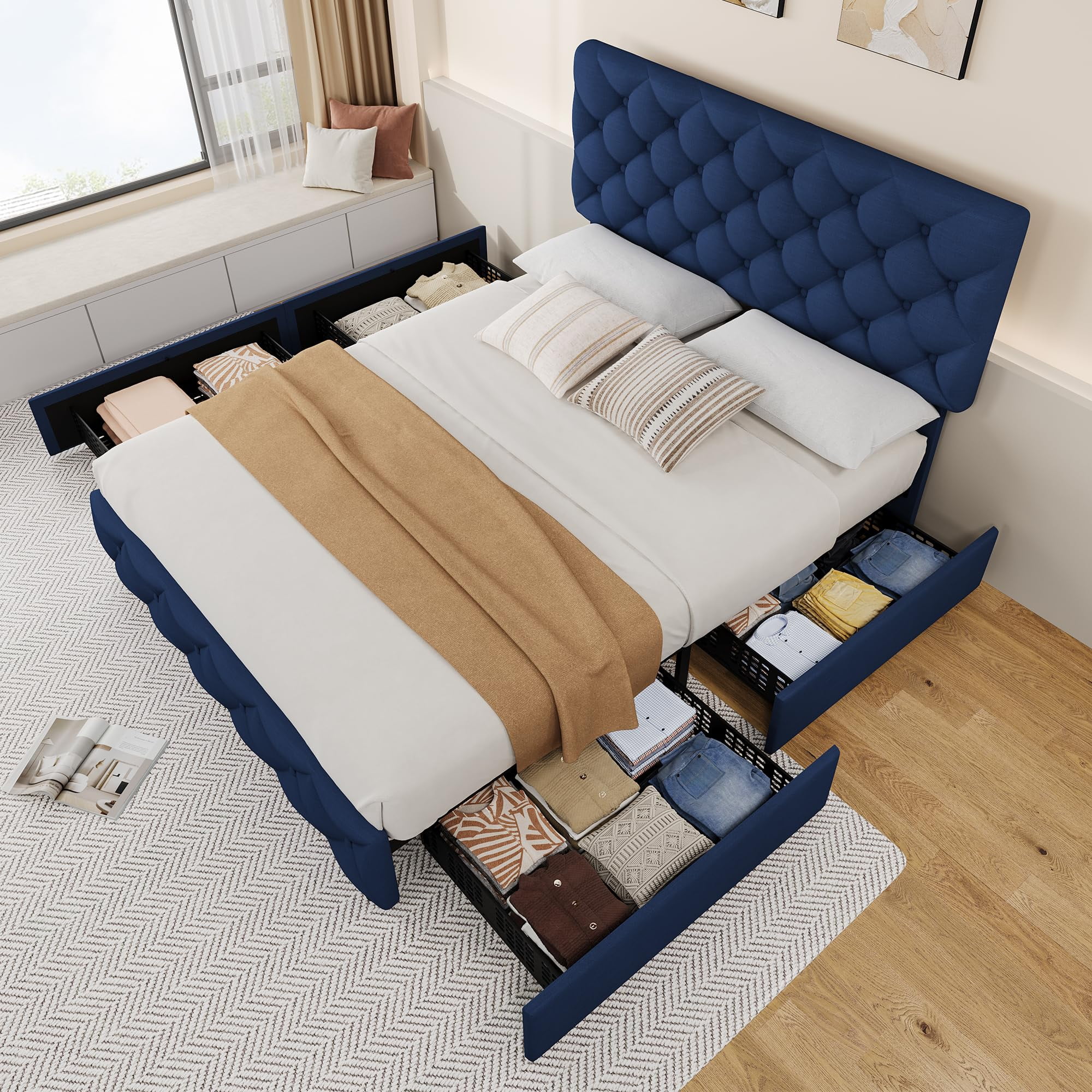 - 4 Storage Drawers: The bed frame includes four spacious drawers (27.6��L x 19.7��W x 5.5��H), perfect for storing clothes, bedding, or other essentials. The drawers are designed with smooth-rolling wheels and a secure fixture system, preventing them from sliding out of place. The bottom of each drawer is perforated, making it ideal for storing smaller items.