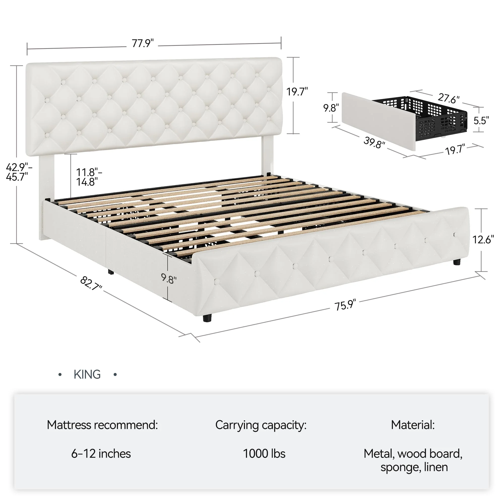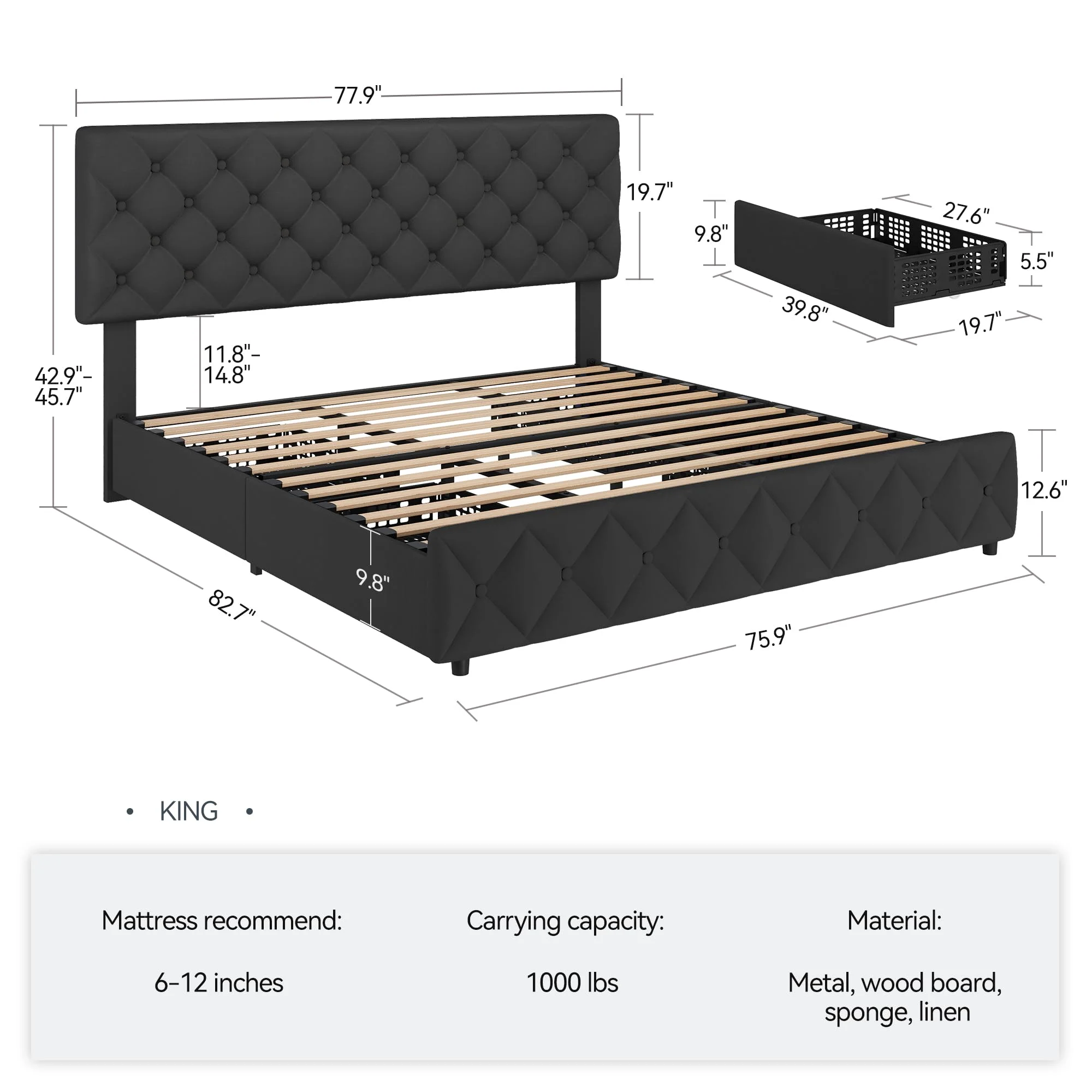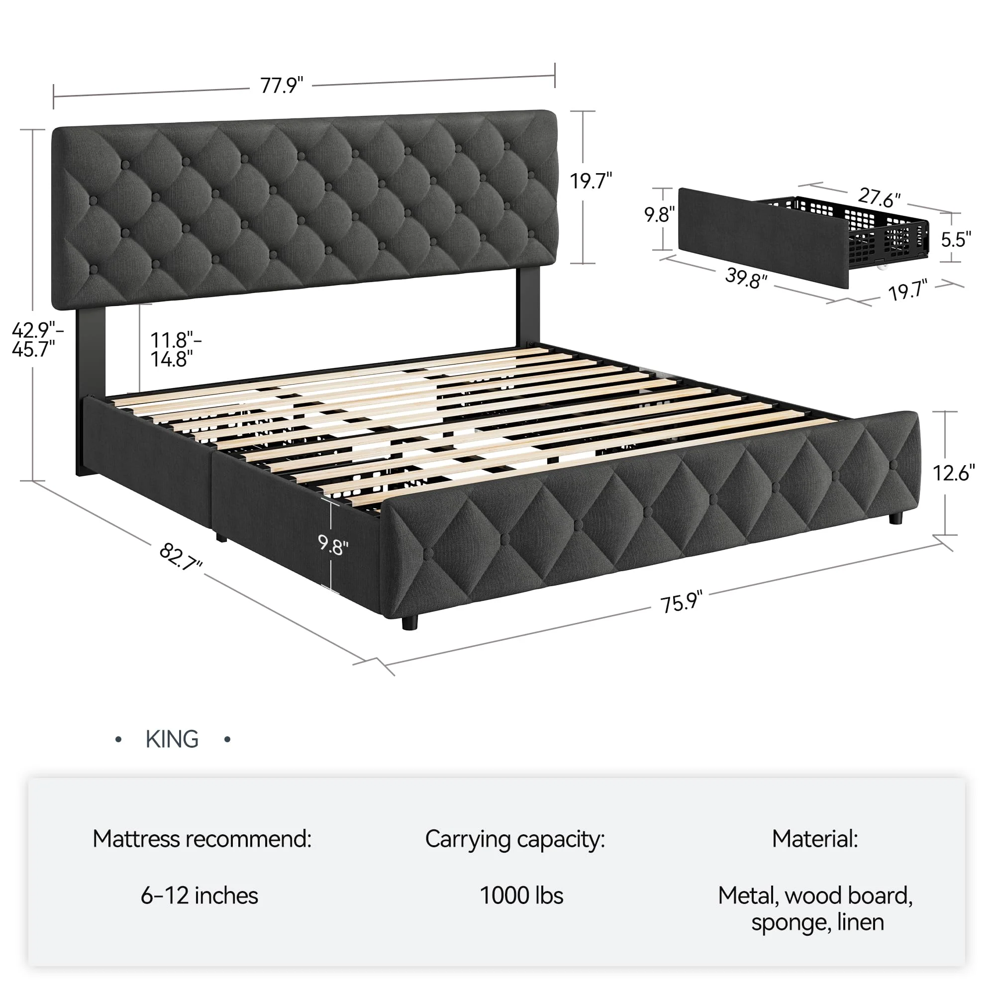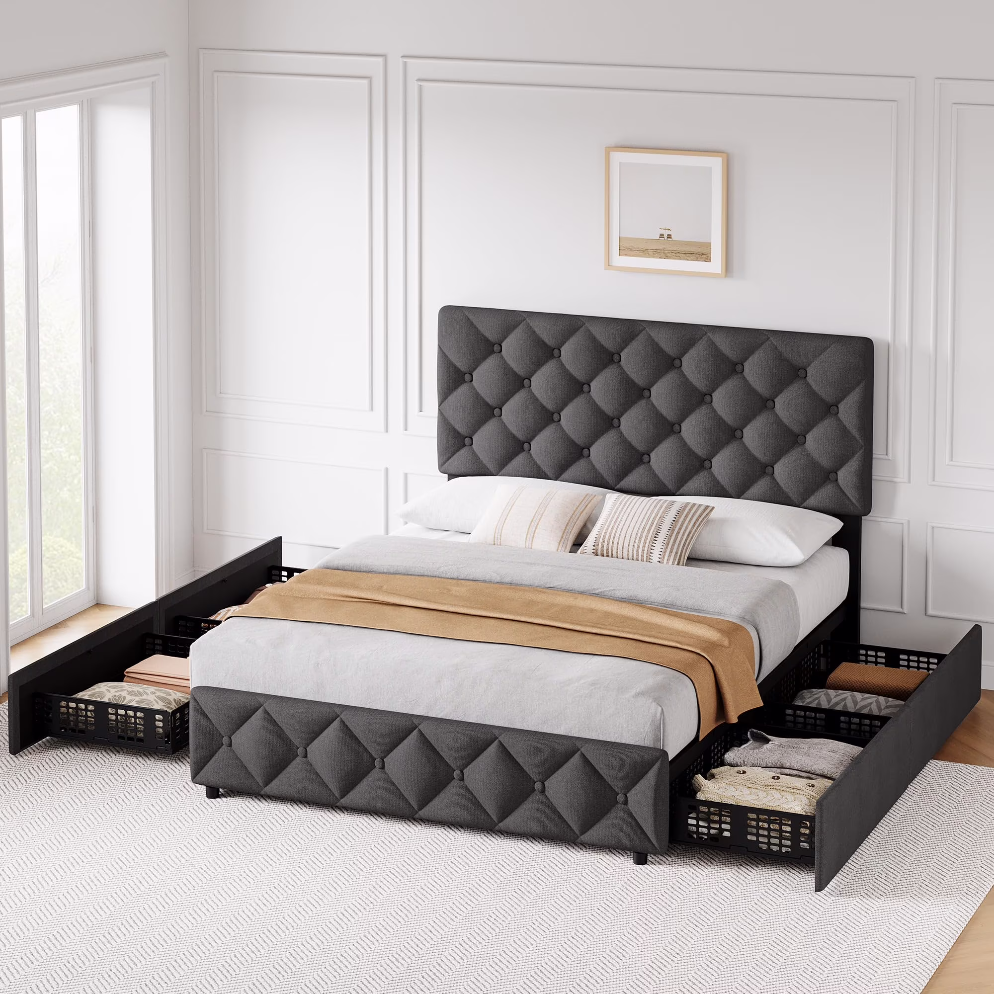 - 4 Storage Drawers: The bed frame includes four spacious drawers (27.6��L x 19.7��W x 5.5��H), perfect for storing clothes, bedding, or other essentials. The drawers are designed with smooth-rolling wheels and a secure fixture system, preventing them from sliding out of place. The bottom of each drawer is perforated, making it ideal for storing smaller items.