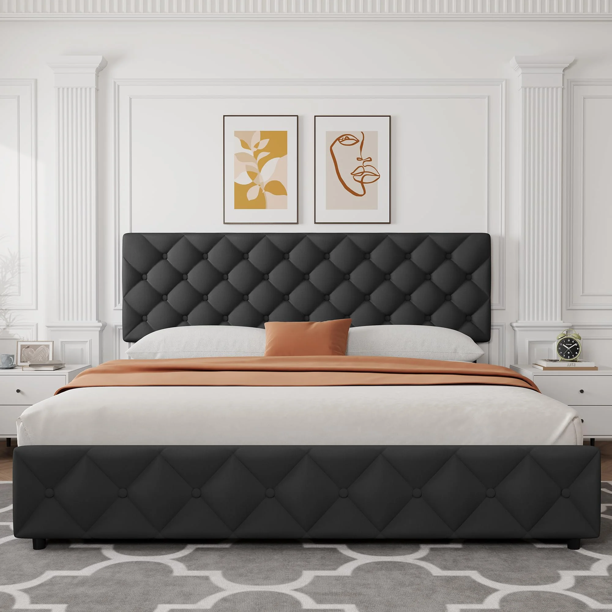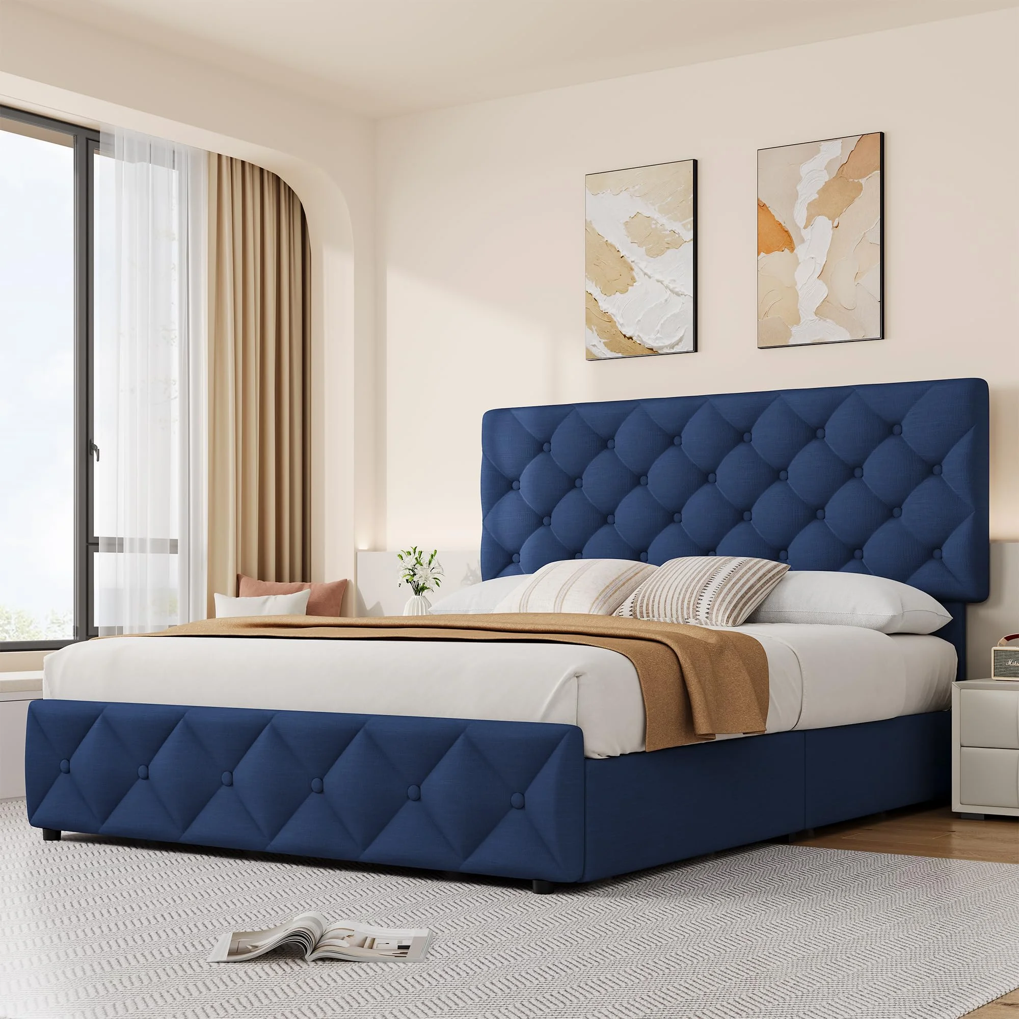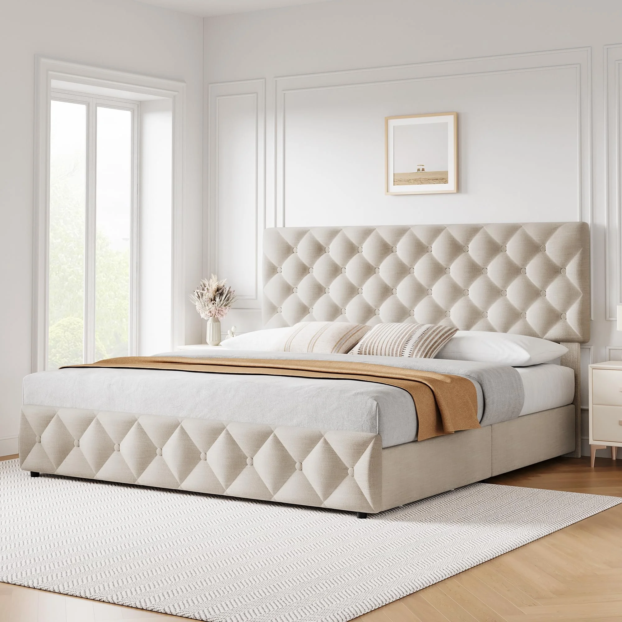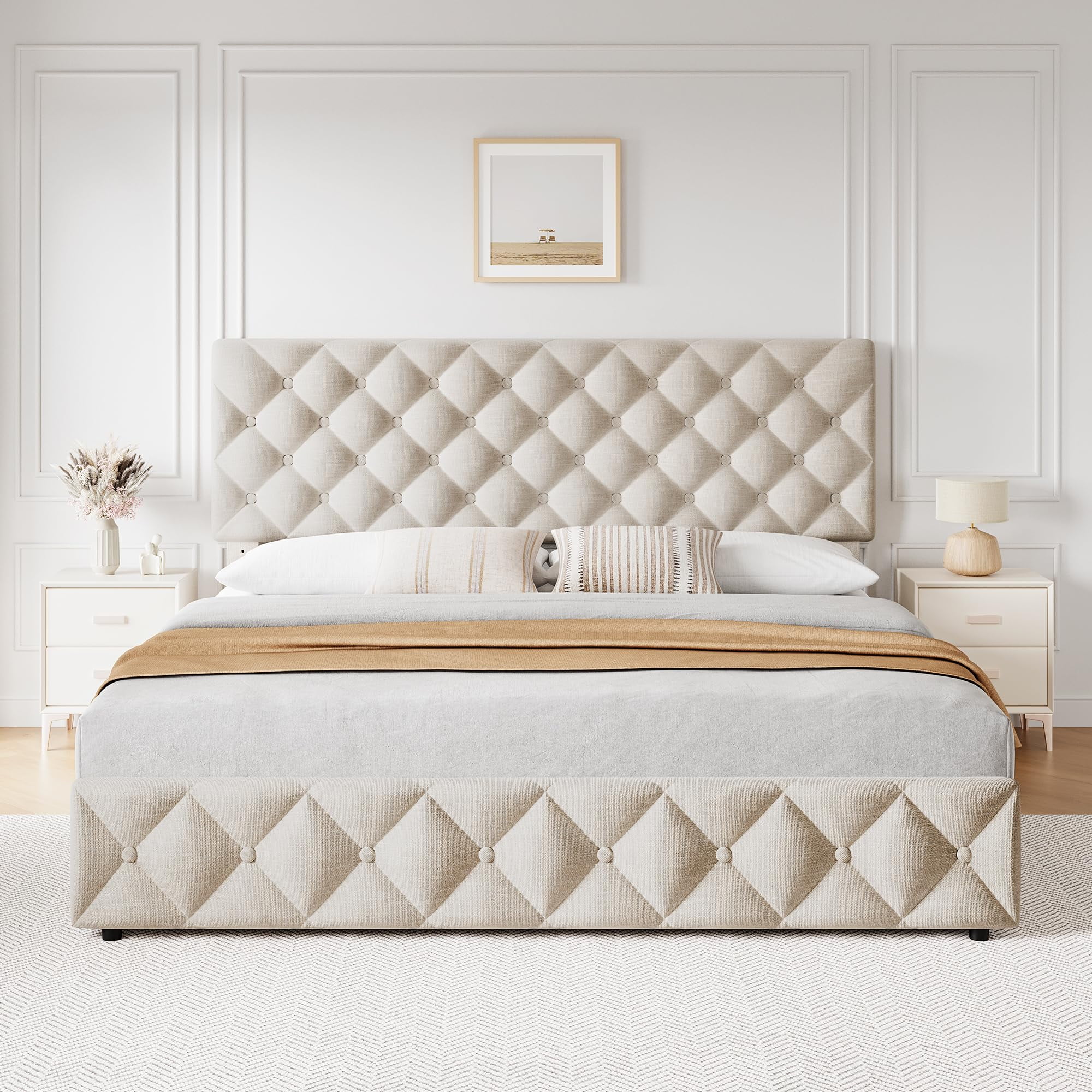 Elevate your bedroom with our Linen Upholstered Platform Bed Frame featuring an elegant diamond-stitched button tufted design. This modern bed frame is designed to offer both style and functionality with its adjustable headboard, convenient storage drawers, and sturdy construction. Ideal for maximizing space, the platform bed eliminates the need for a box spring and provides a sleek, noise-free sleep environment.