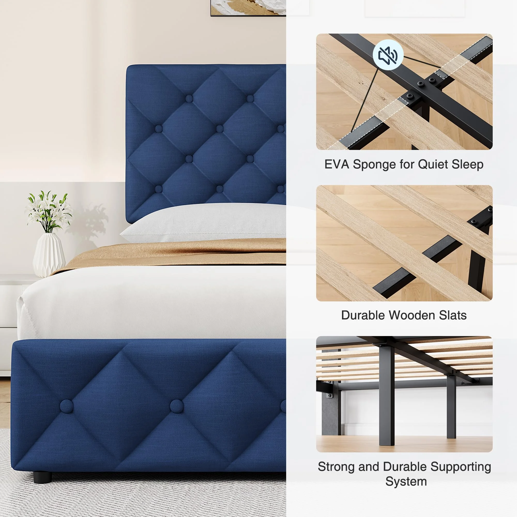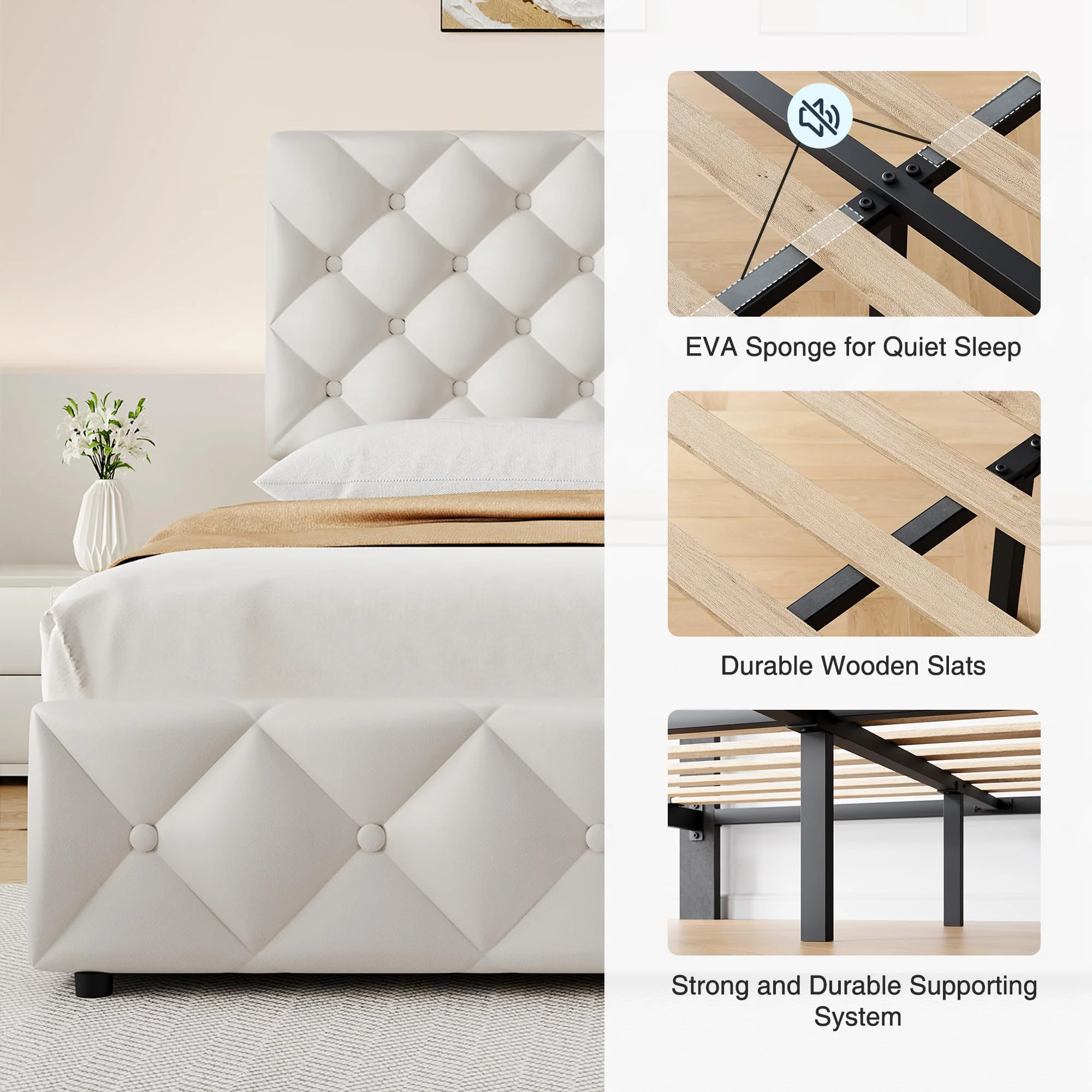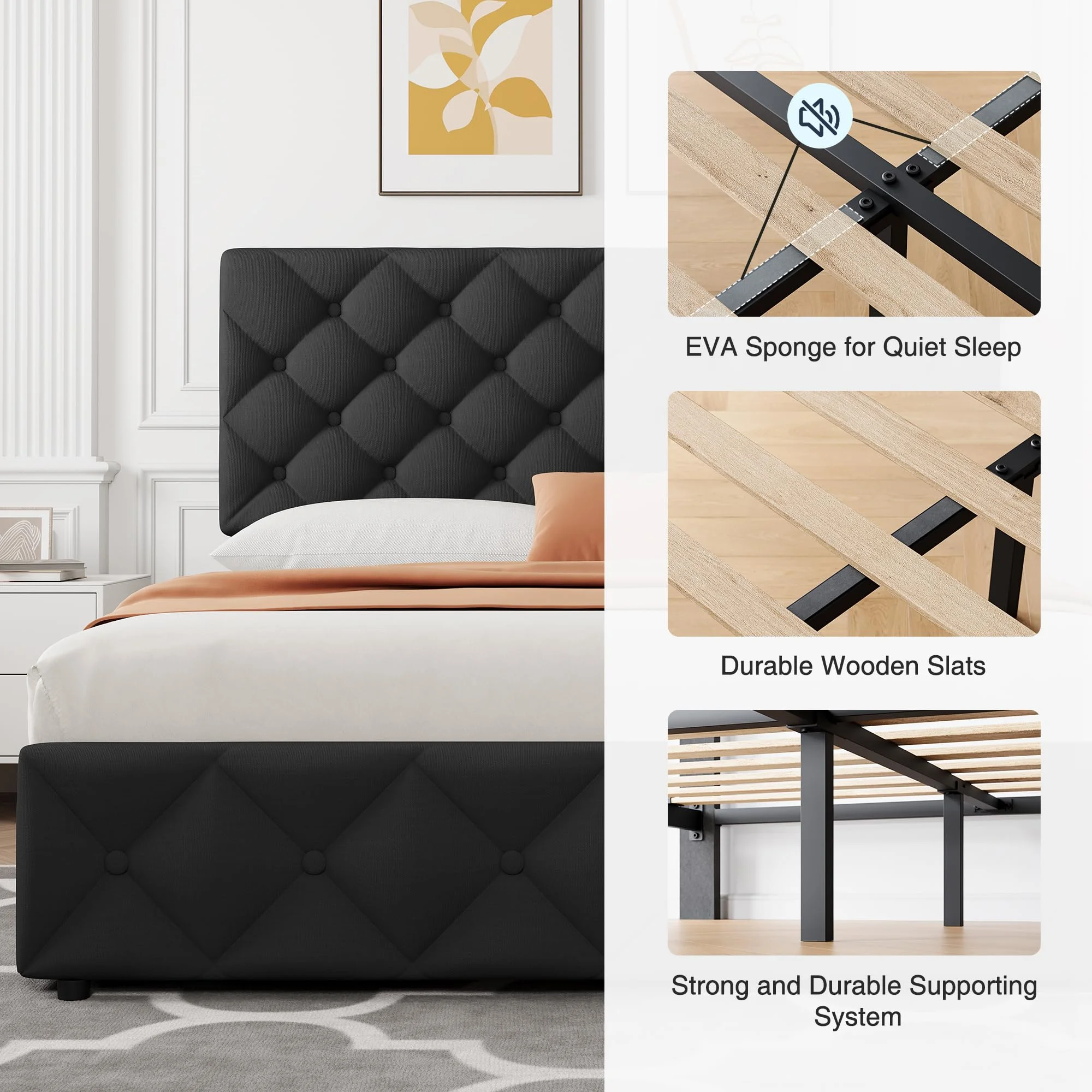 - Sturdy & Quiet Construction: Featuring 12 wooden slats and additional EVA sponge strips, this bed frame provides maximum stability and reduces noise, ensuring a quiet, restful night's sleep. The frame can support up to 1000 pounds, making it suitable for adults, children, and even pets.