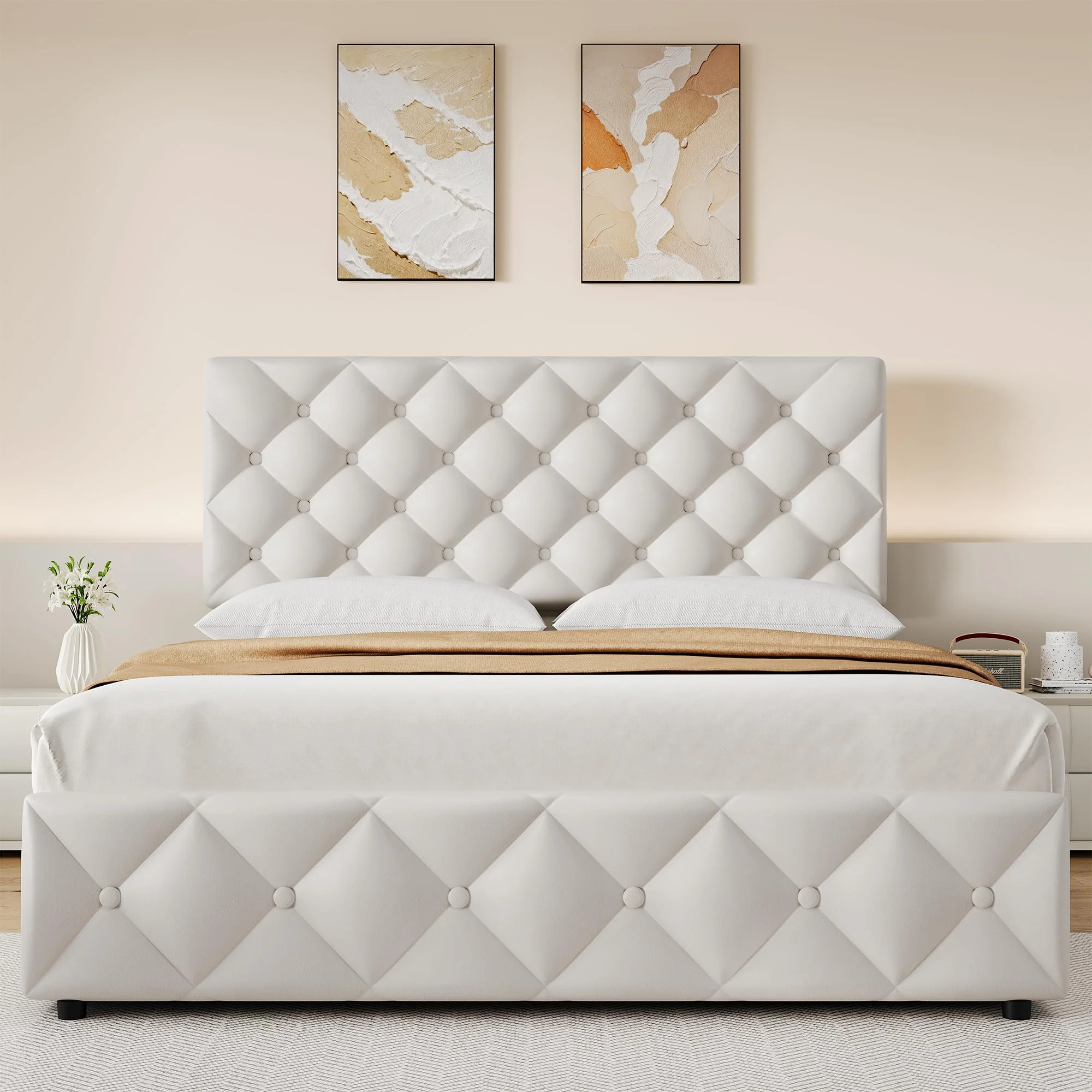 TROPOW Full Size Bed Frame, with 4 Storage Drawers and Adjustable Headboard, Linen Upholstered Platform Bed Frame, Diamond Stitched Button Tufted, No Box Spring Needed, White
