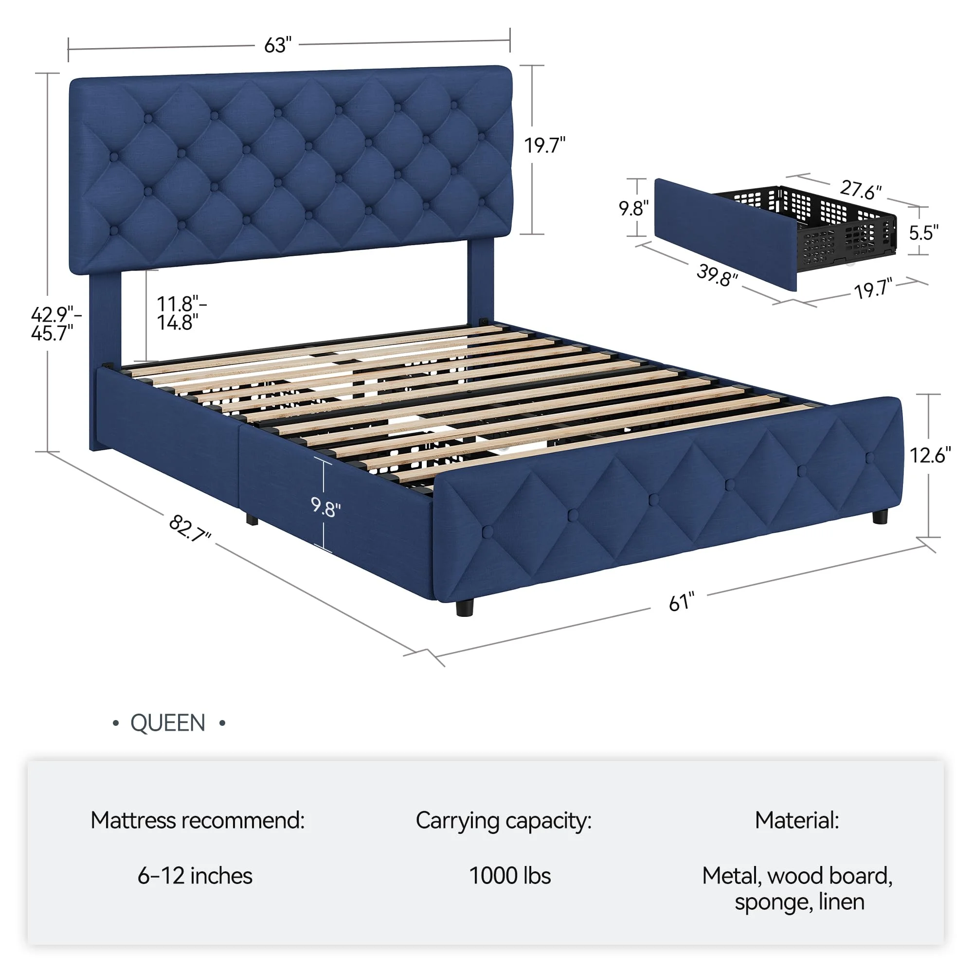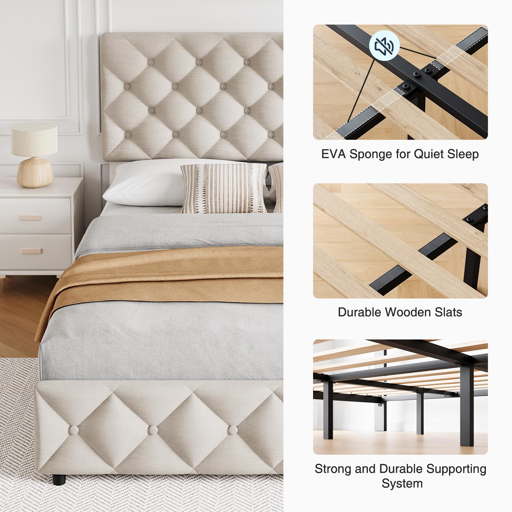 - Comfort & Aesthetic Appeal: The soft, padded headboard offers comfortable support for sitting up in bed, while the diamond-stitched button tufting adds a touch of sophistication to any bedroom decor. The linen fabric finish enhances the modern look, making this bed frame both functional and stylish.