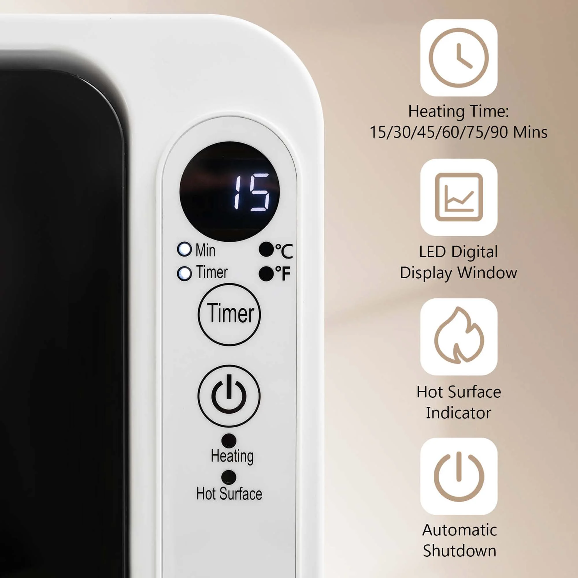 - User-friendly Controls: Tailor your heating preferences with adjustable settings ranging from 15 to 90 minutes through an easy-to-use LED digital display window. Moreover, the hot surface indicator ensures added safety, making it a user-centric device.