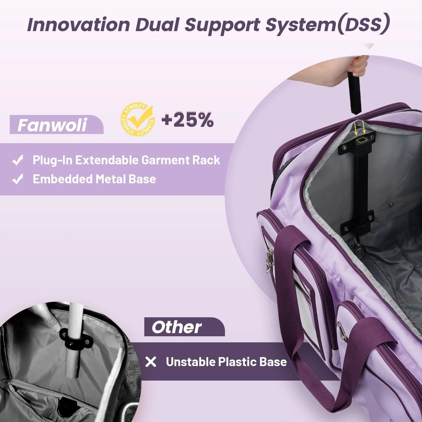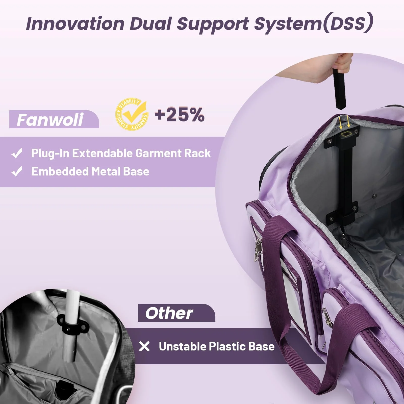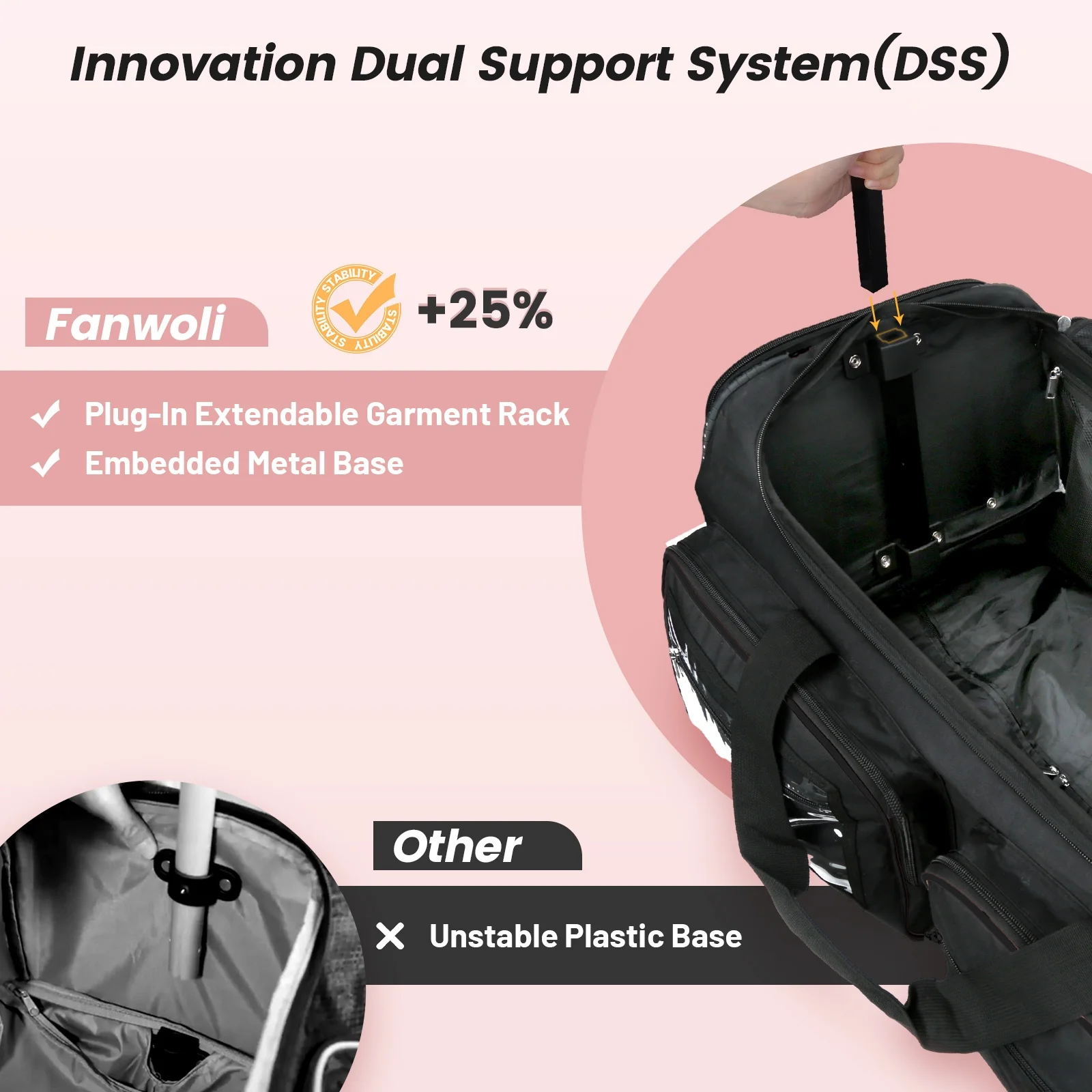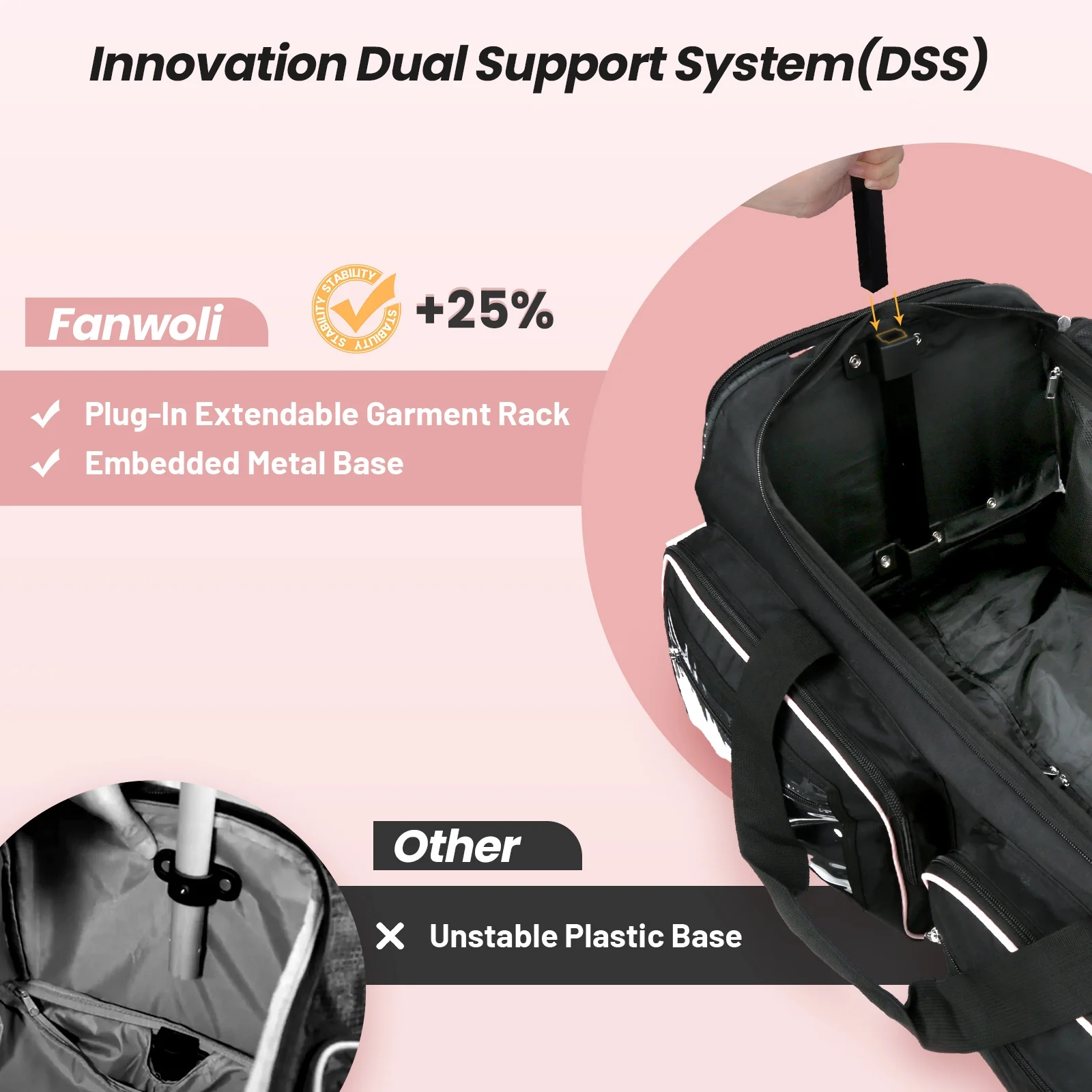 - ��DURABLE MATERIAL��: This dance costume bag is the pragmatist's dream - our enhanced anti tipping design features a stable Dual Support System (Embedded metal base and the extendable rack), which increases stability by 25% compared to the other bag without a base. Crafted from water-resistant 300D Oxford cloth composite PVC to withstand even the toughest travel conditions. An ideal dance bag that is durable enough to witness all your competitions and awards.