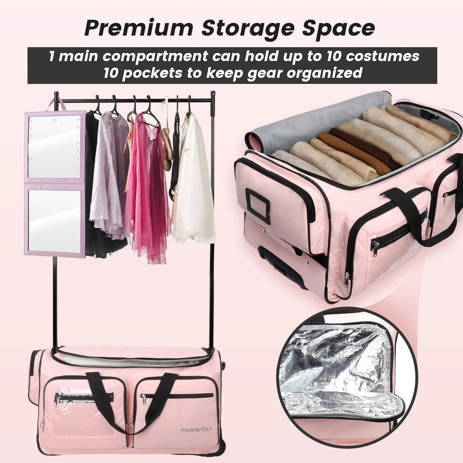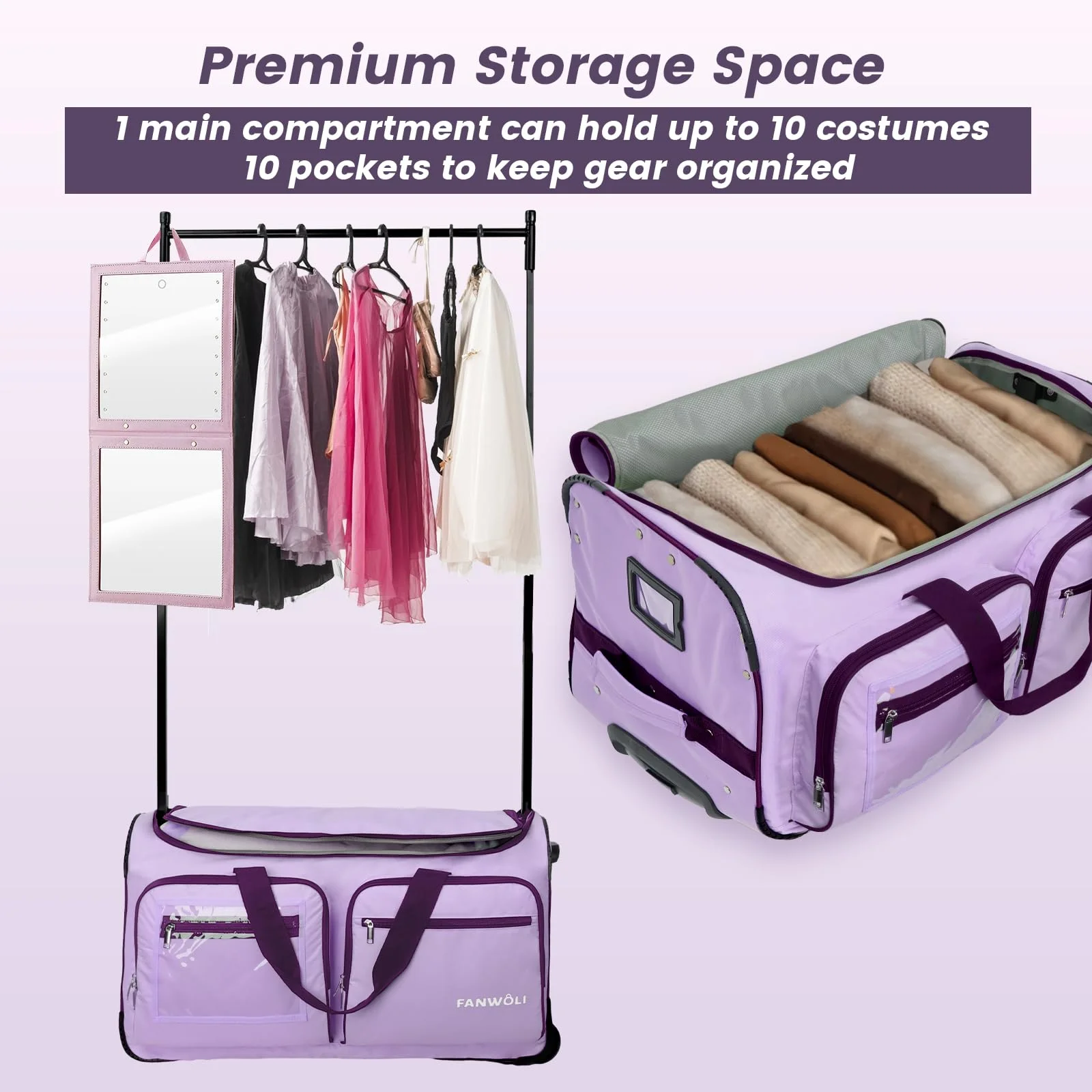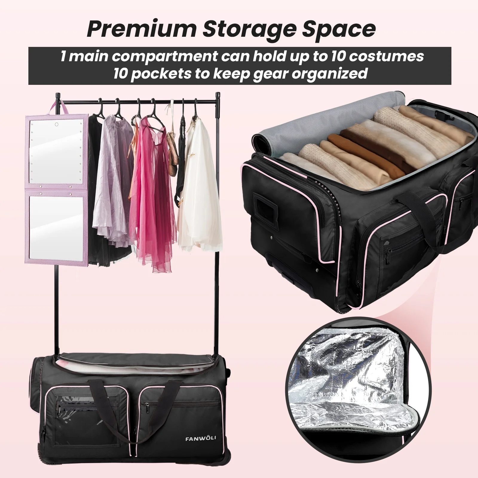 - ��PORTABLE DANCE BAG����Keep all your dance essentials organized in one place with this garment bag for travel. Don't let the hassle of transporting dance gear slow you down. This professional dancer favorite rolling garment bag with Dual-Level aluminum alloy handle and silent wheels makes participating in performances and competitions in one city after another seriously easy. Dancers should focus their time on the stage and their dreams.