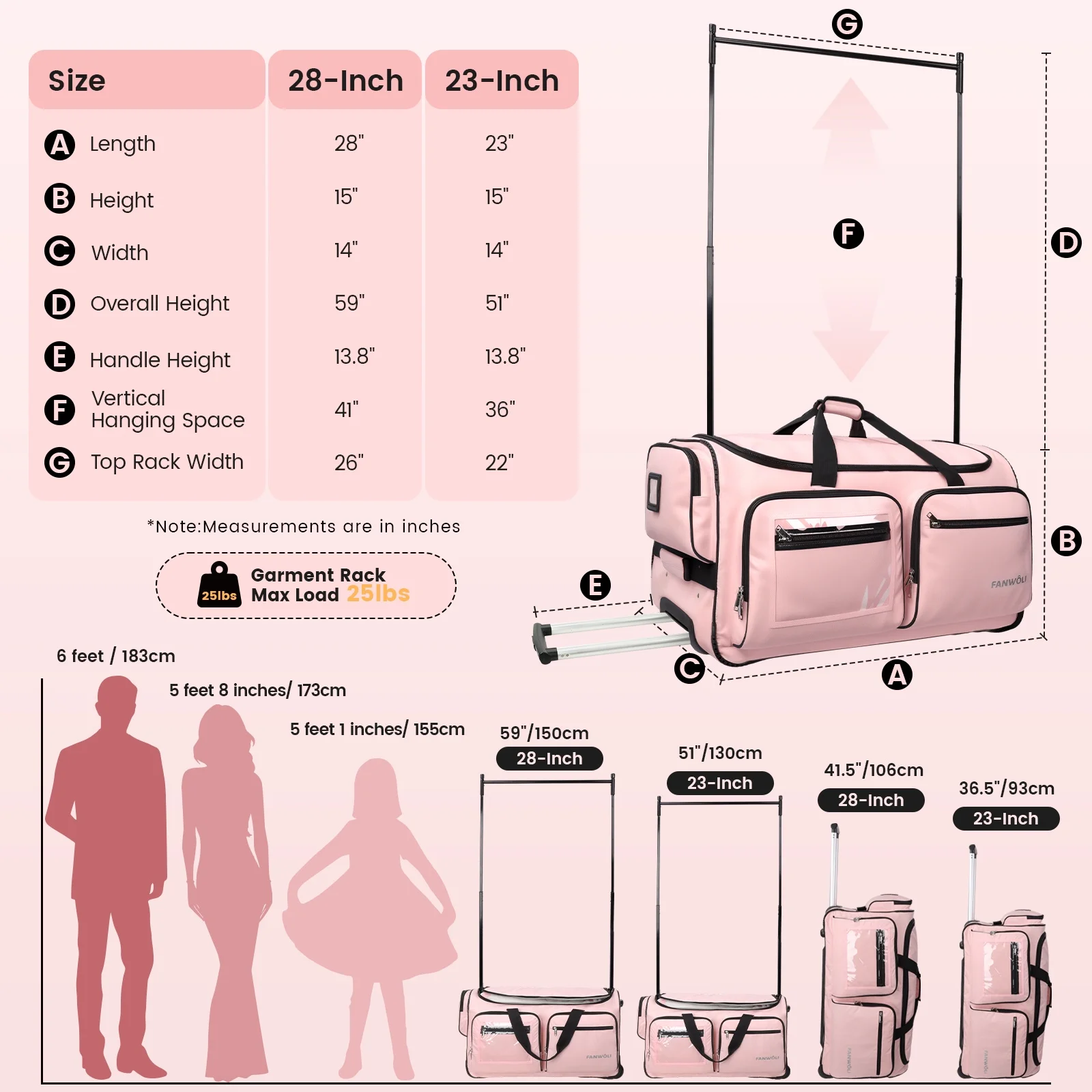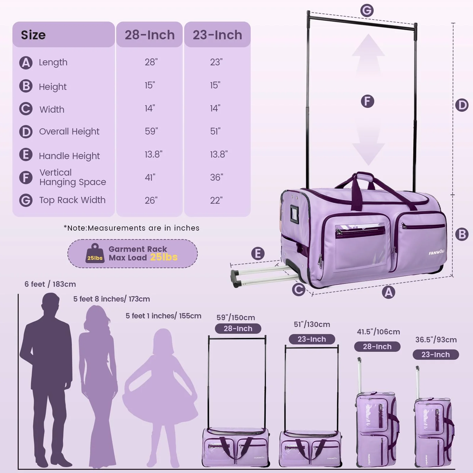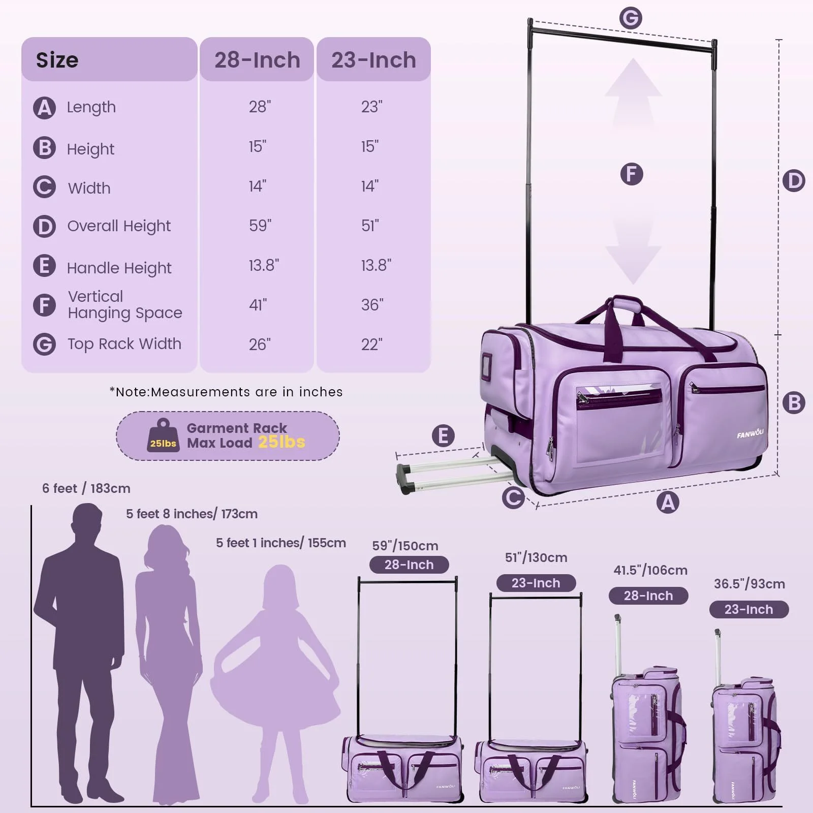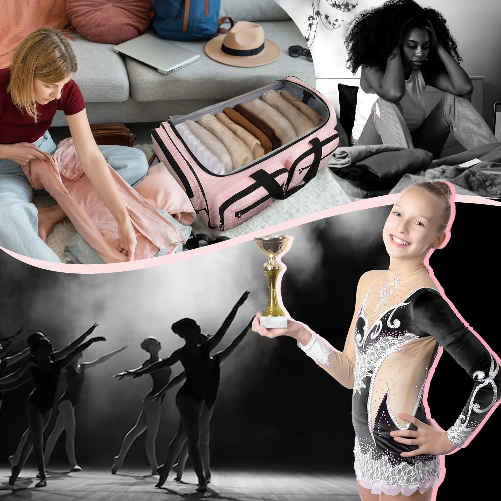 - ��PORTABLE DANCE BAG����Keep all your dance essentials organized in one place with this garment bag for travel. Don't let the hassle of transporting dance gear slow you down. This professional dancer favorite rolling garment bag with Dual-Level aluminum alloy handle and silent wheels makes participating in performances and competitions in one city after another seriously easy. Dancers should focus their time on the stage and their dreams.