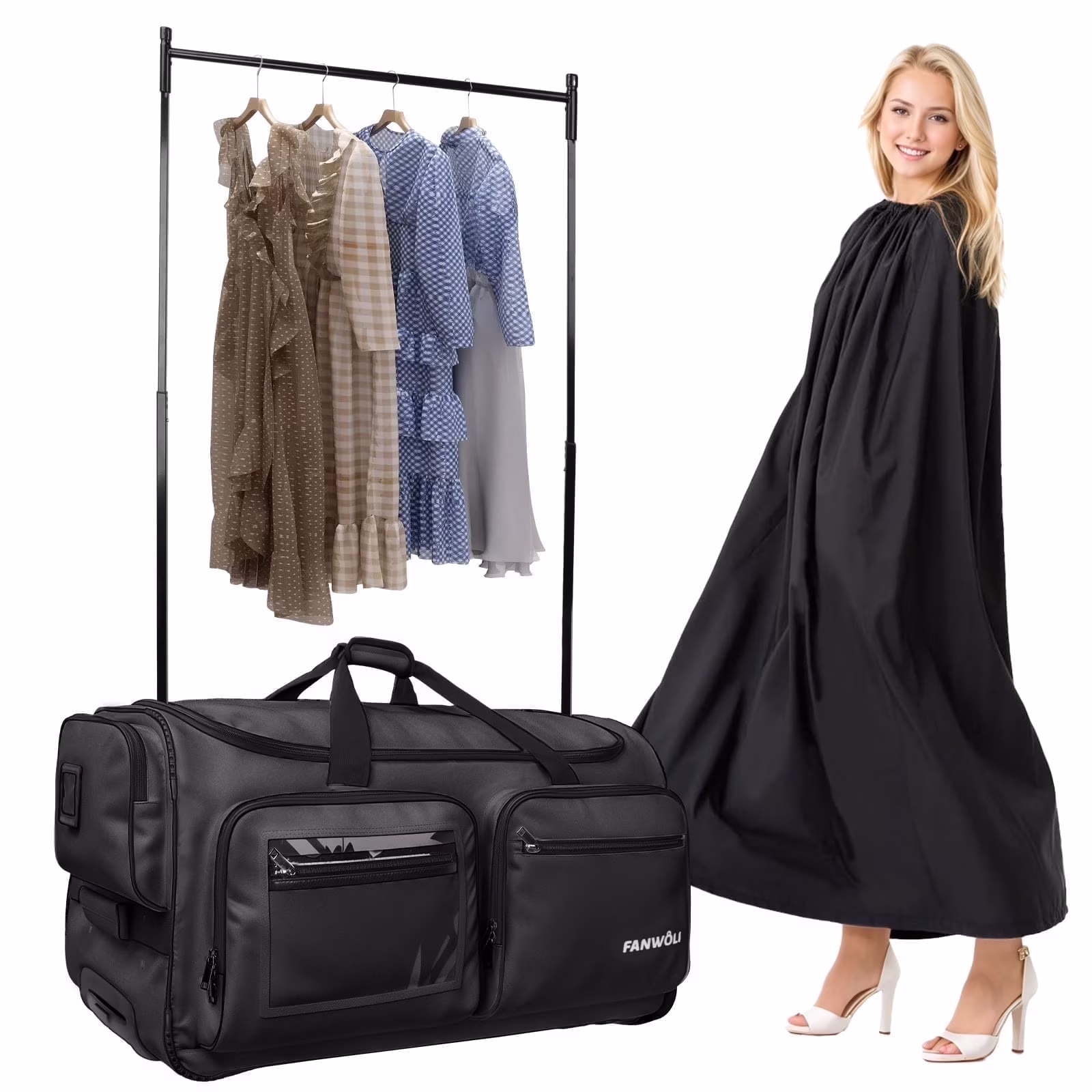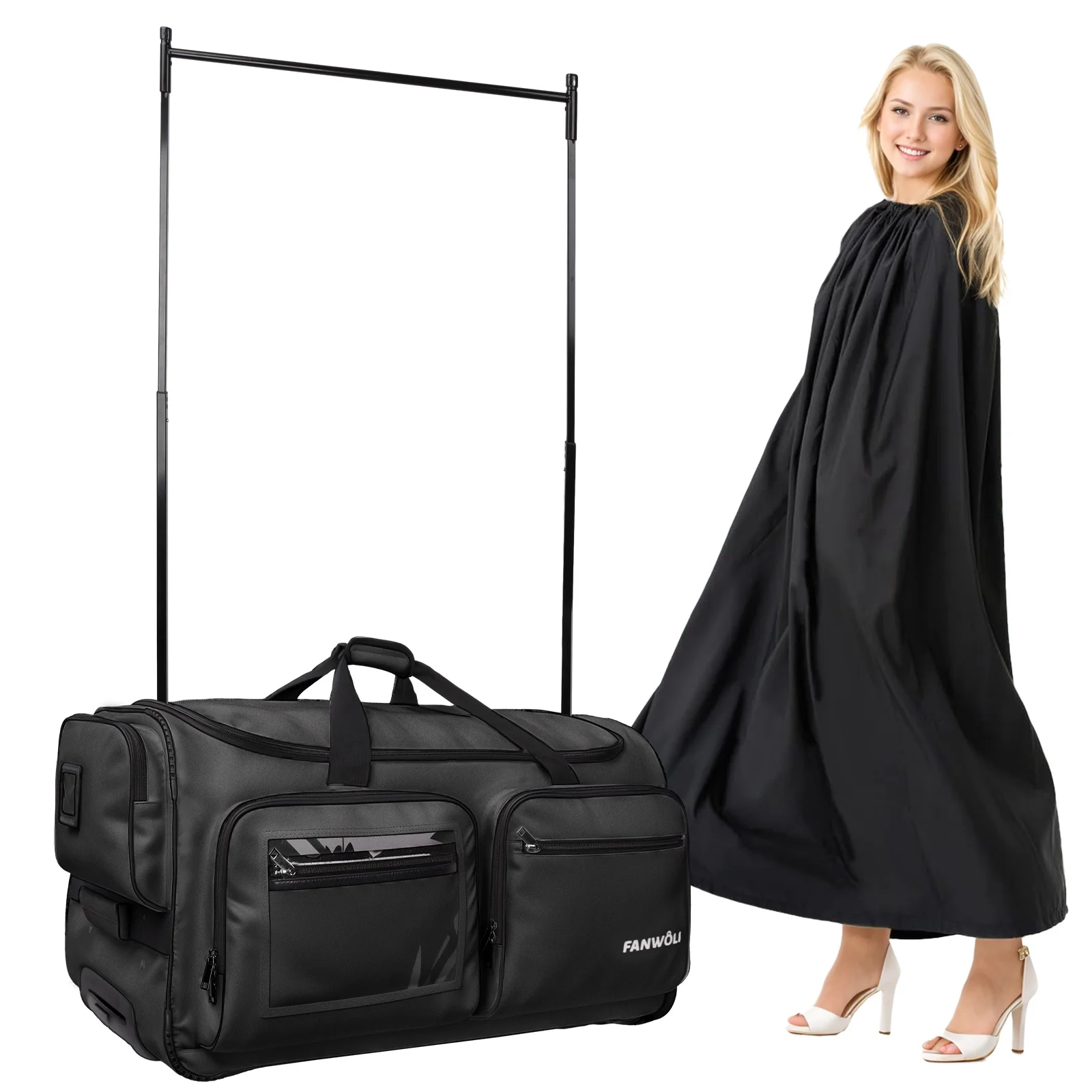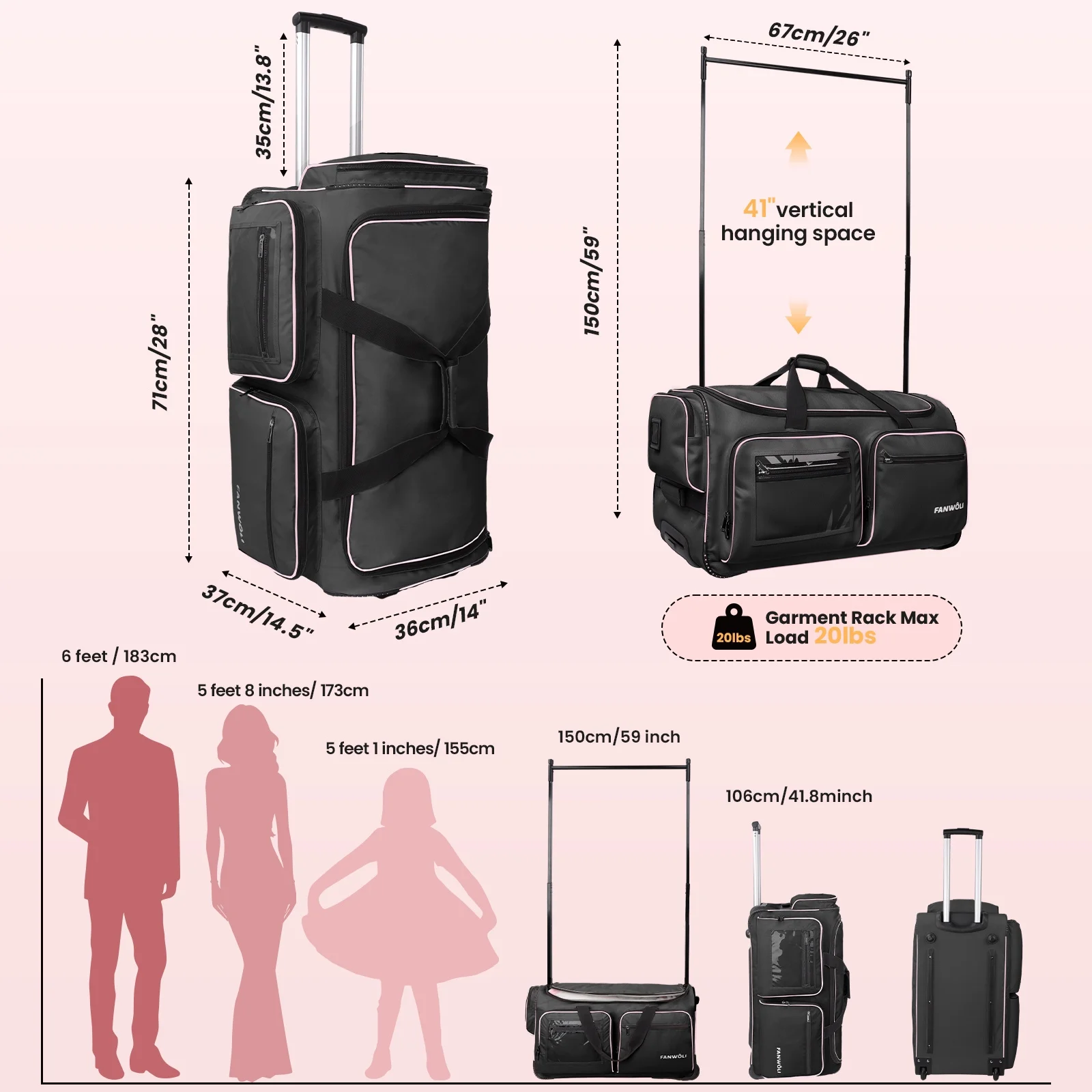 Made from Oxford Cloth Composite PVC, it's more lightweight, durable, and maintains its shape better than Nylon. When not in use, it easily folds to 6 inches and can be stowed in any narrow space. The detachable garment rack can be installed or removed in just a minute, while smooth mute wheels offer a quiet gliding experience, perfect for navigating through crowded venues. It measures 71*37*36cm with the highest bracket reaching 144cm/56.6 inches and can carry up to 10kg. Ideal for dance competitions, concerts, and travel, the bag is made from 300D PVC, with an iron pole and aluminum alloy tie rod.