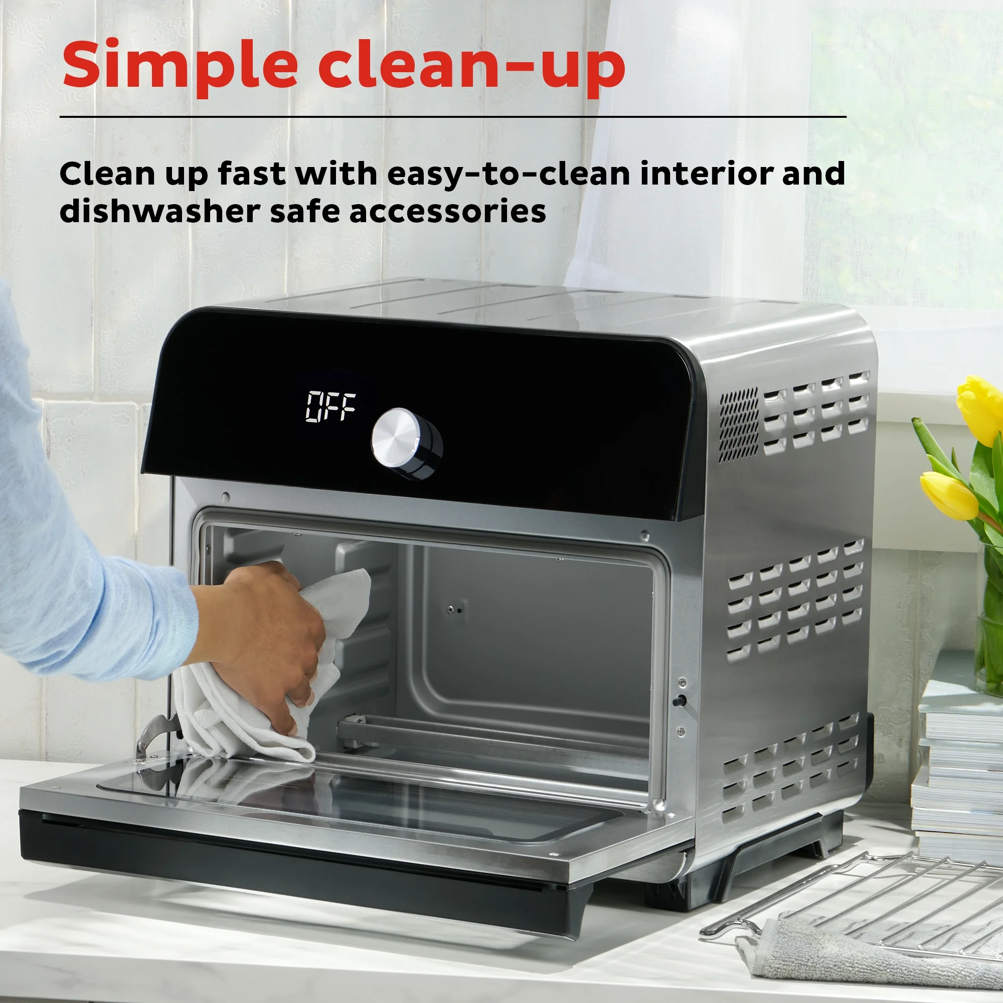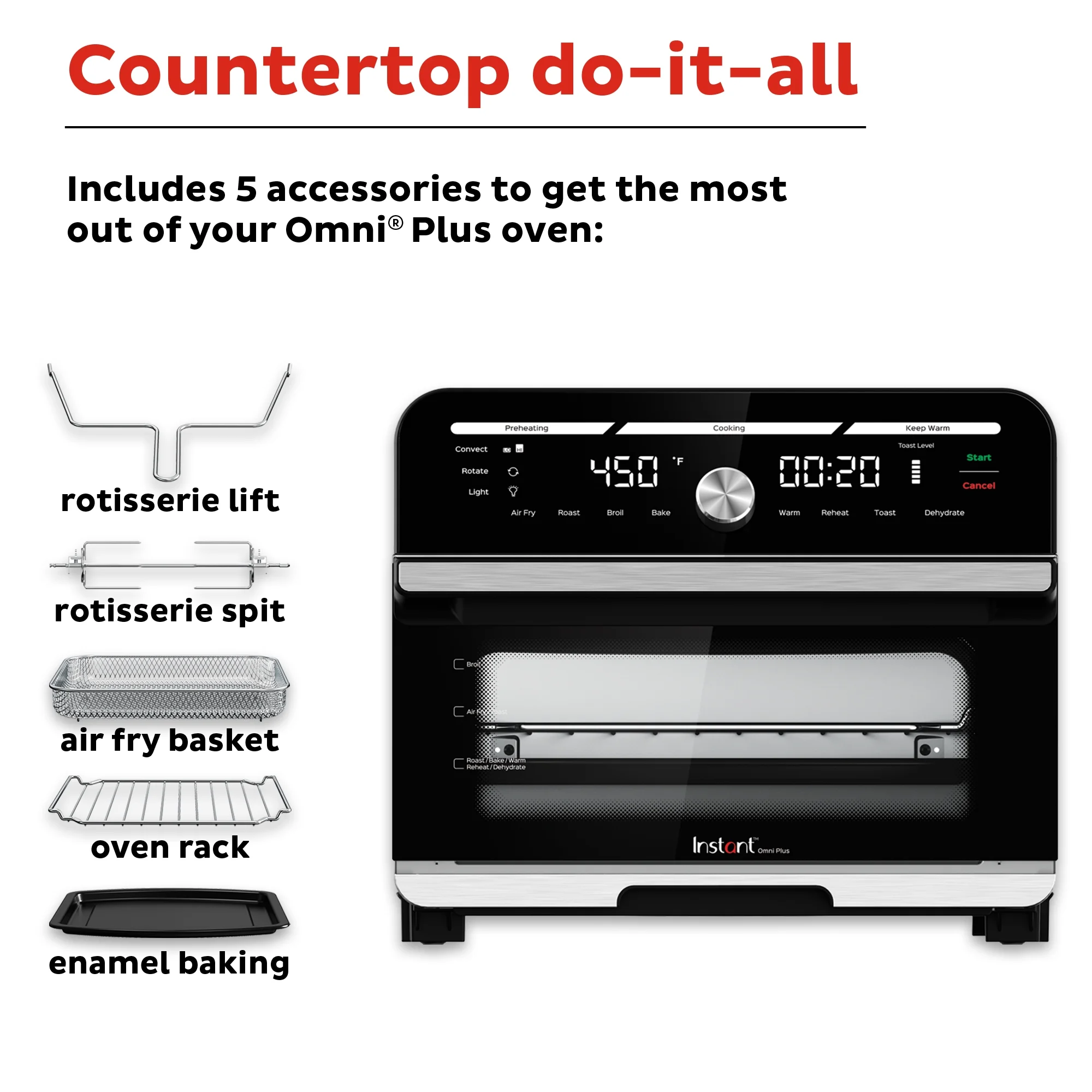 - INCLUDED ACCESSORIES: An enamel baking tray and stainless-steel oven rack, air fry basket, BBQ-style rotisserie spit and forks, and lift tool that are all dishwasher safe