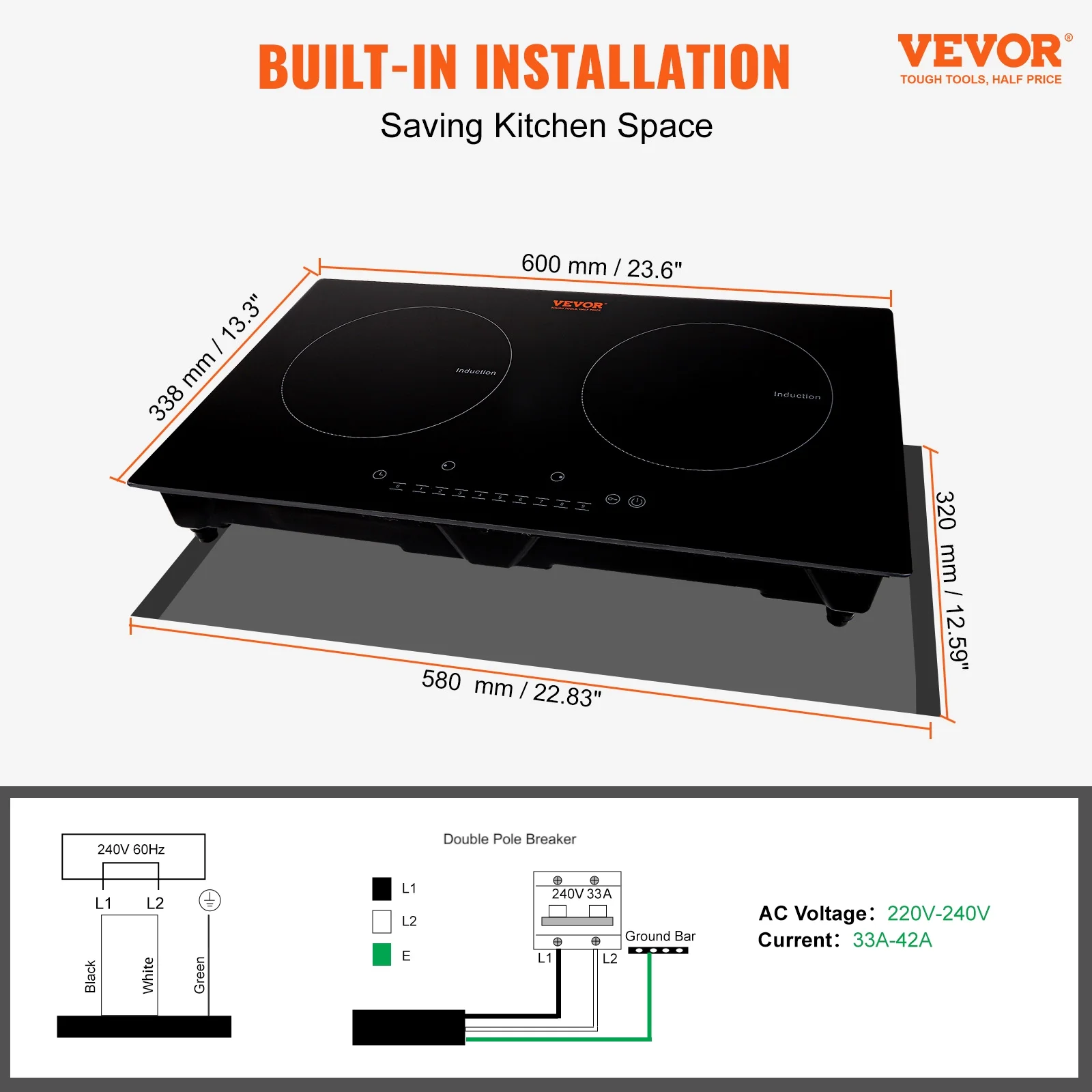 - Embedded Design: The 24-inch induction cooker is designed for built-in installation, saving kitchen space,easy to install. The round edges with no sharp corners design is stylish and secure. It is suitable for voltage ranging from 110-120V, 50/60Hz.