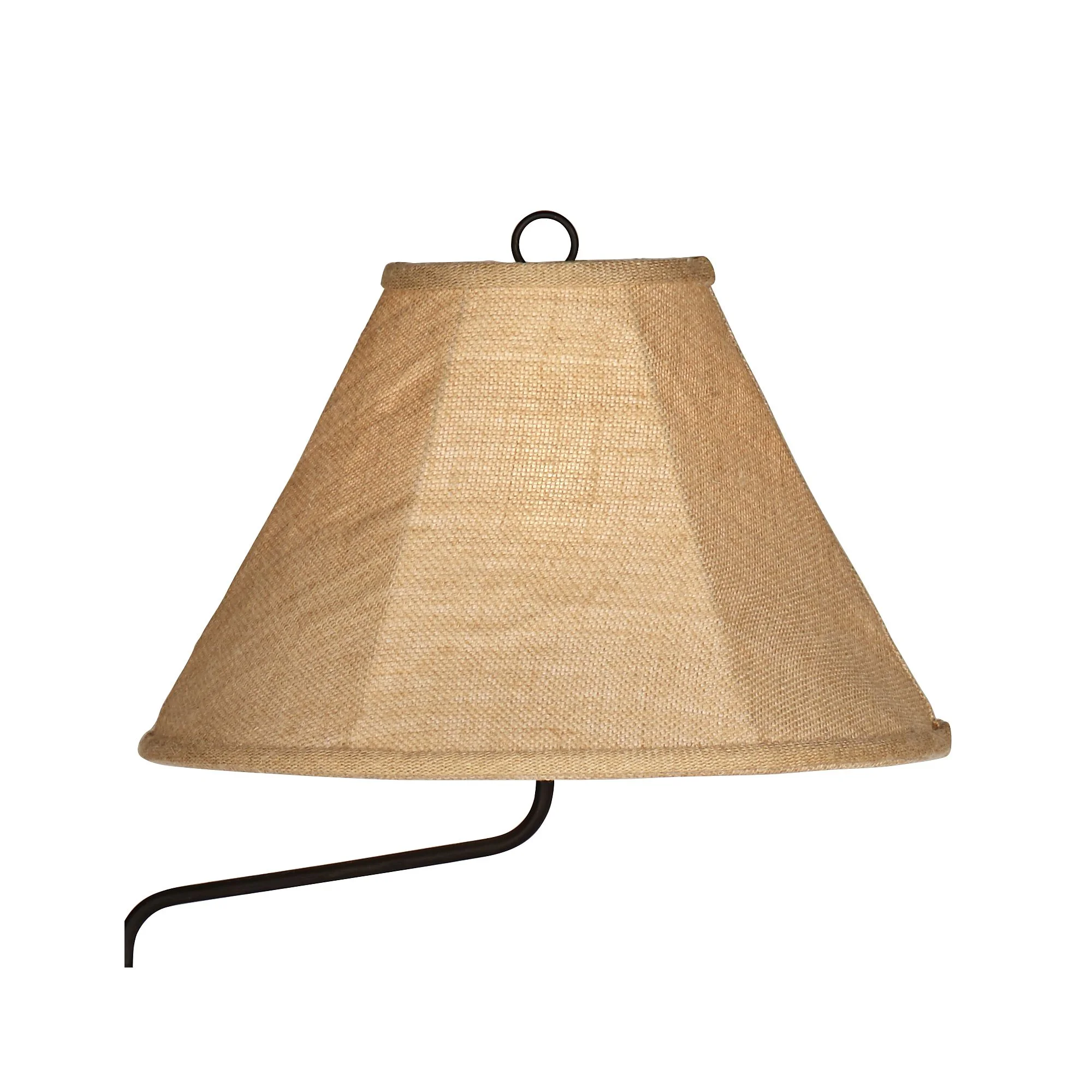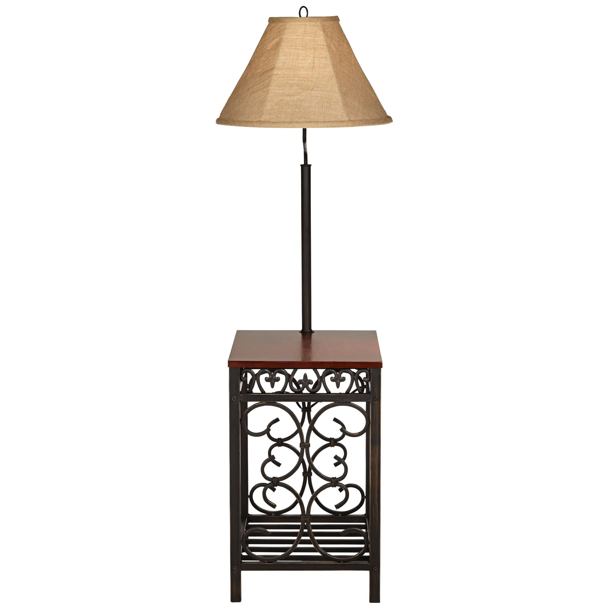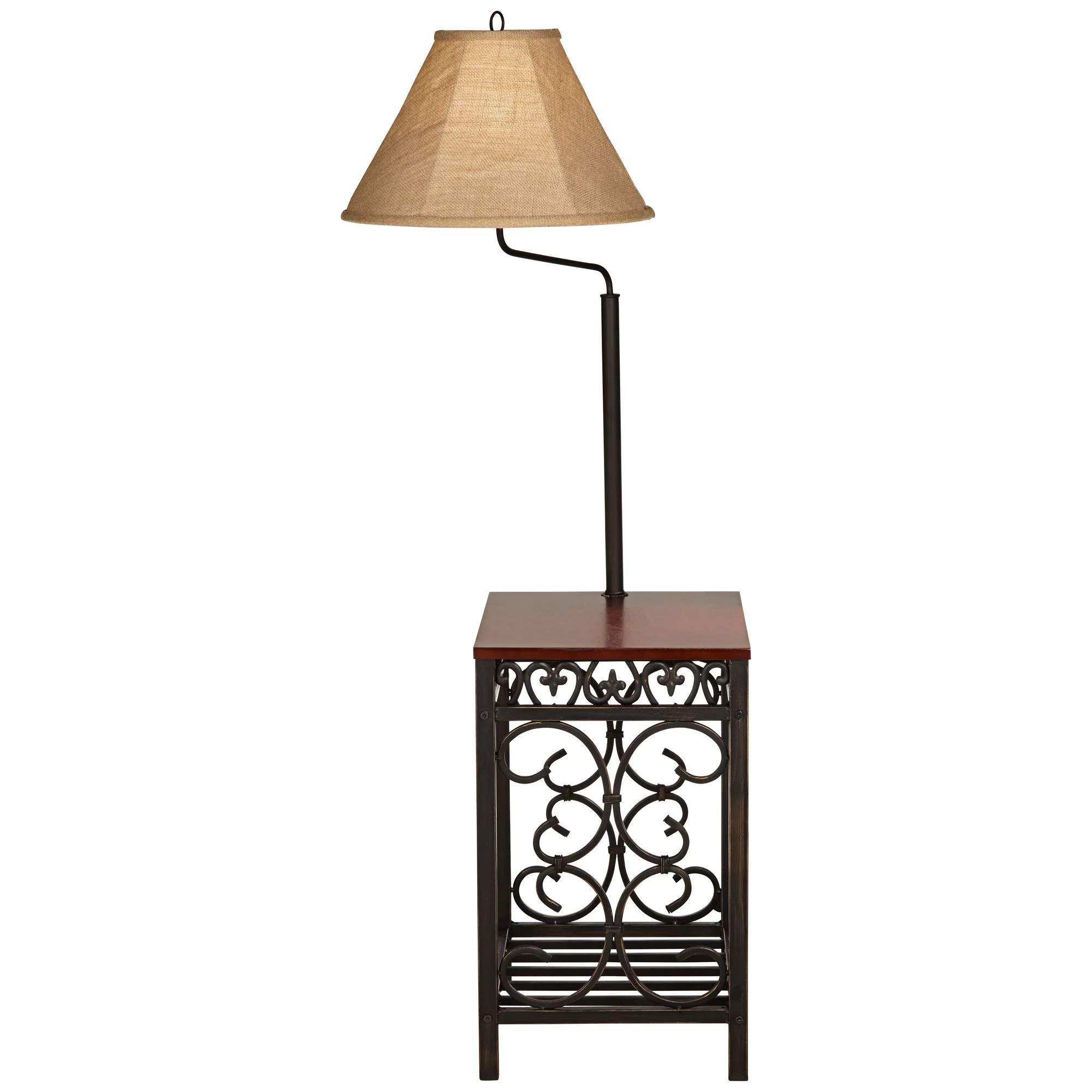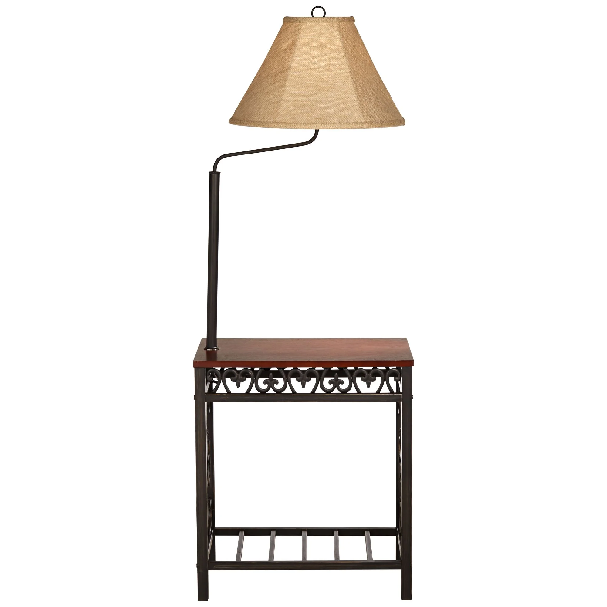 - Cherry finish wood top. Bronze finish metal legs and scrollwork. Bottom shelf for storage. Collapsible burlap fabric shade. 8-foot long cord. Light assembly needed.