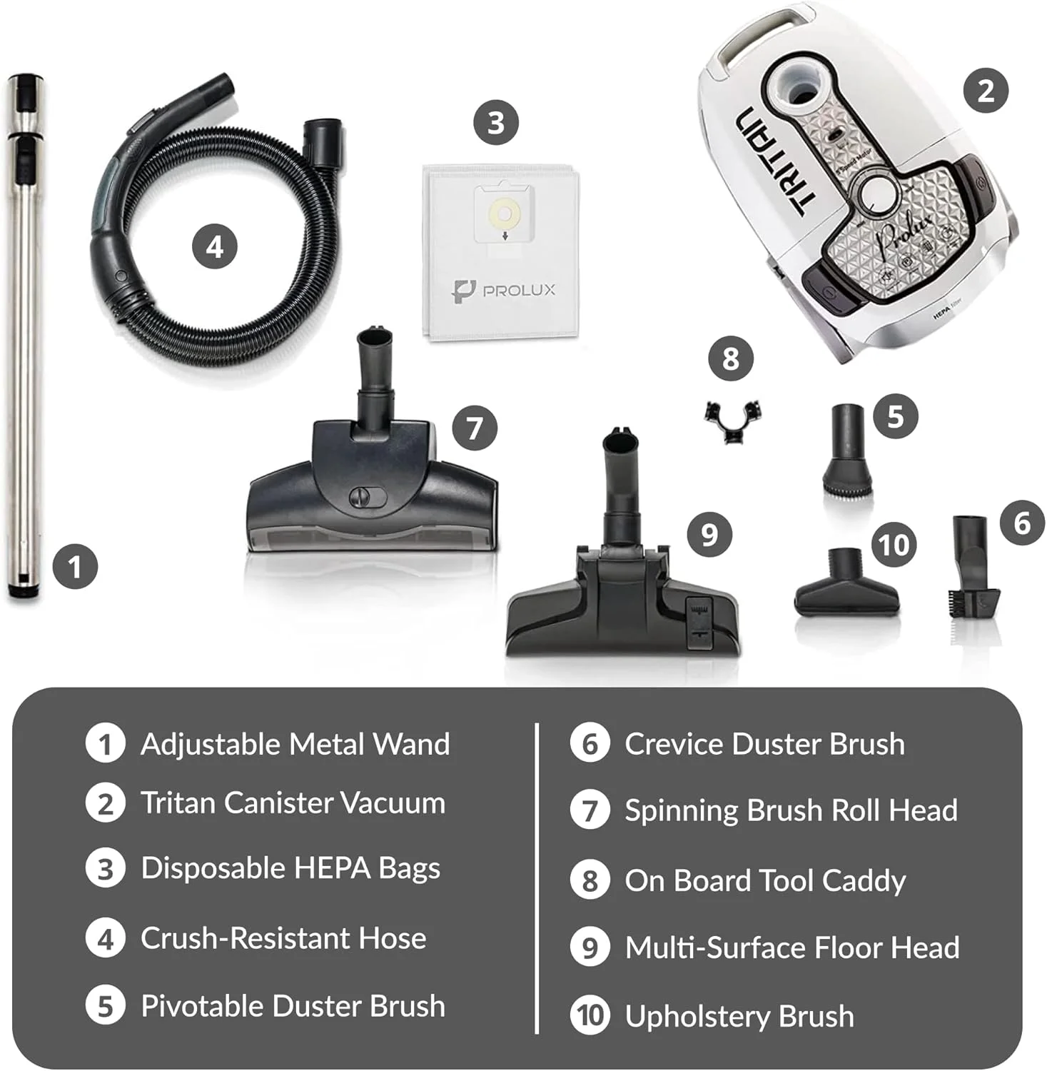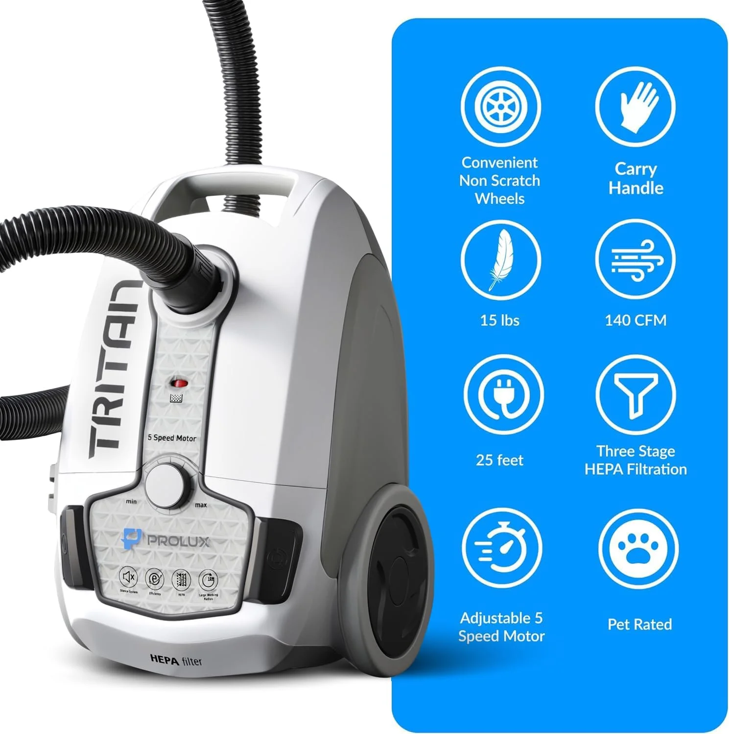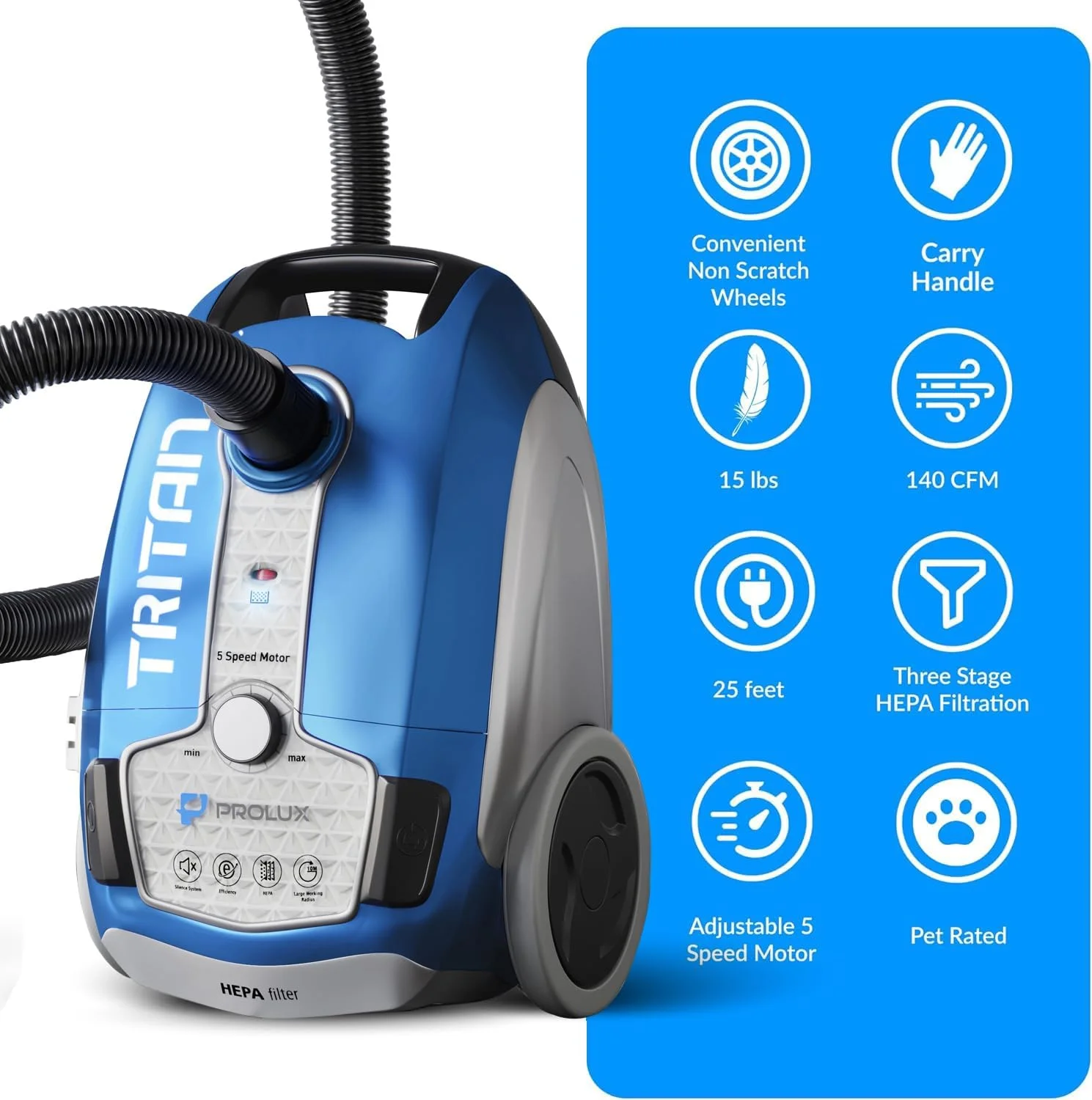 - BIG SUCTION IN A COMPACT BODY - The Prolux Tritan is a powerful deep cleaning vacuum cleaner that is designed to clean carpet, rugs, hardwood floors, tile, and more! With its onboard tools, rubber wheels that will protect your floors, and self-retracting cord it's incredibly simple and easy to use!