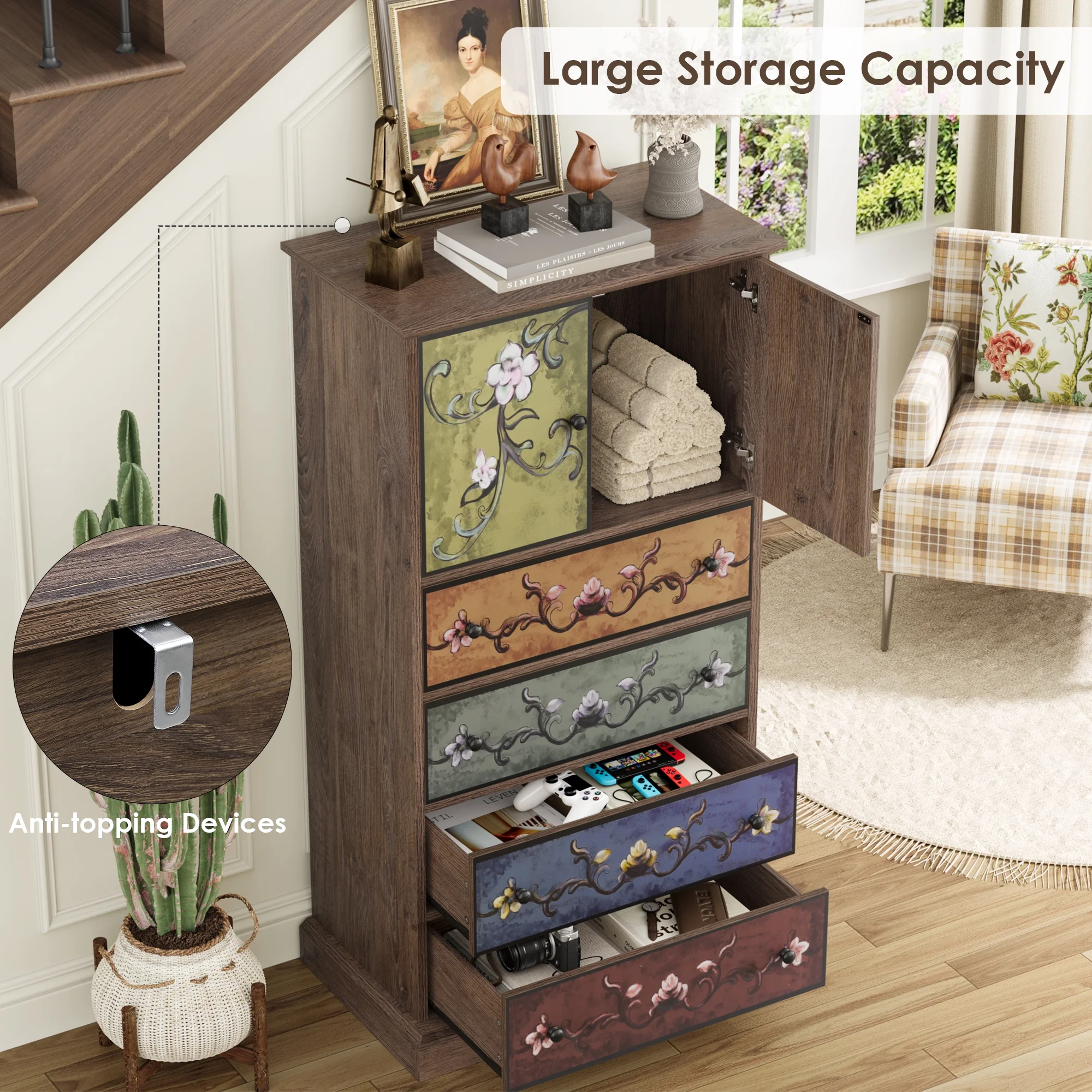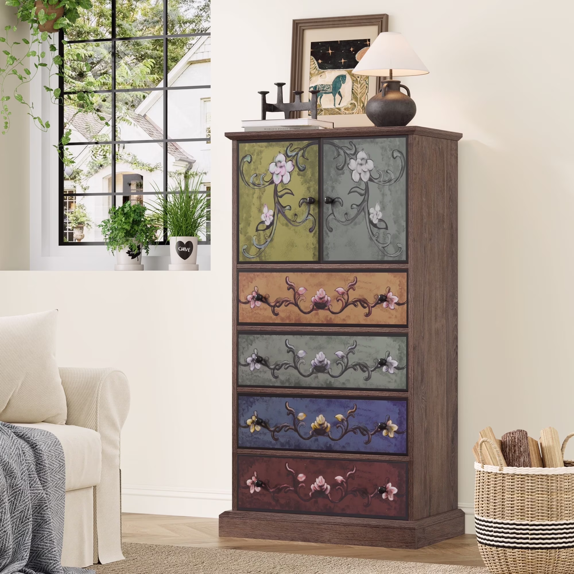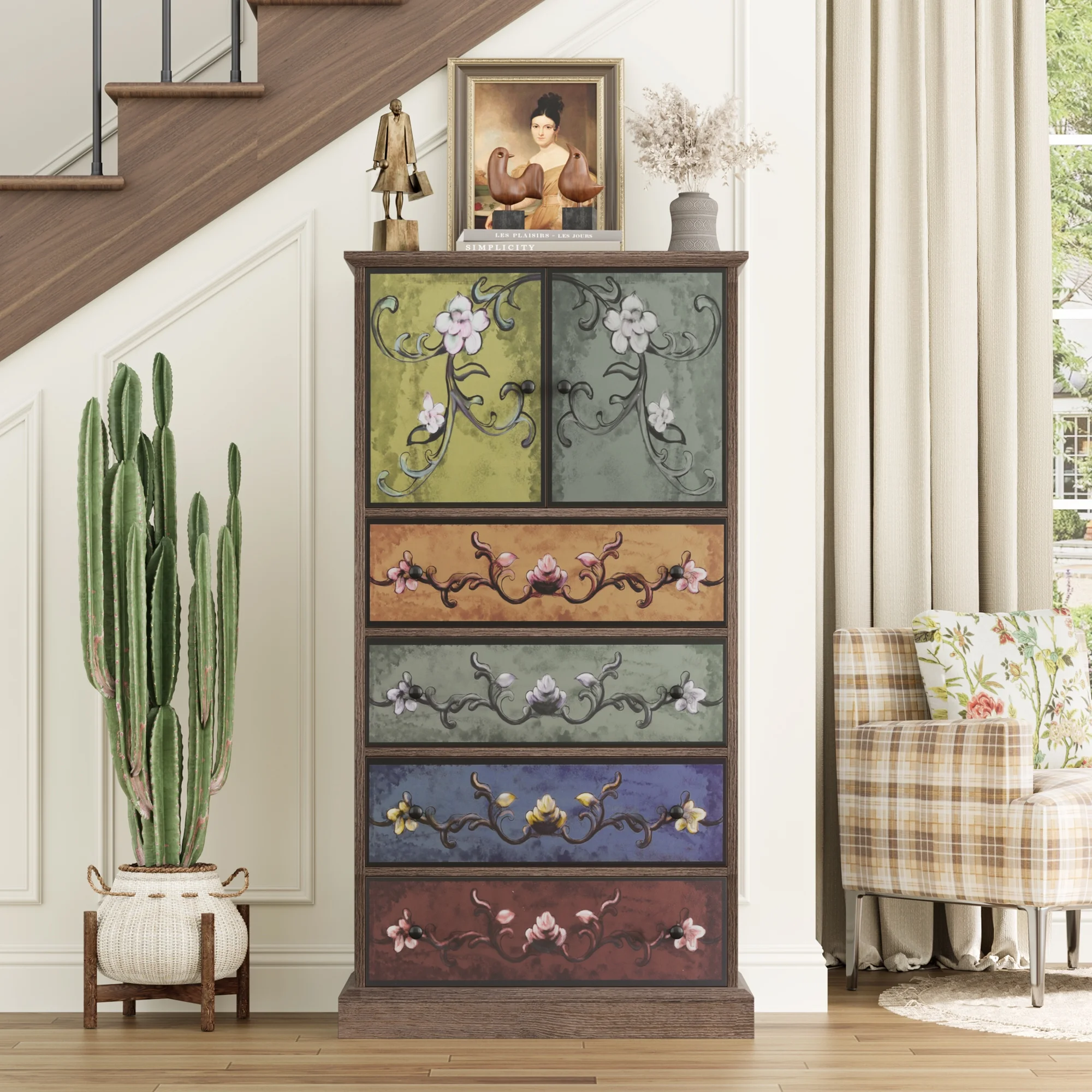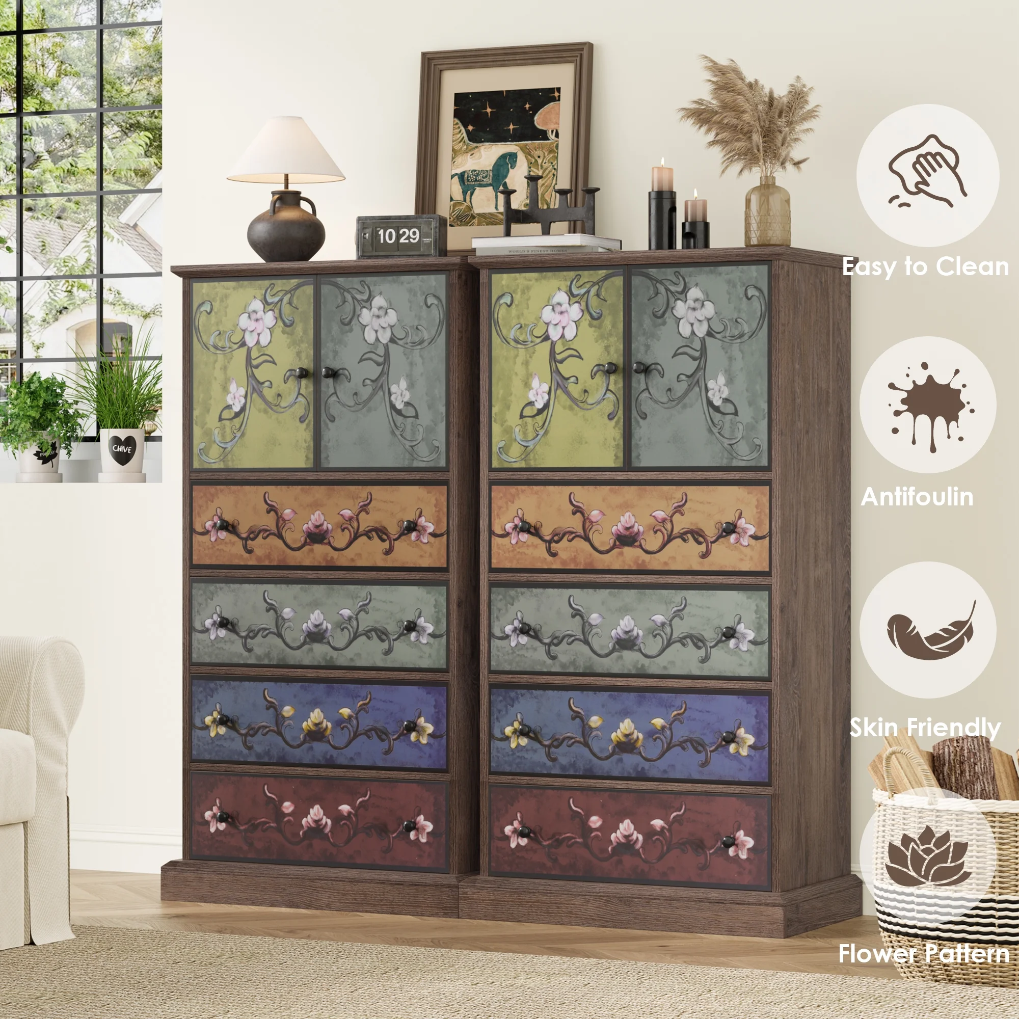 - Multipurpose Dresser: This flower-painting dresser can play your perfect storage assistant in your entryway, living room, dining room, etc. And the special and lifelike appearance design matches well with your distinctive decoration style.