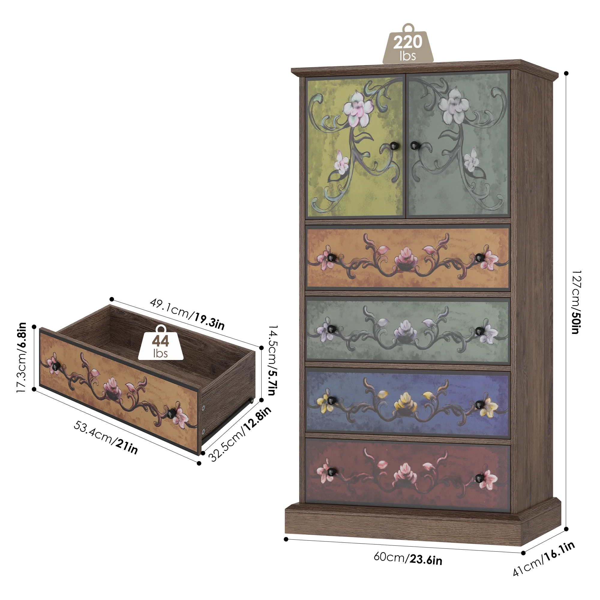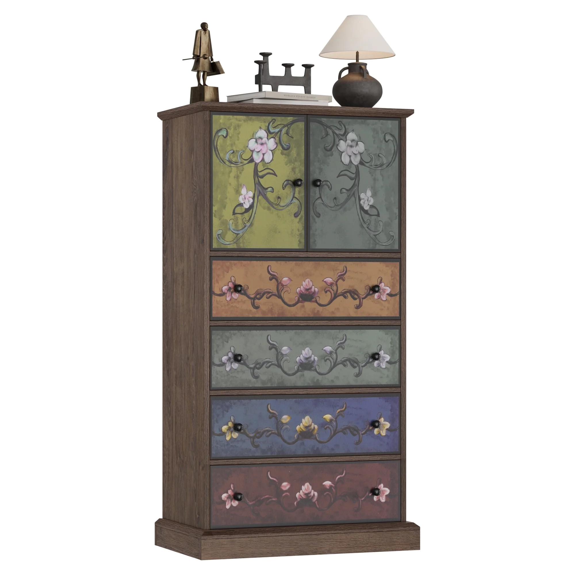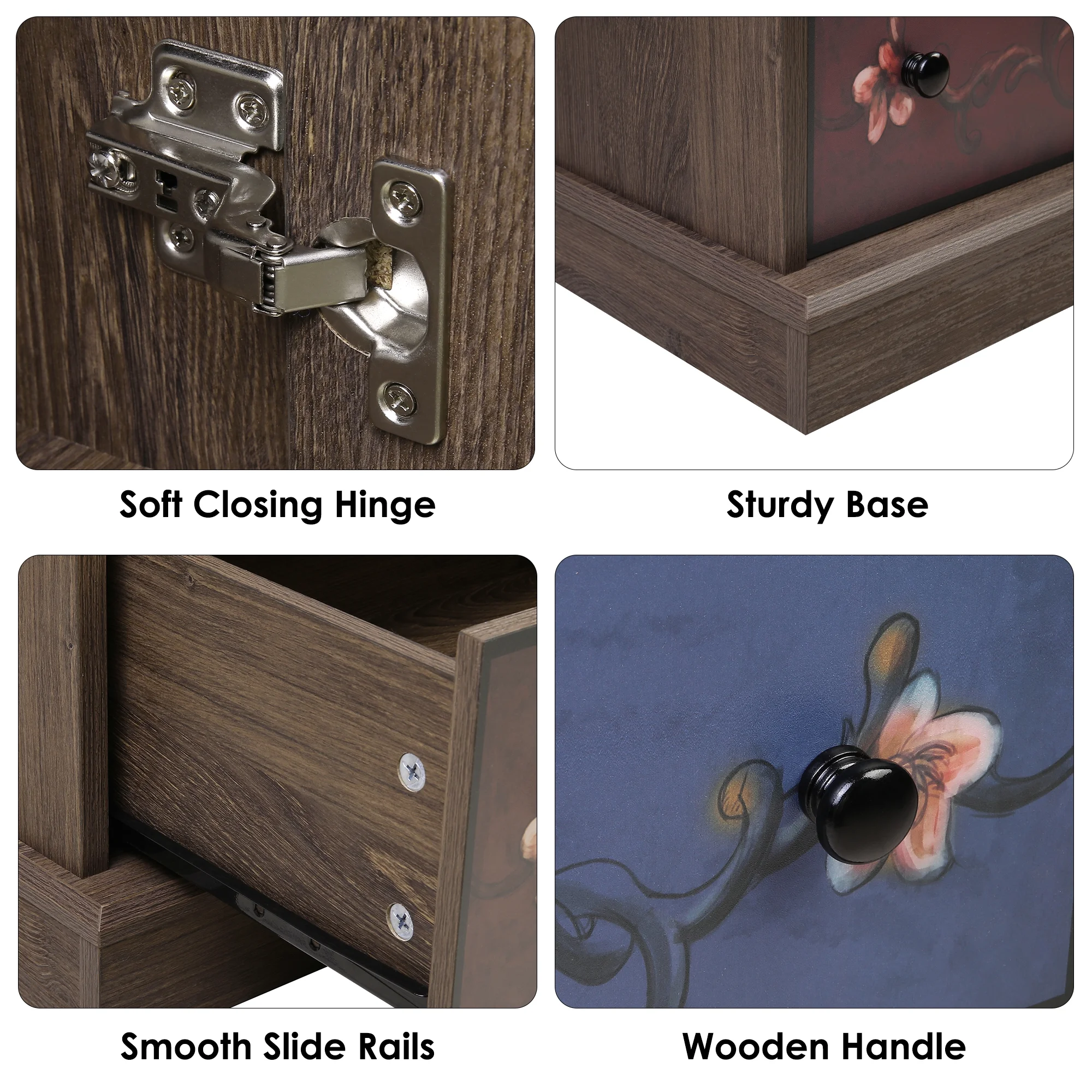 - Retro Flower Pattern Drawers: The striking wood grain finish elevates this dresser's texture and visual appeal. Its unique, stylish printed design adds personalized charm to your home. Vintage black knobs adorn drawer panels, reflecting meticulous craftsmanship. With abundant storage, the cabinet blends subtle charm and elegance, enhancing living spaces with functionality and aesthetic appeal.