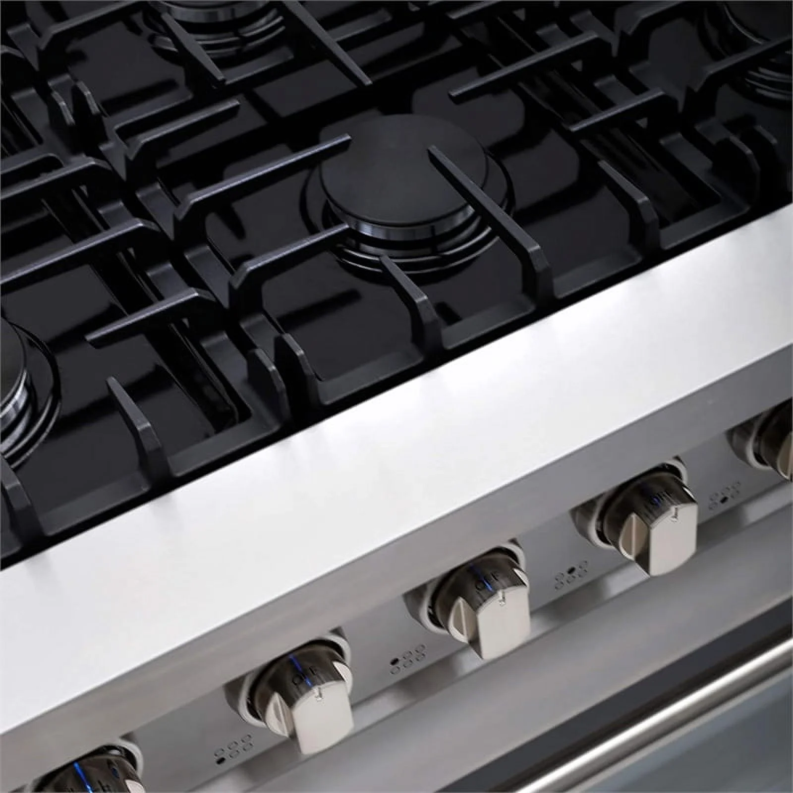 - Black porcelain cooktop comes equipped with variable-power burners including (2) 18,000 BTU power burners, (2)12,000 BTU rapid burner, and (2) 9,000 BTU semi-rapid burners