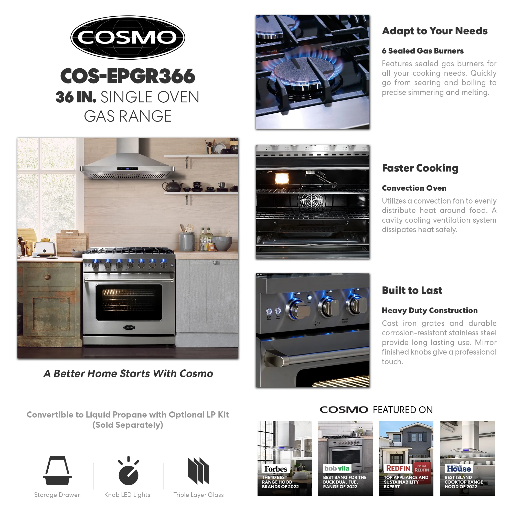 - Liquid propane convertible (Conversion kit sold separately)