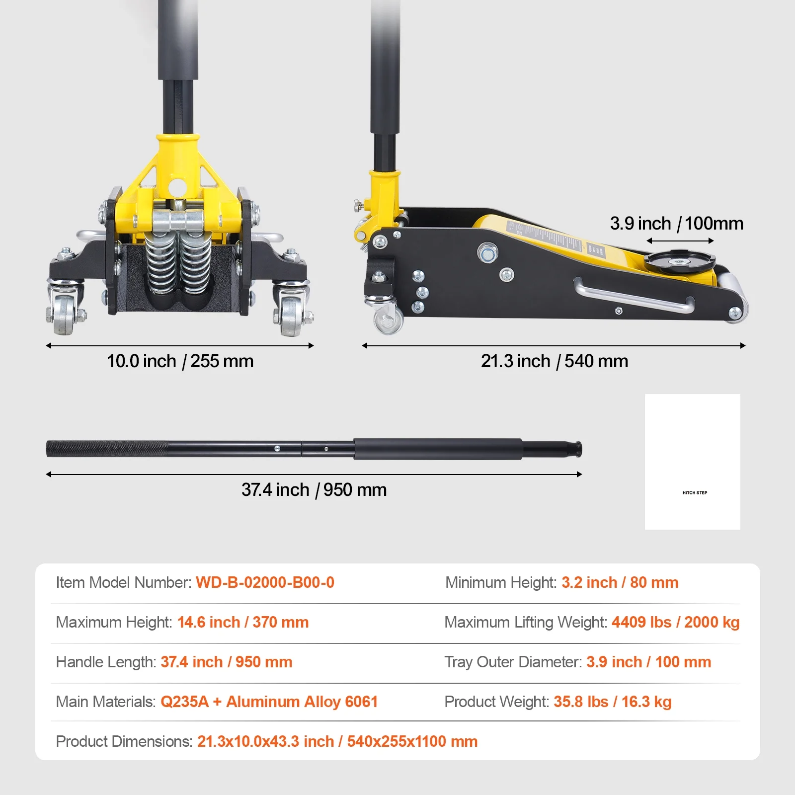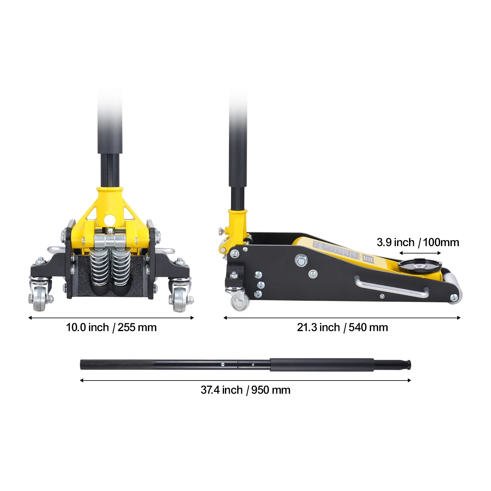 - Low Lifting Height: With a minimum height of 3.2 inches / 80 mm and a maximum height of 14.6 inches / 370 mm, this floor jack is designed to slide under lower vehicles easily. Provides enough clearance to lift the vehicle off the ground. Lowering the vehicle is as simple as rotating the jack handle counterclockwise.