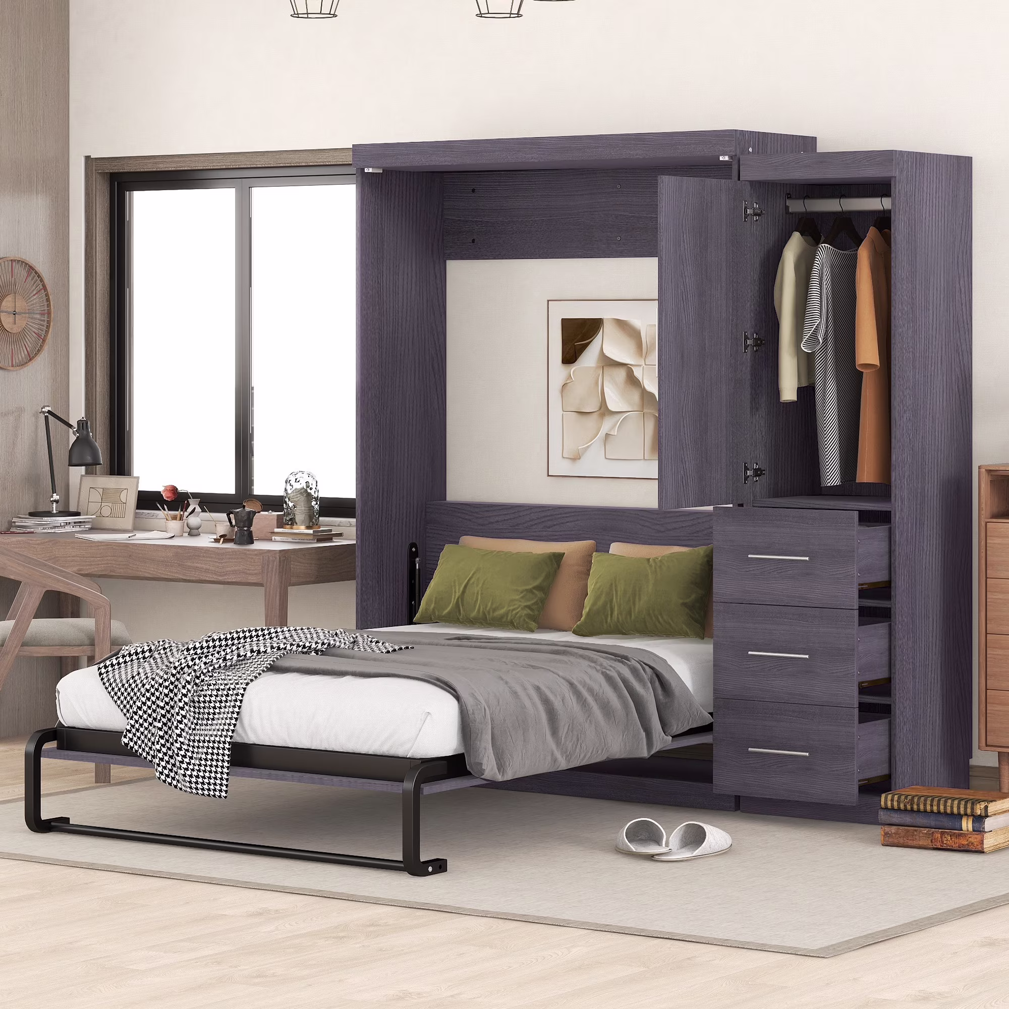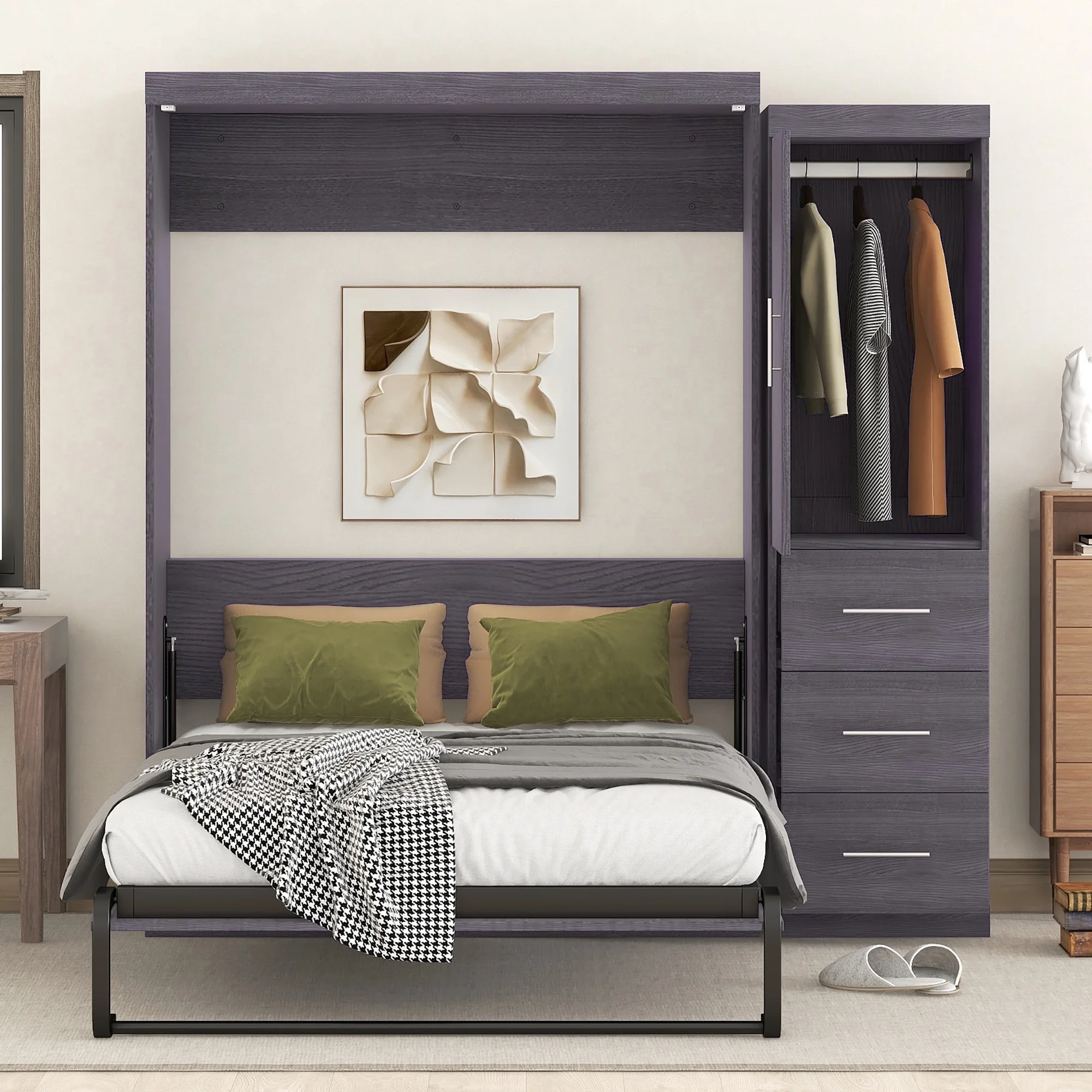- [Space-Saving Murphy Bed]: If you want to save more space for your bedroom or guests room, this wall bed is what you want. Murphy bed can be easily turned to a full size platform bed or a storage cabinet when you fold it.
