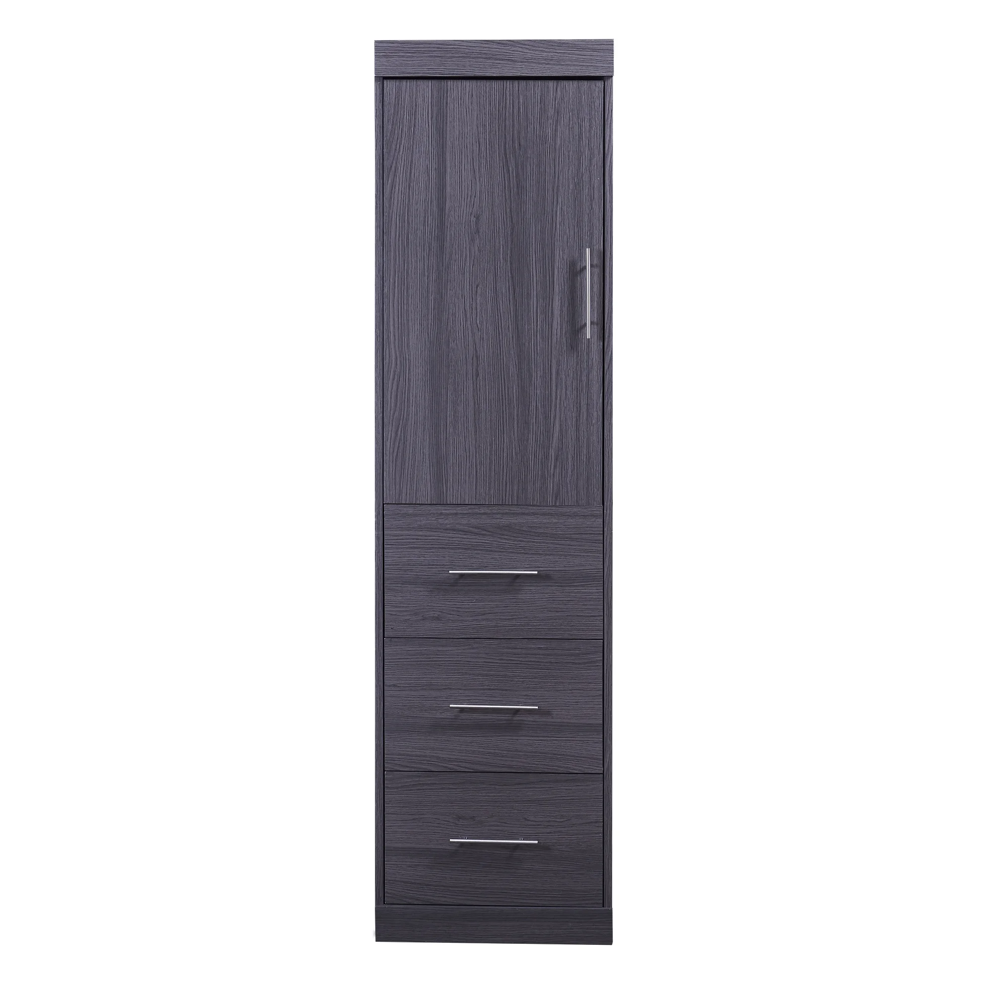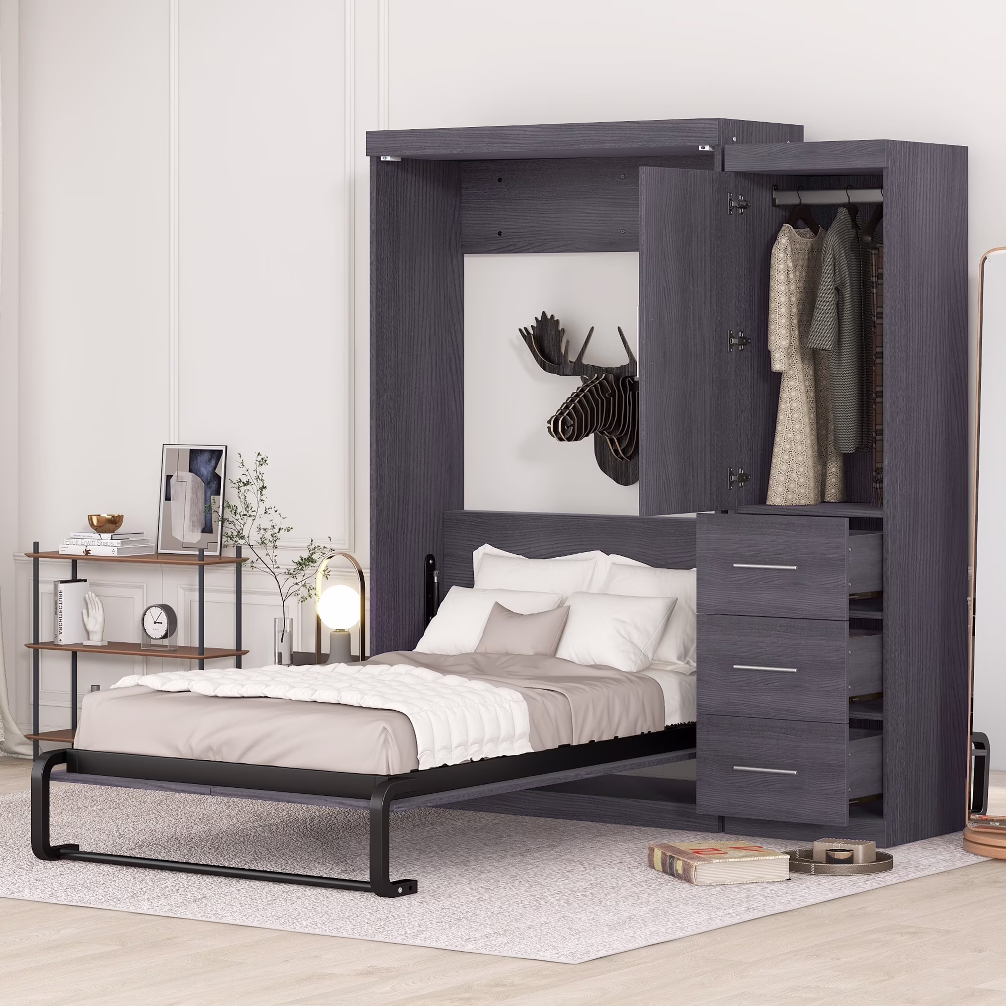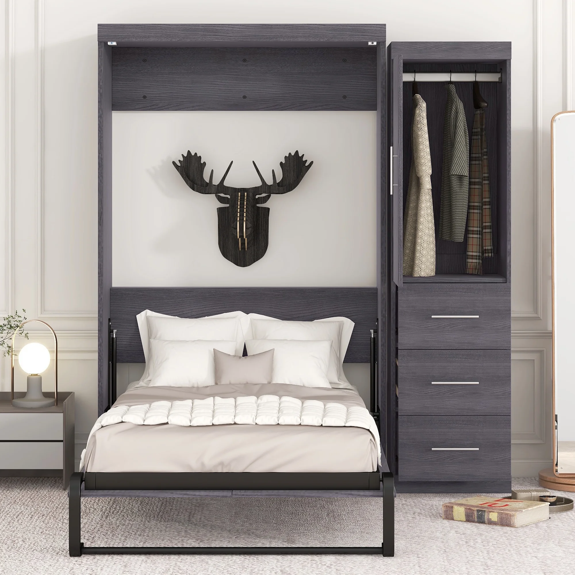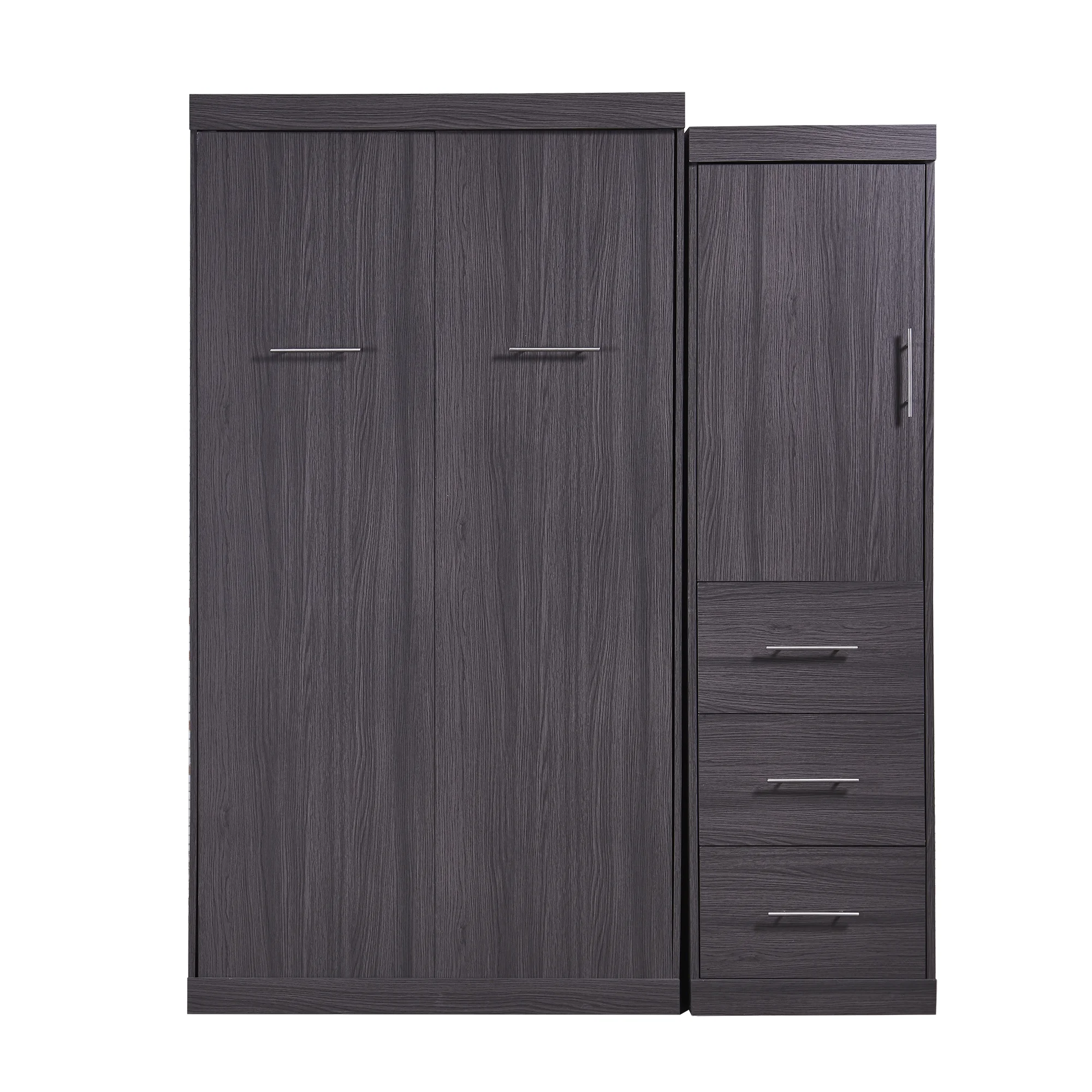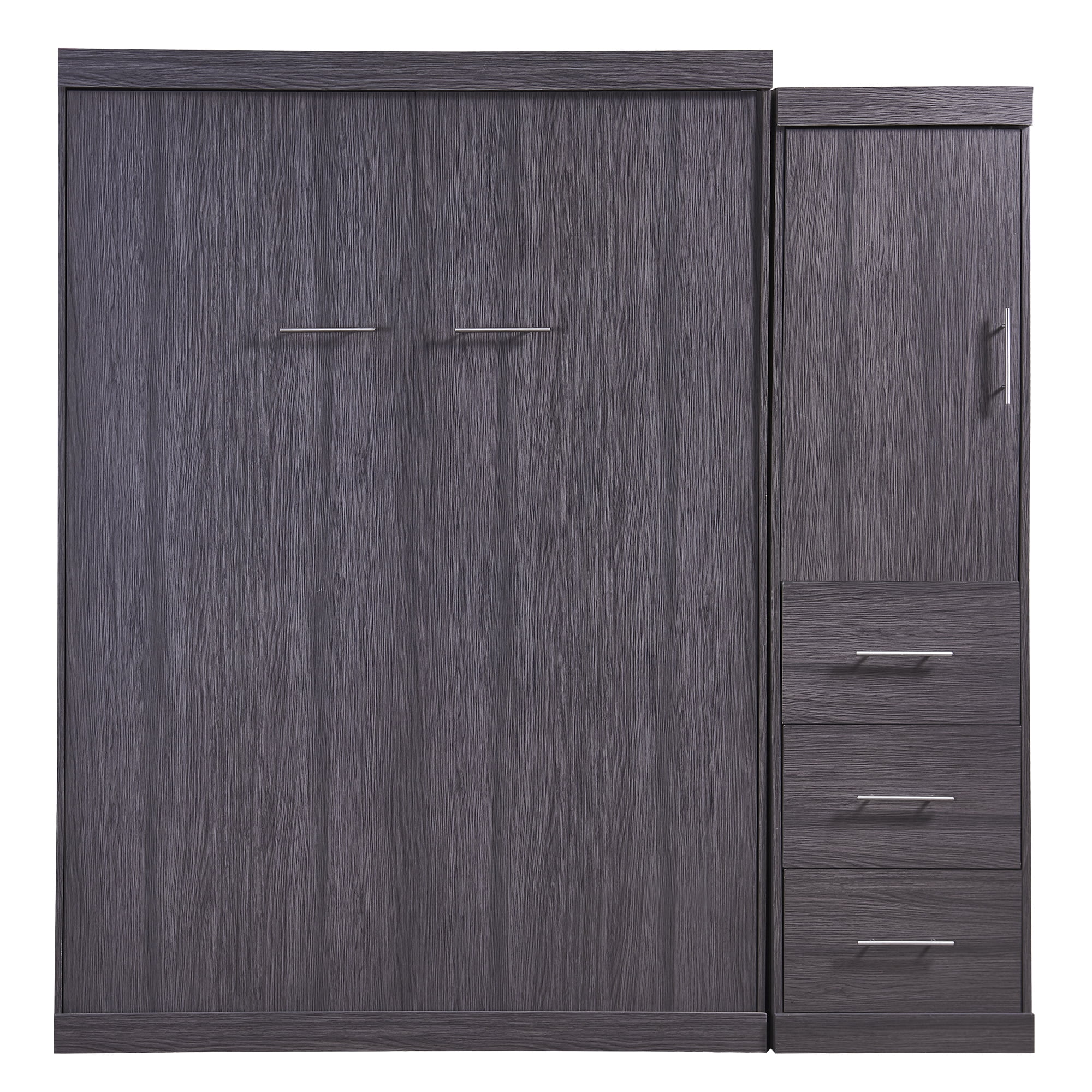 Euroco Wood Full Size Murphy Wall Bed with Wardrobe and Drawers for Living Room, Moveable Wardrobe and Drawers, Space - Saving & Easy Open and Close for Kids Teens Adults, Gray