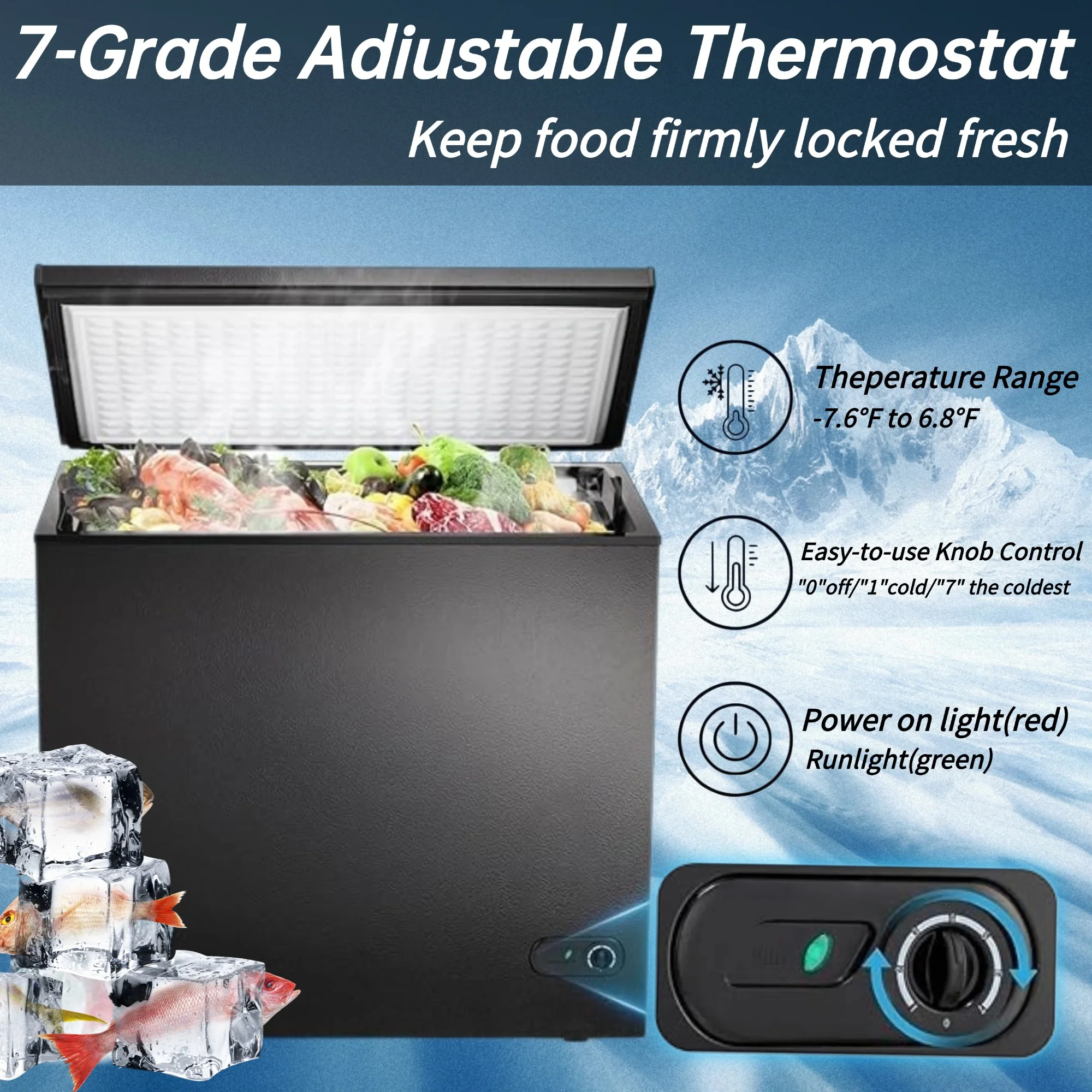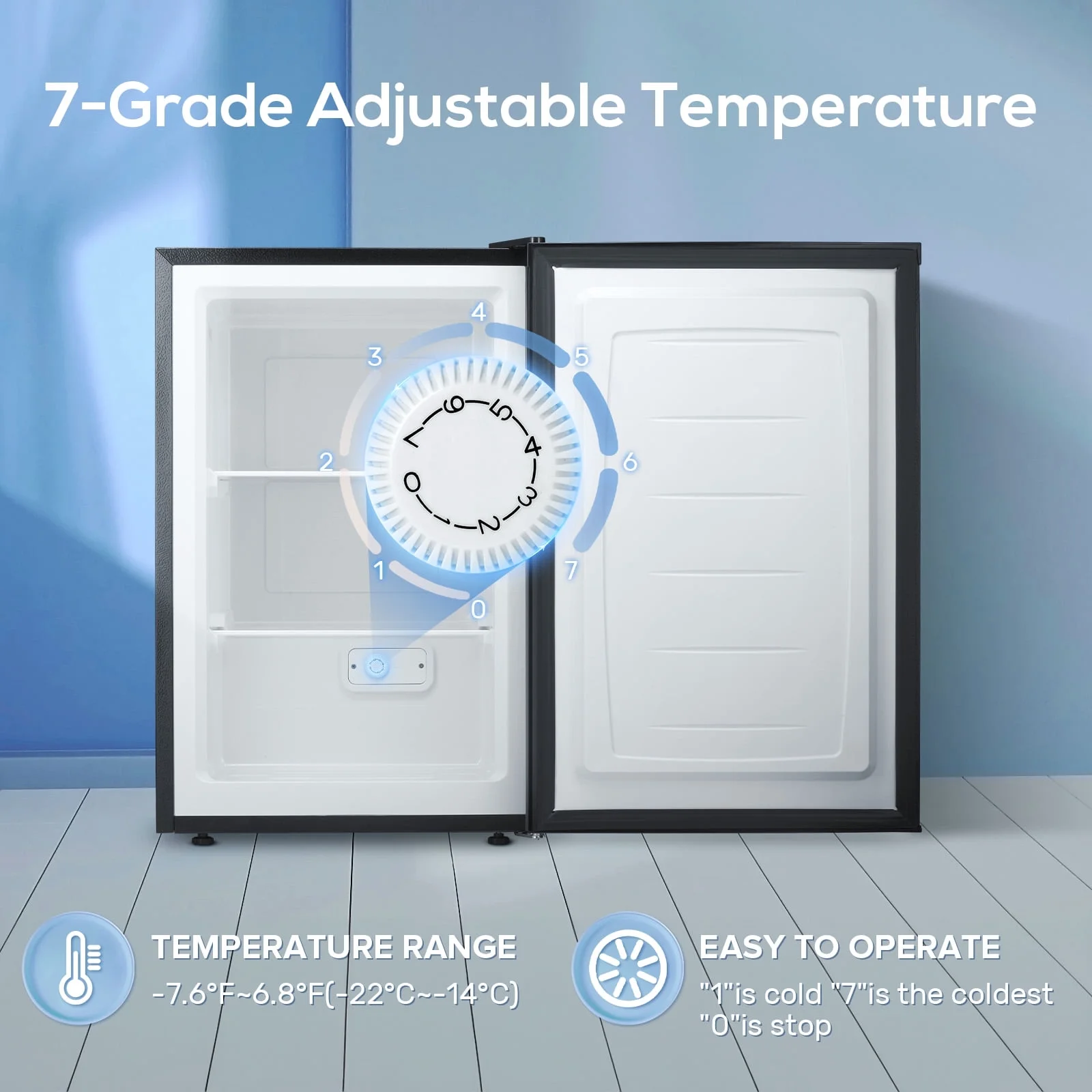 - Featuring -7.6�H~6.8�H adjustable cooling through numbered dial control (1=mild/7=deep freeze). The intuitive green operation light confirms optimal performance whether preserving vaccines, aging premium steaks, or making ice cream.
