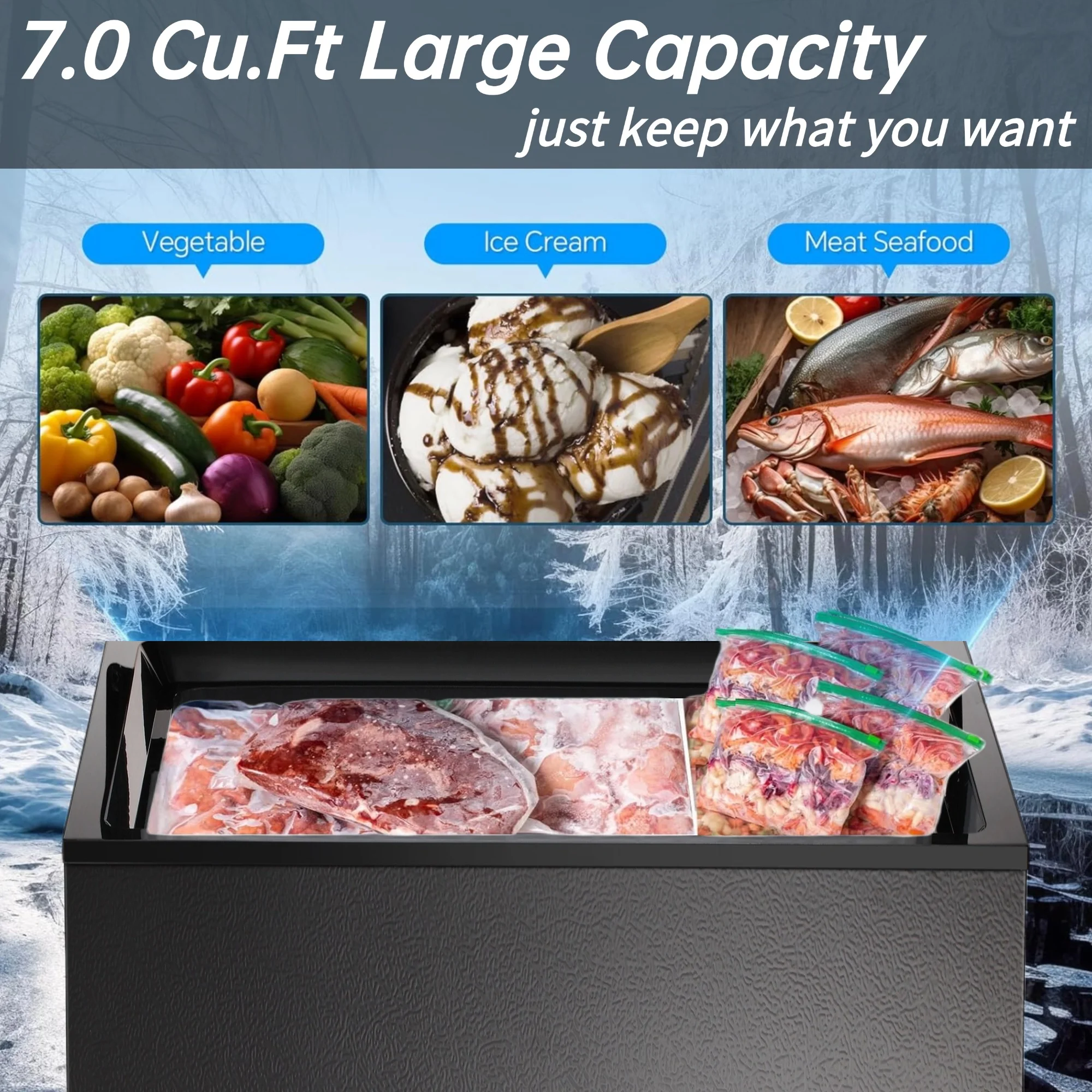 LHRIVER 7.0 Cu. Ft. Chest Deep Freezer with Adjustable Temperature, Free Standing Top Open Door Compact Freezer with 3 Removable Basket for Kitchen, Home, Bar, Garage, Office